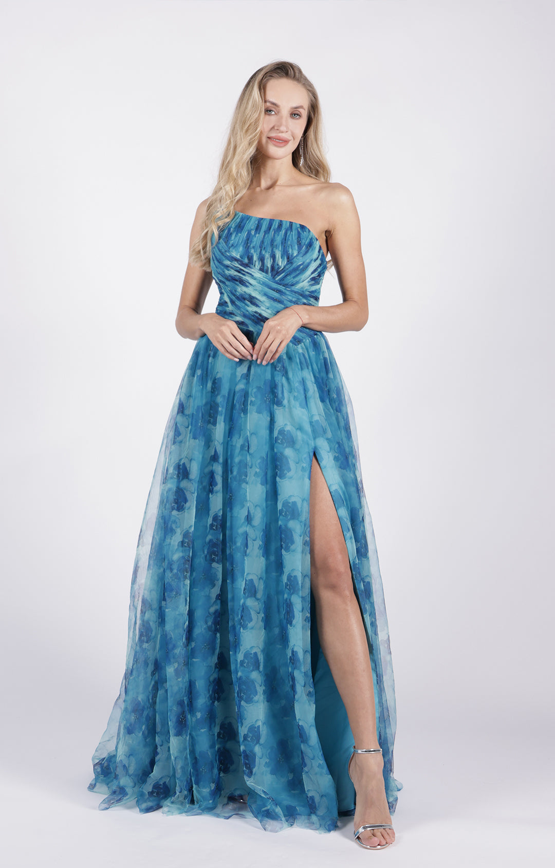 Strapless A-Line Pleats High Split Floral Printed Mesh Maxi Dress