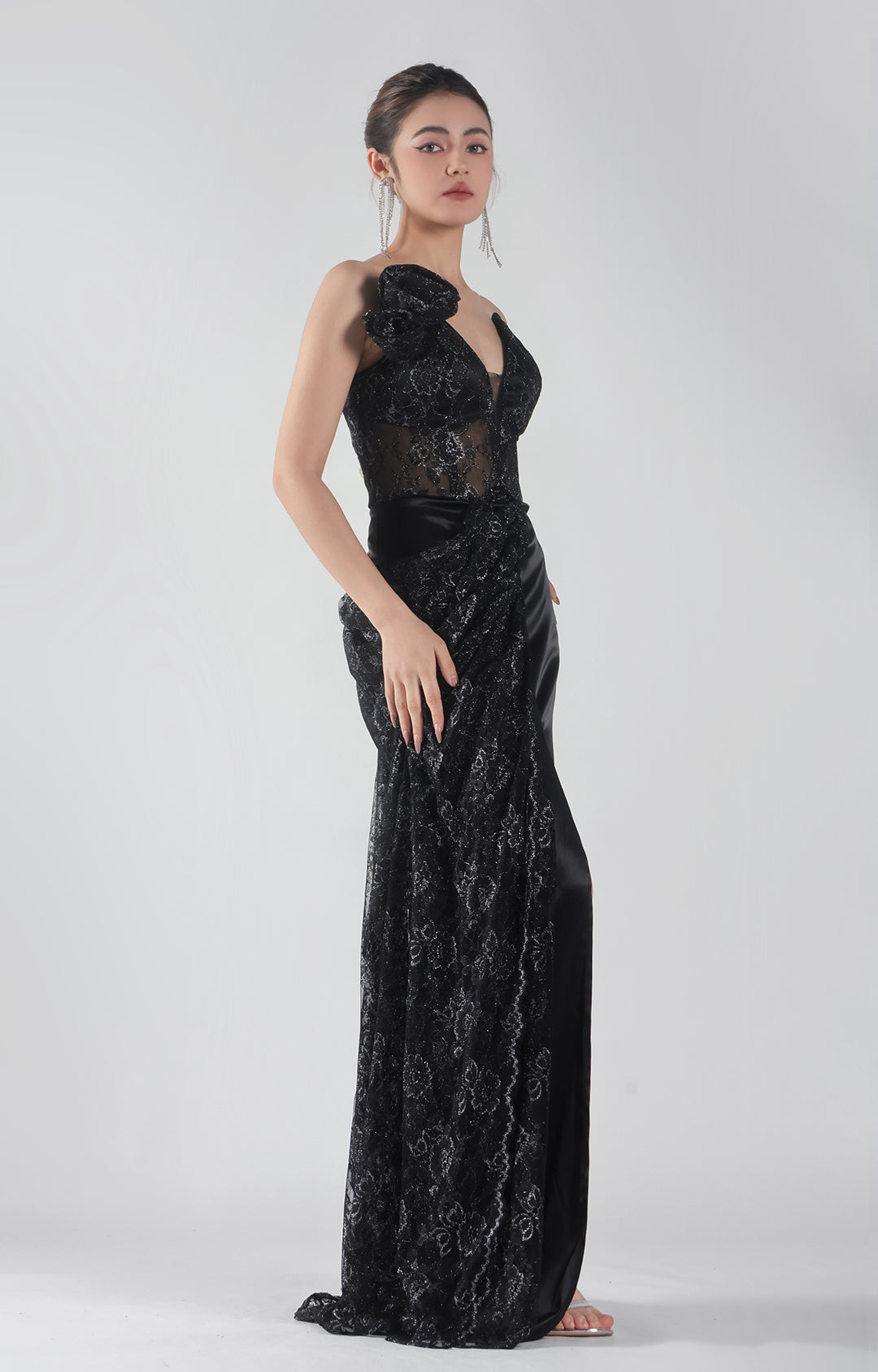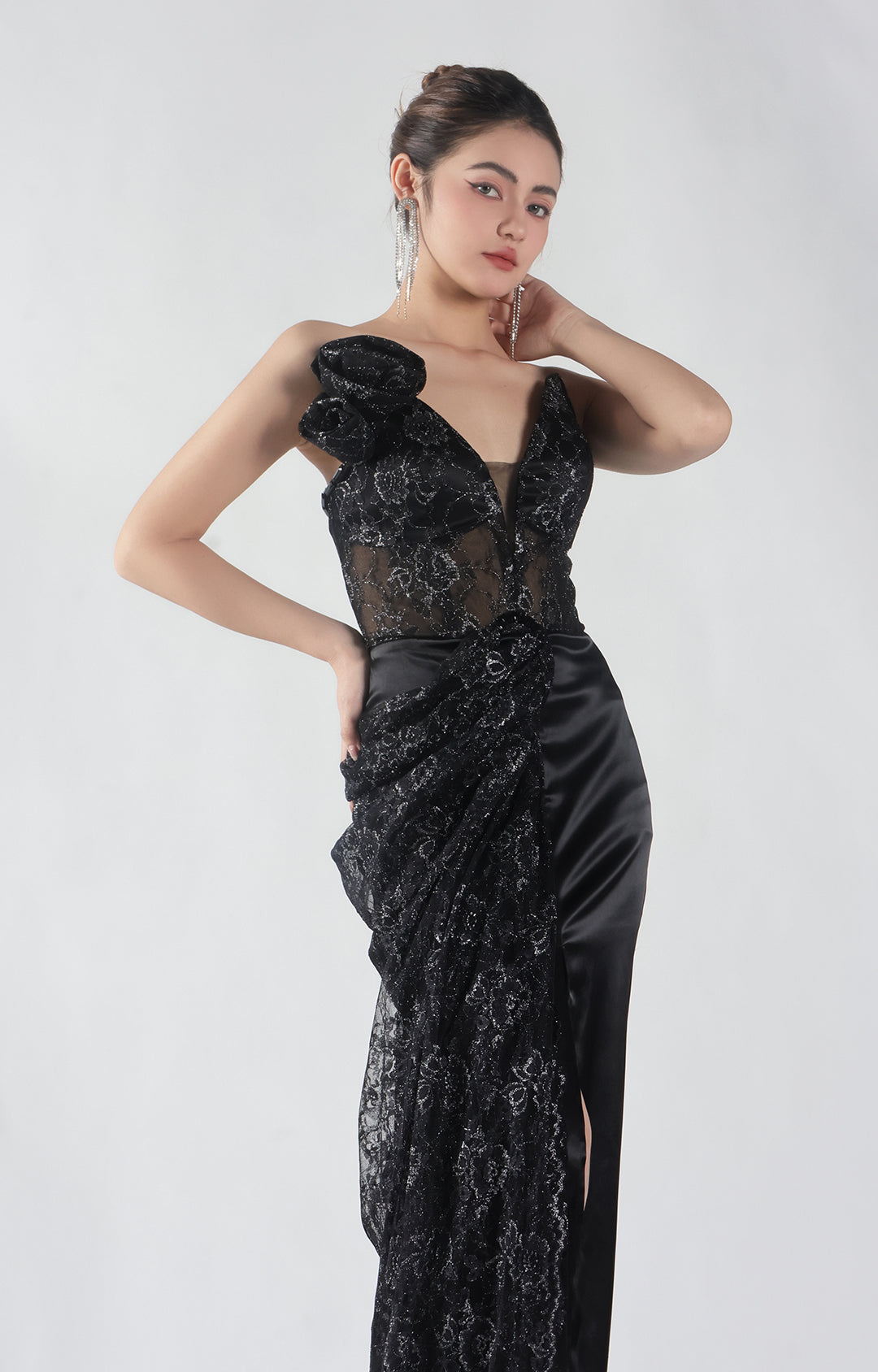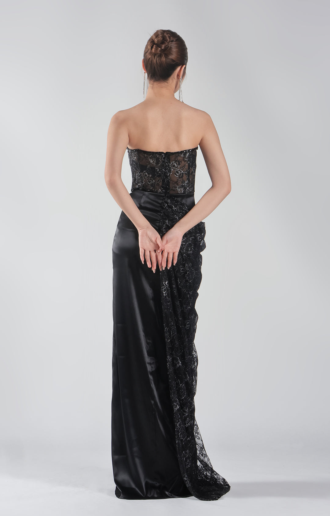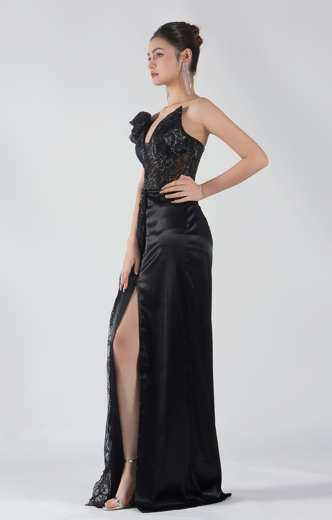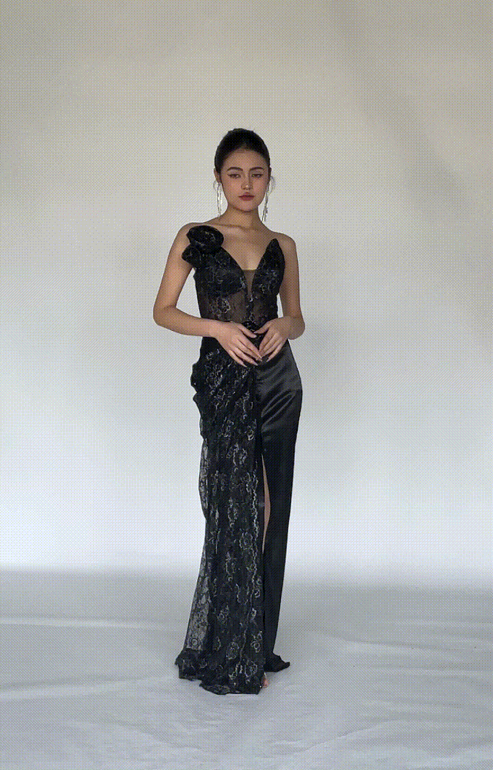 This striking tulle and satin gown is ideal for high-end evening events, red carpet appearances, black-tie galas, or fashion-forward formal occasions. Its artistic structure and sensual detailing ensure you’ll make an unforgettable impression.