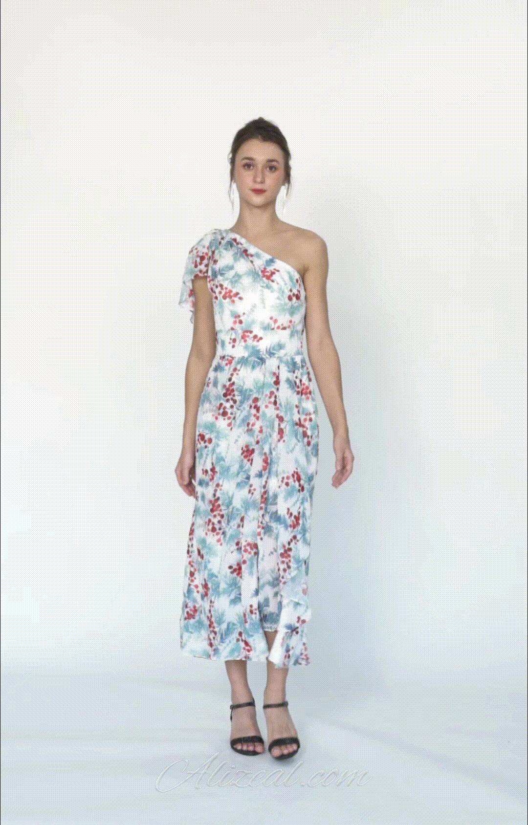 One Shoulder Ruffles Flowy Pleated Midi Dress