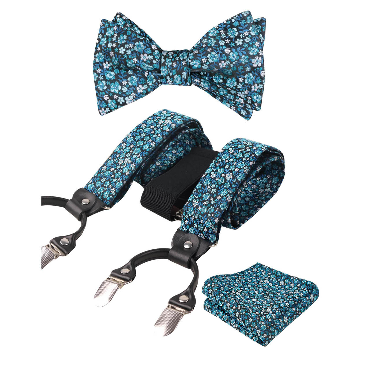 Small Floral Print Self-tied Bow Tie, Hanky, Suspender Set-BD073