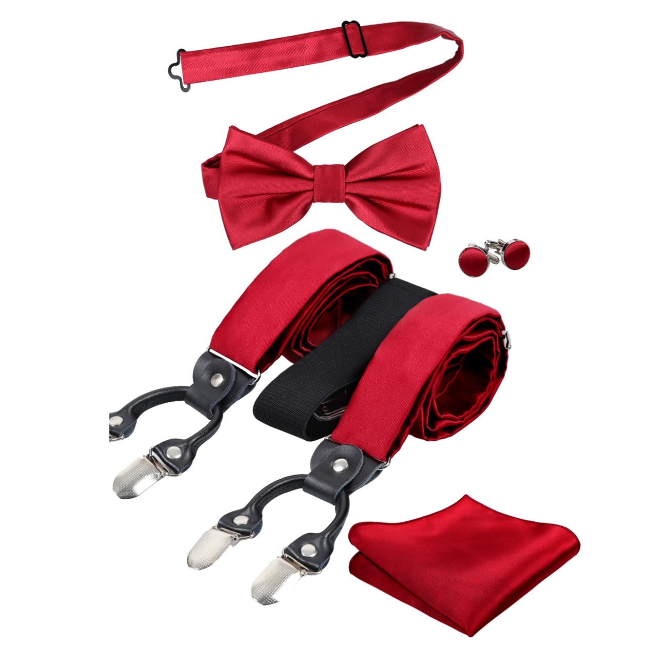 Mens Solid Color 6 Clips Suspender and Bowtie, Hanky, Cufflinks Set-BD072