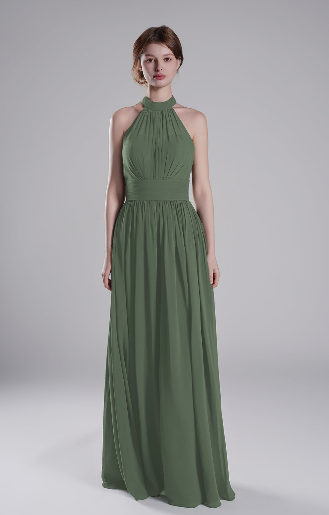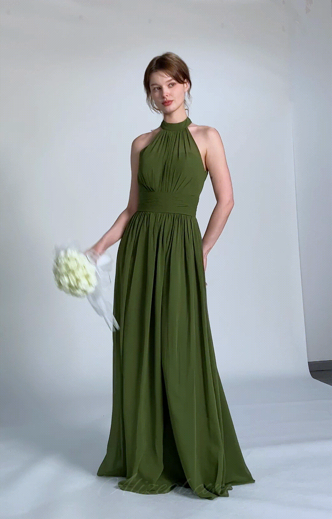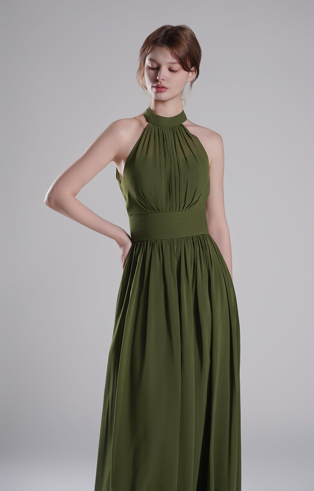 Halter Neckline Pleated Bodice Open Back A-Line Dresses