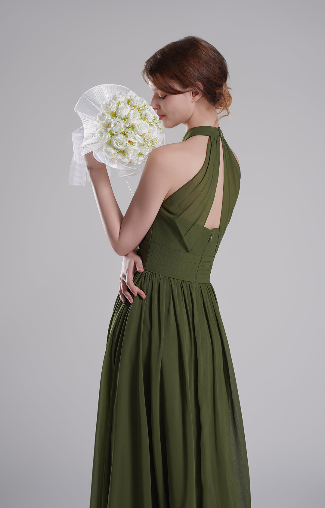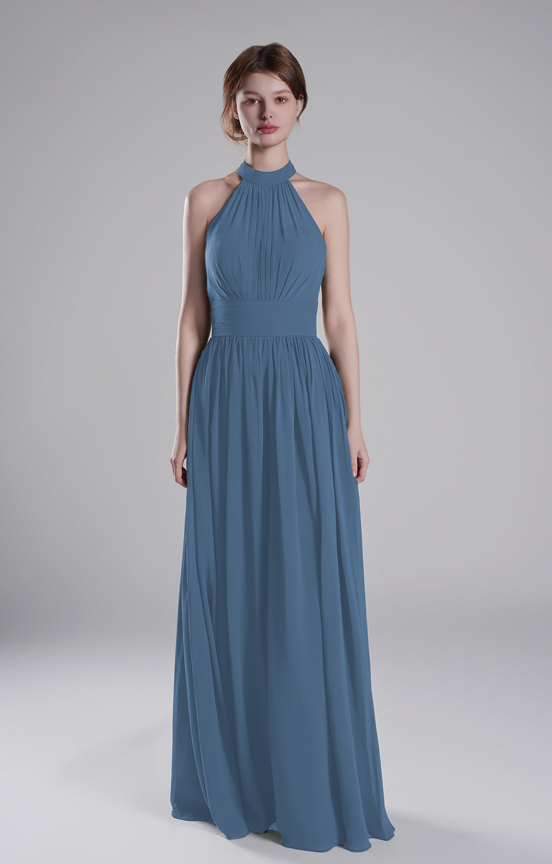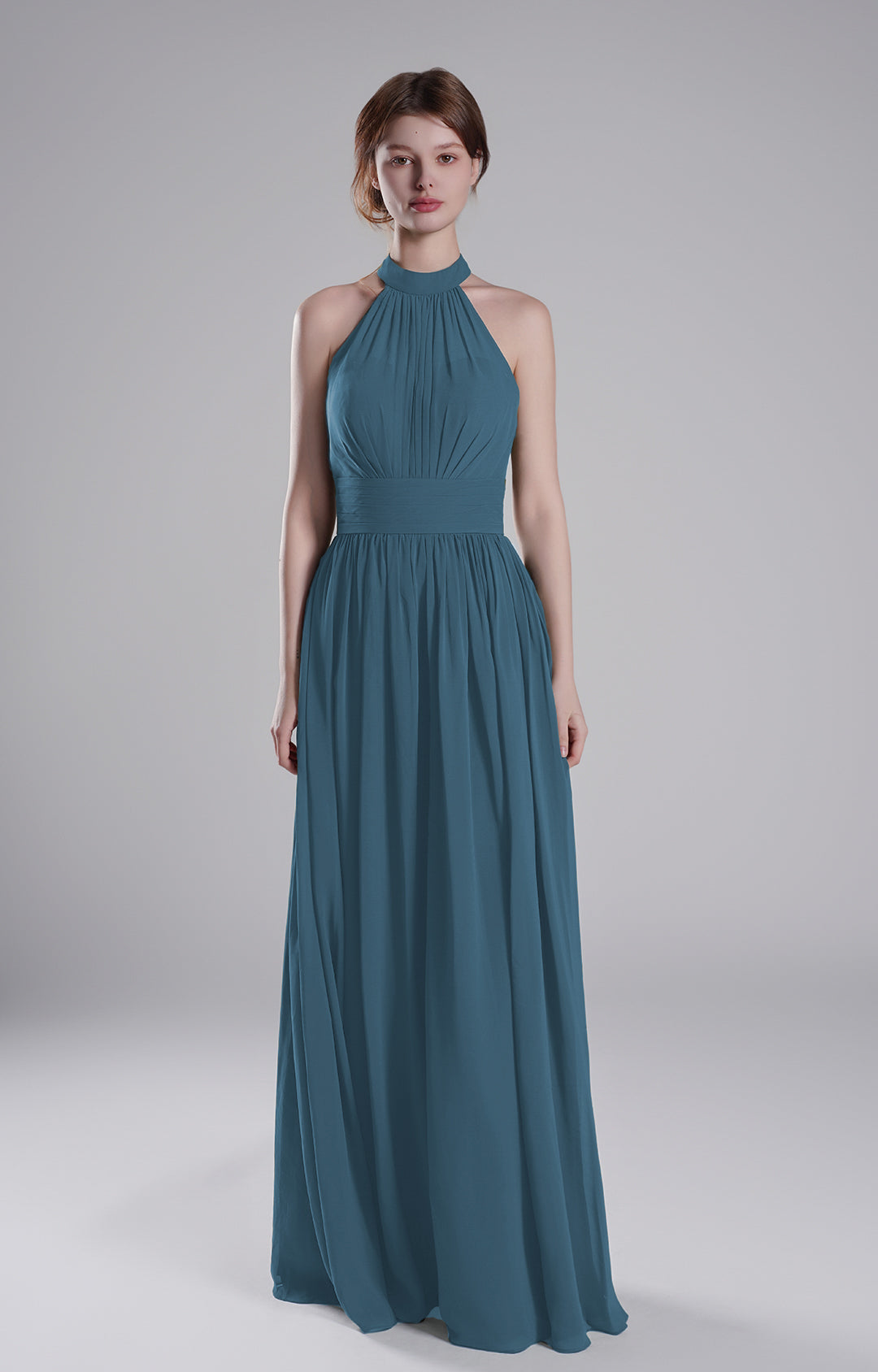 Halter Neckline Pleated Bodice Open Back A-Line Dresses