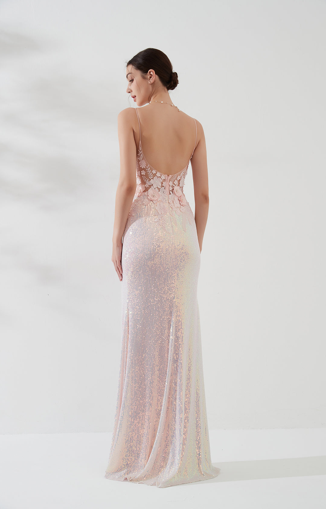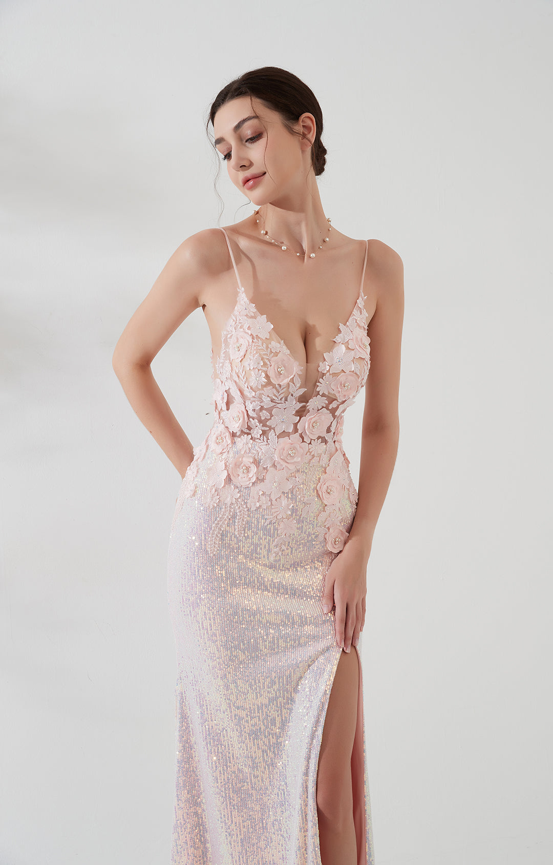 V-Neck Spaghetti Straps 3D Appliqued Sequins High Split Party Dress