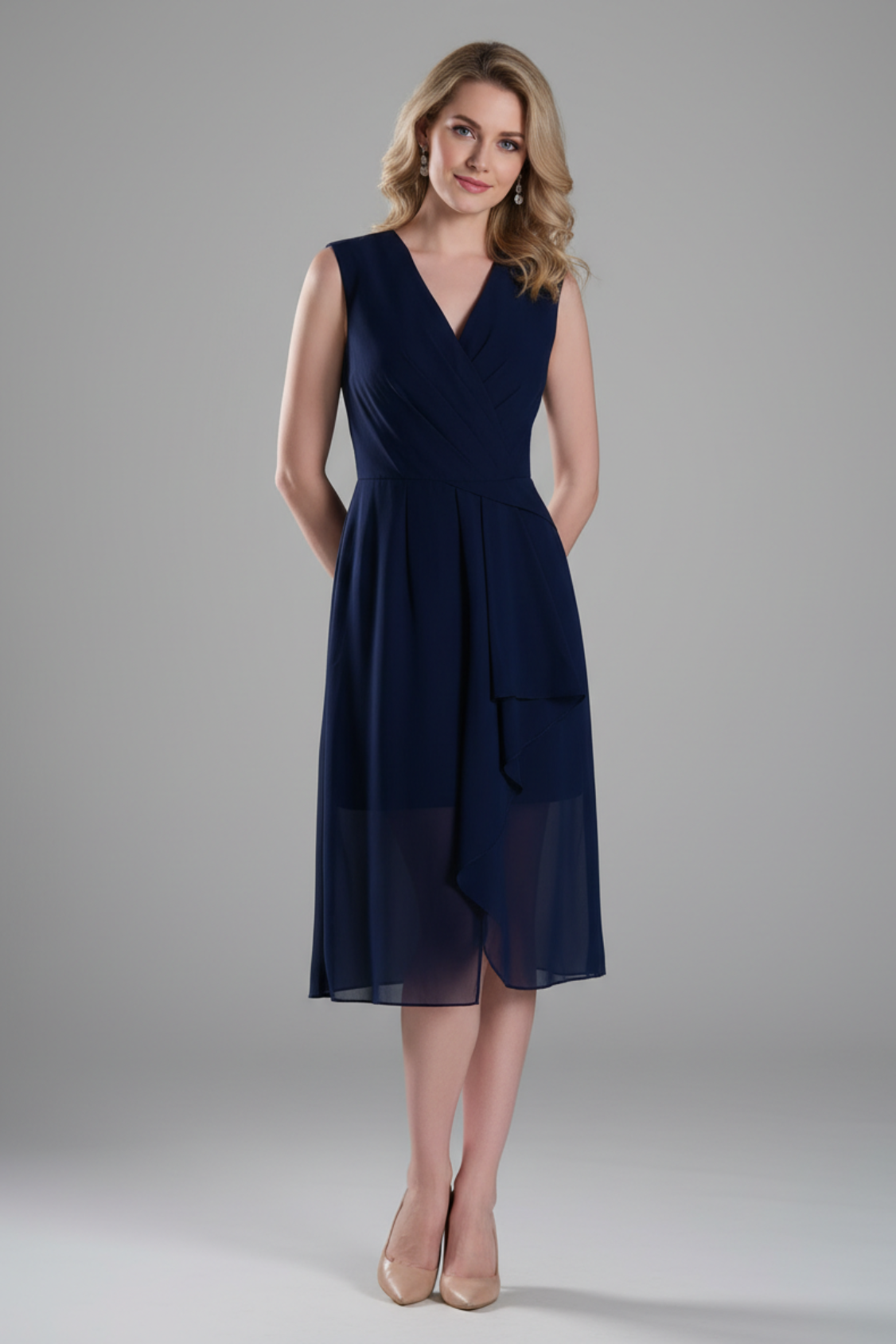 Sophisticated Pleated V-Neck Flared Hem Dress