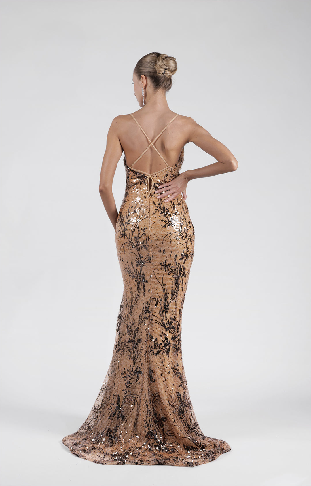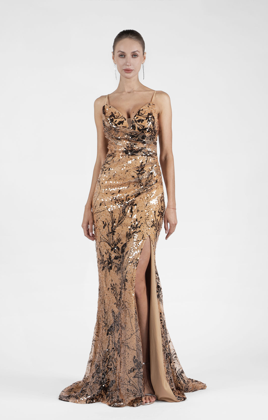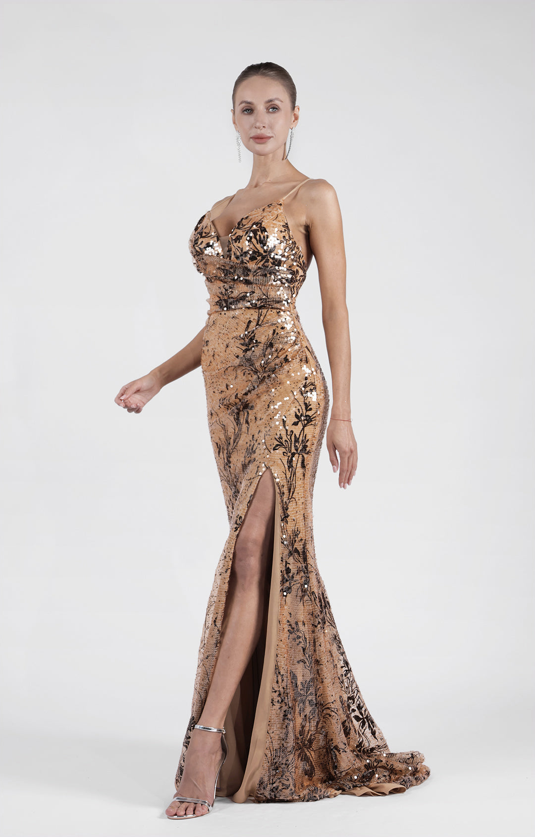 Deep V-Neck Spaghetti Strap Sequin Printed High Split Skinny Floor Length Dresses