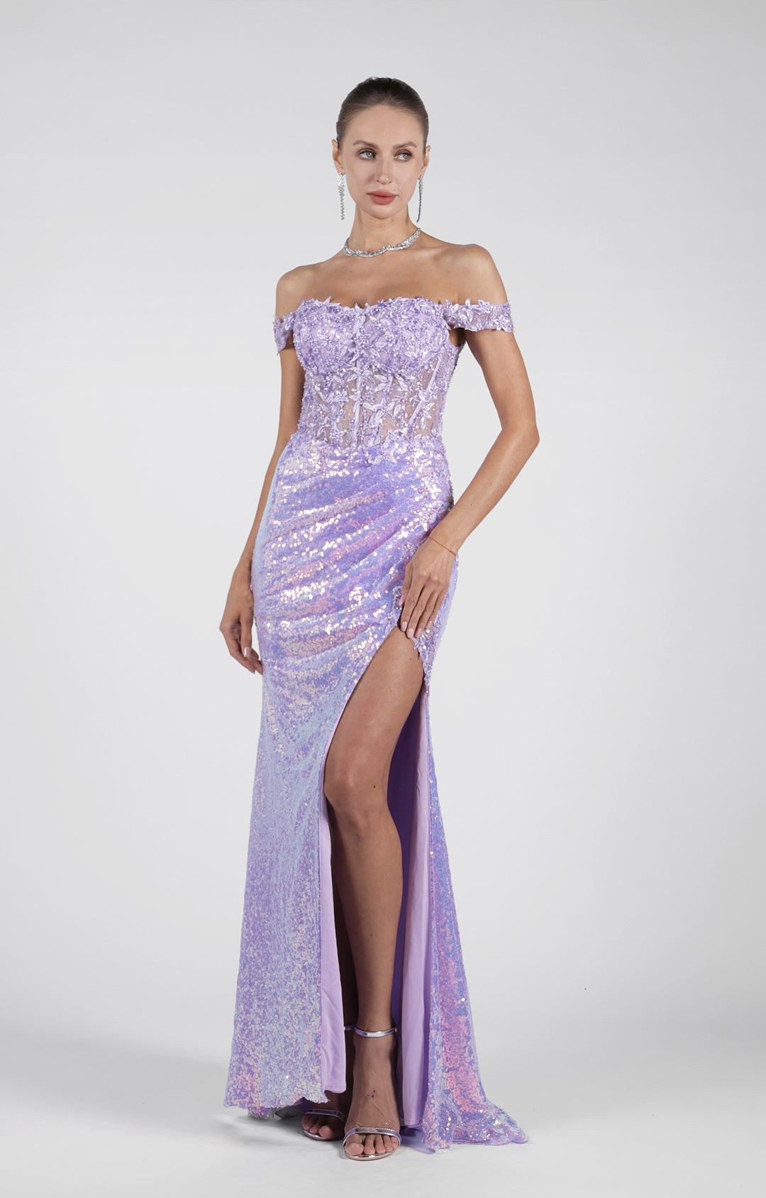 Off Shoulder High Side Split Corset Appliqued Sequins Evening Dress
