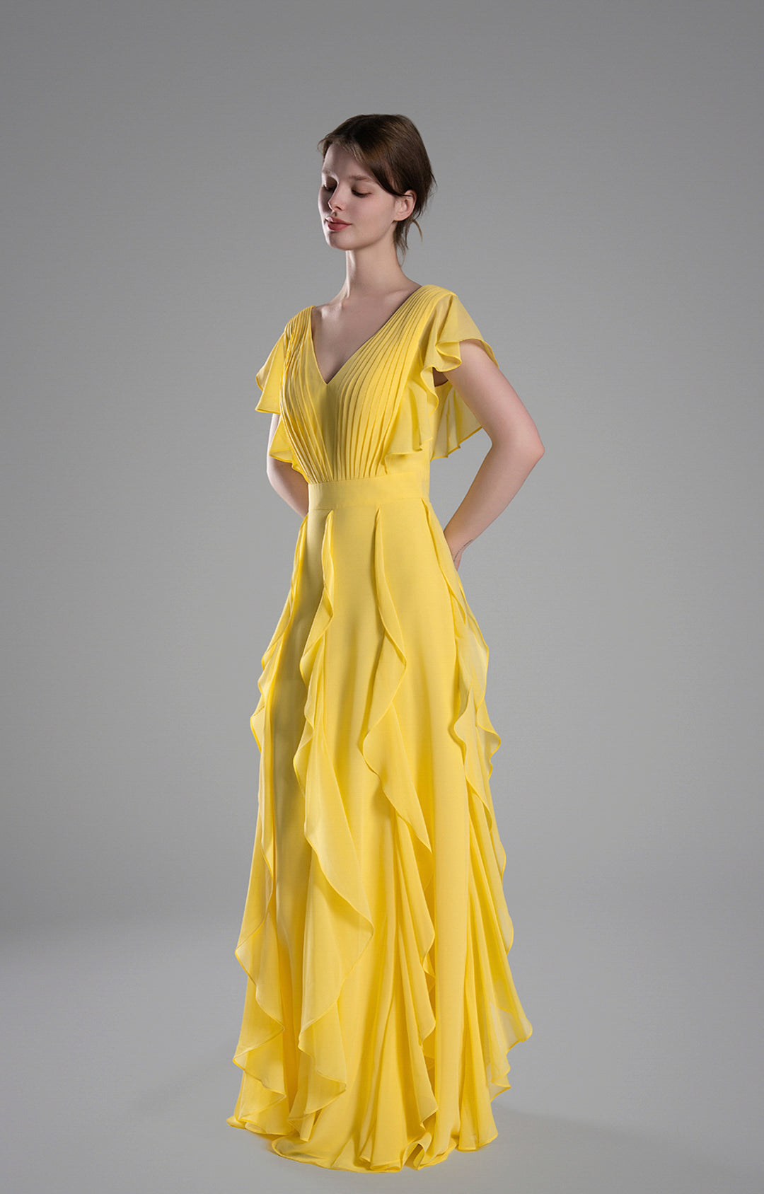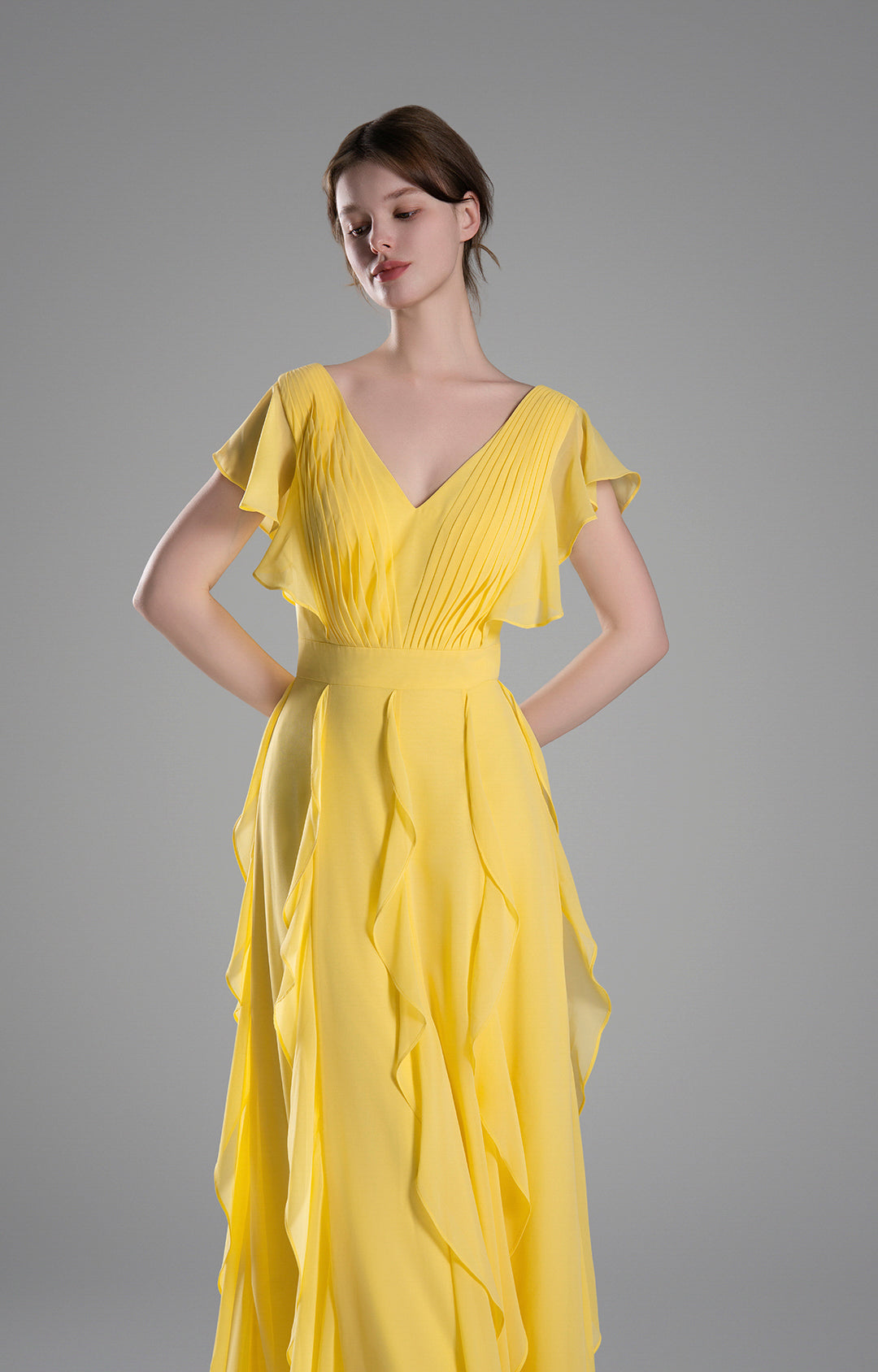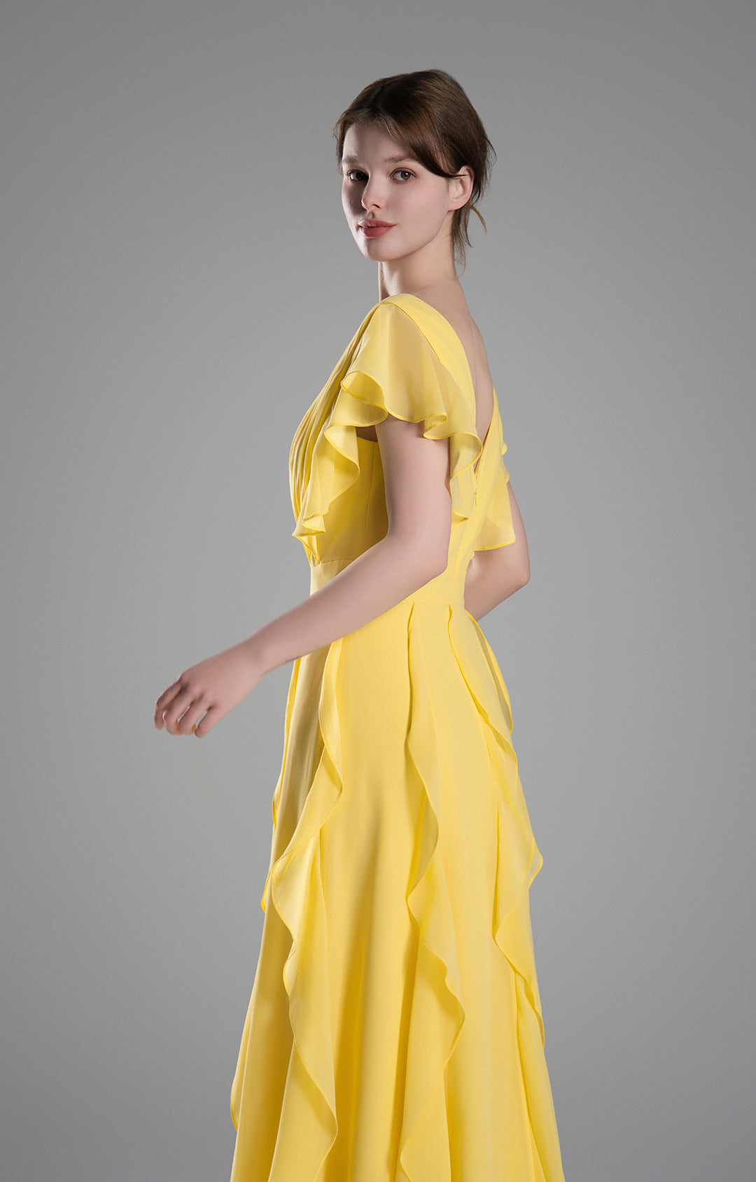 Perfect for formal events, evening parties, weddings, and other special occasions. The soft yellow color and flowing design make it an ideal choice for a summer or spring celebration, exuding grace and charm.