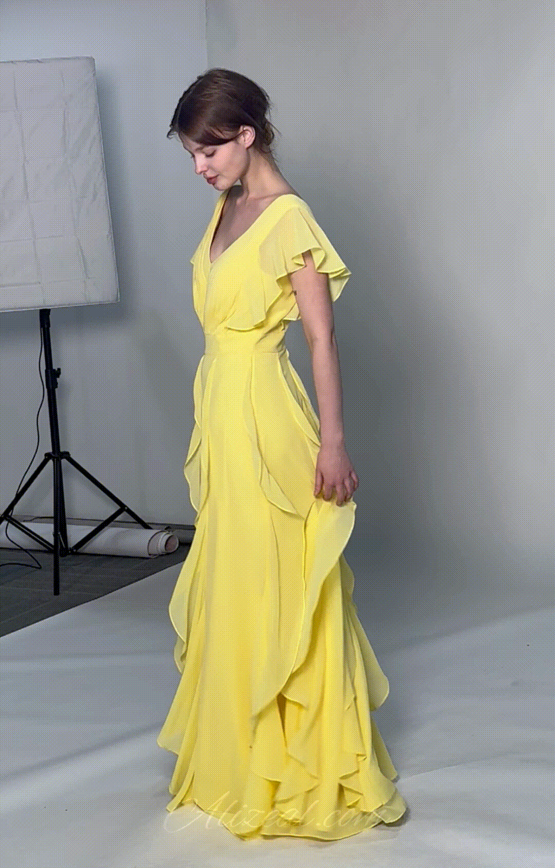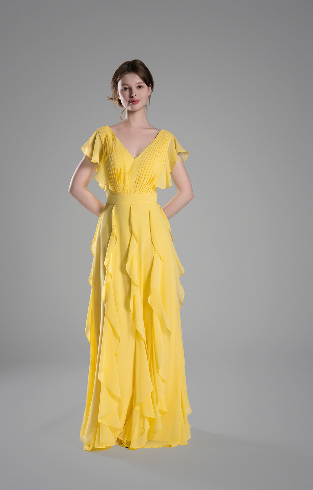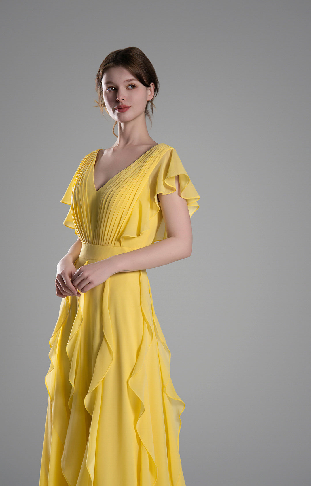 Perfect for formal events, evening parties, weddings, and other special occasions. The soft yellow color and flowing design make it an ideal choice for a summer or spring celebration, exuding grace and charm.