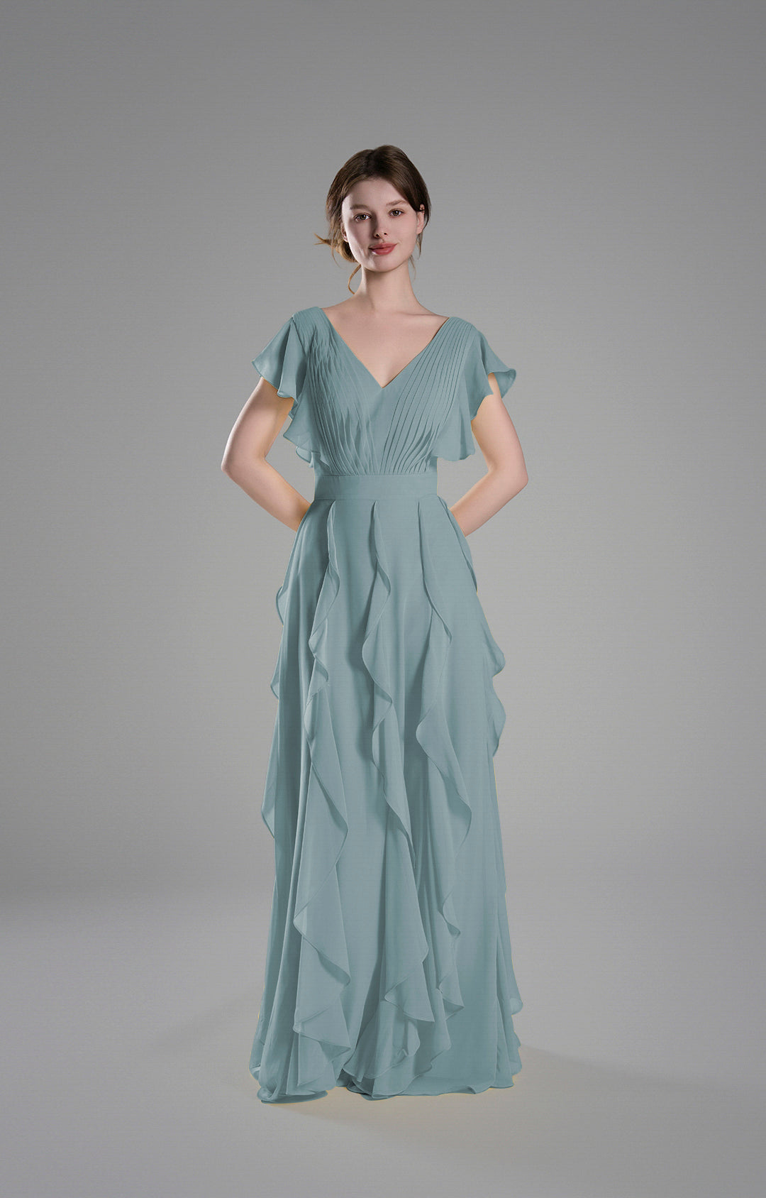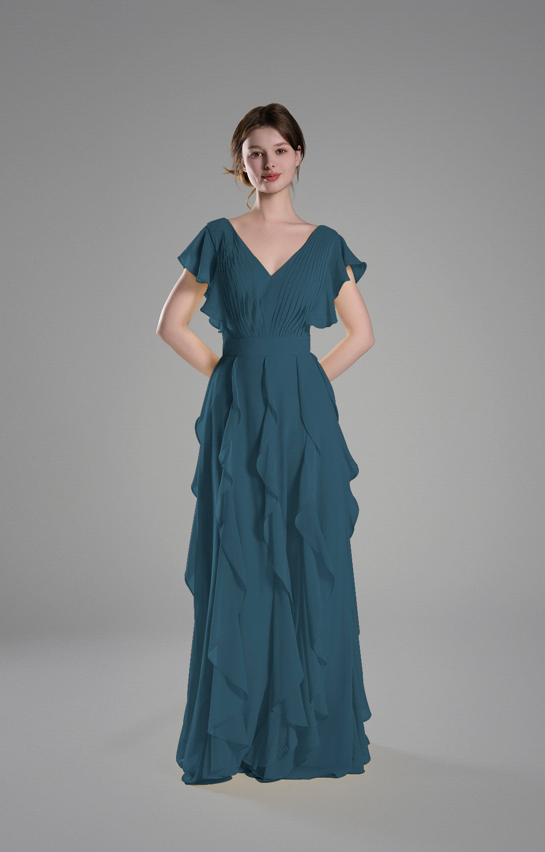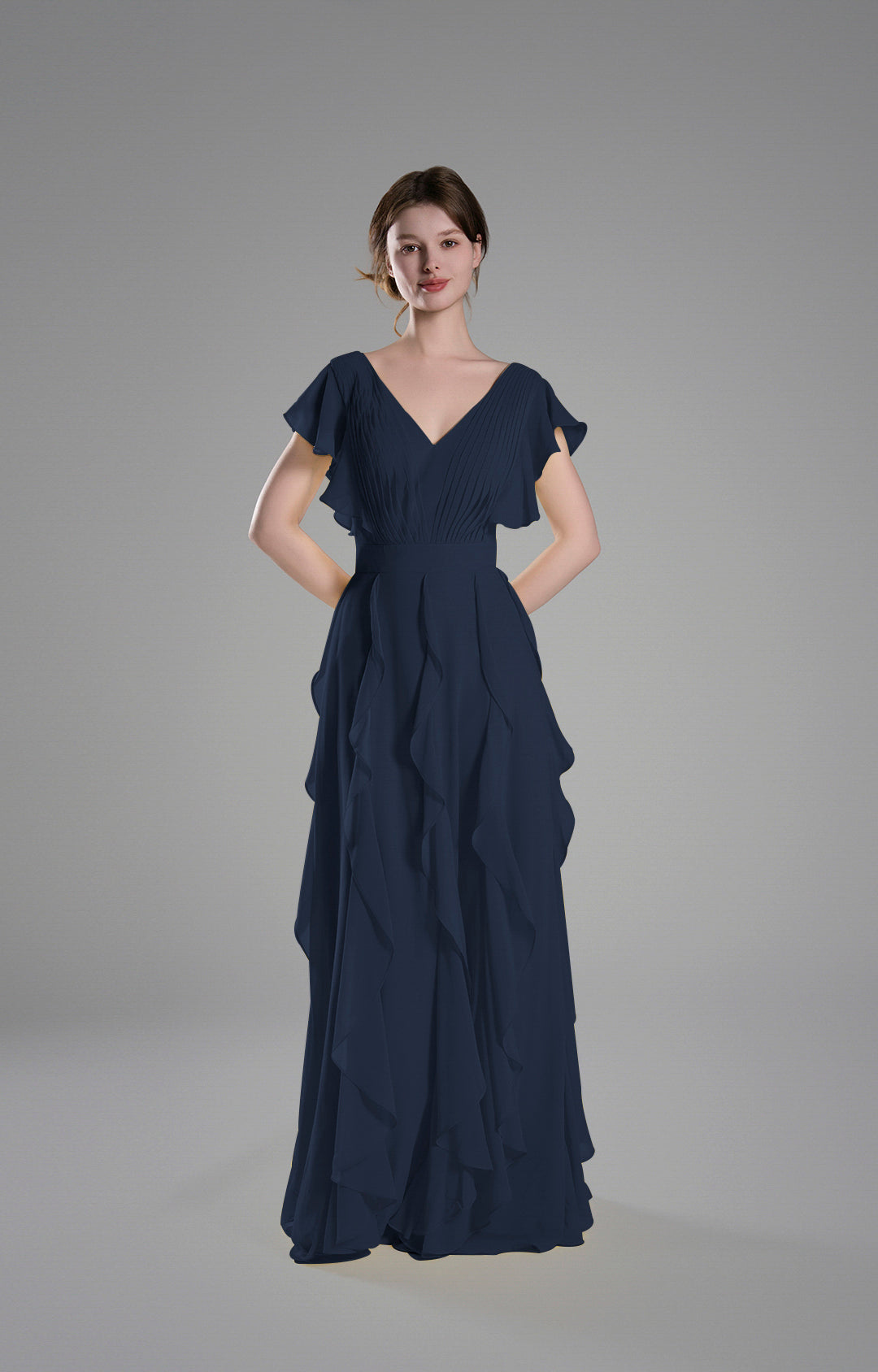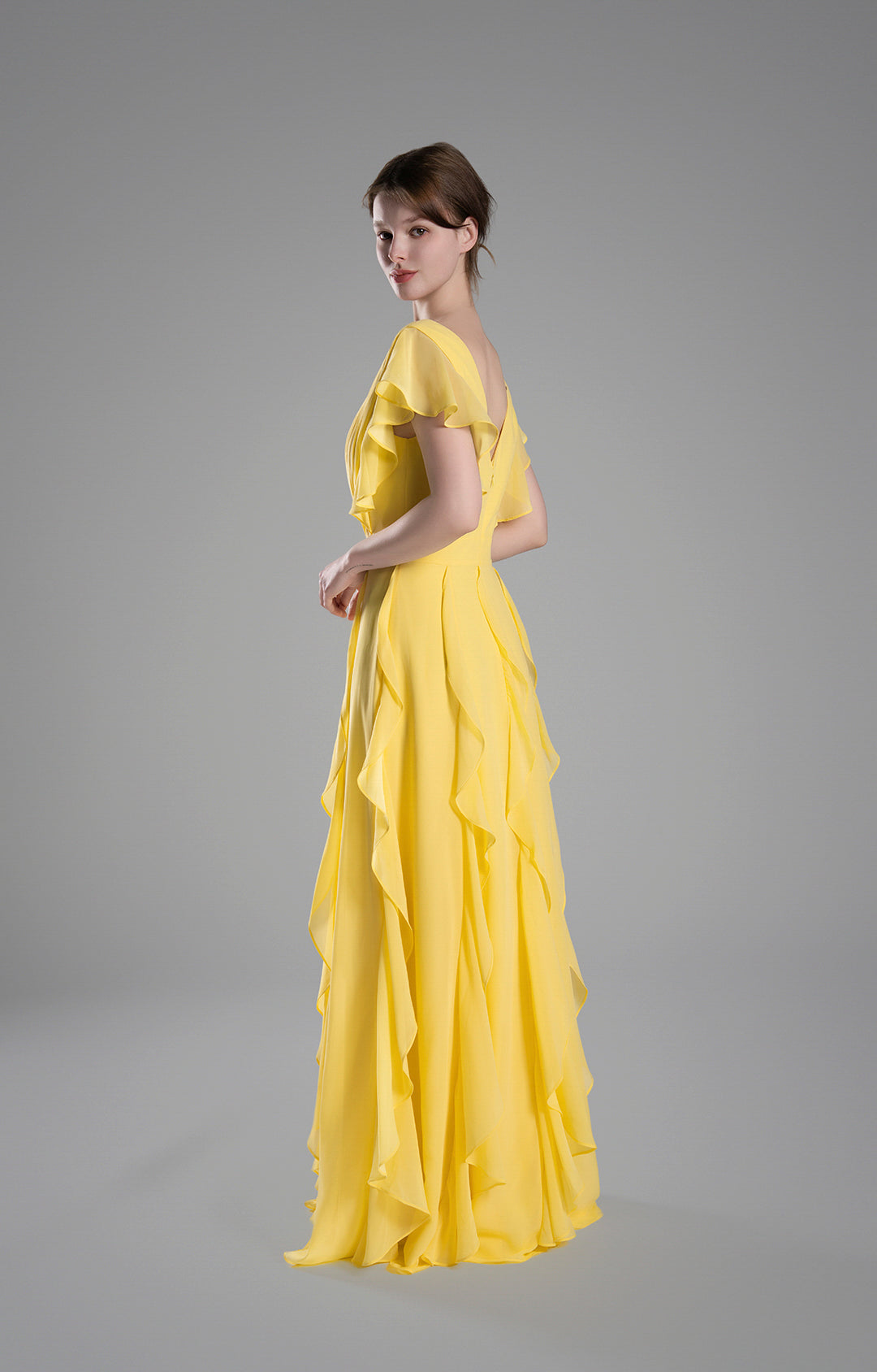 Crafted from lightweight chiffon, this gown drapes beautifully, creating a soft and graceful silhouette.