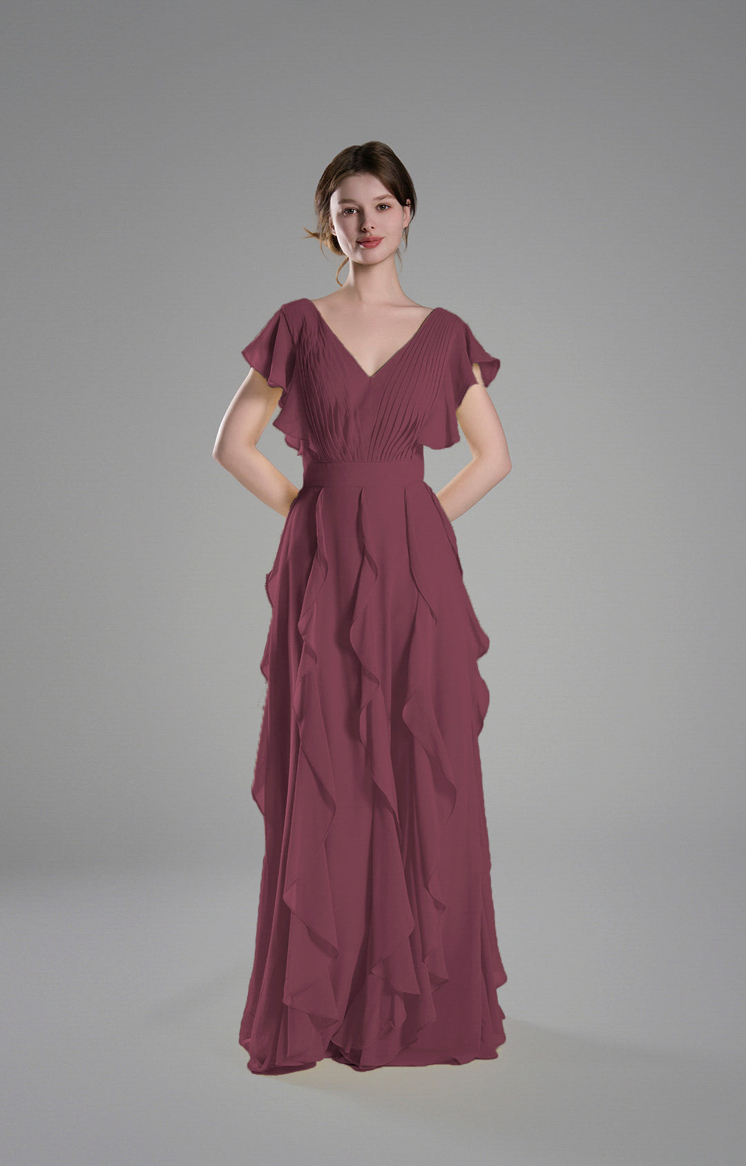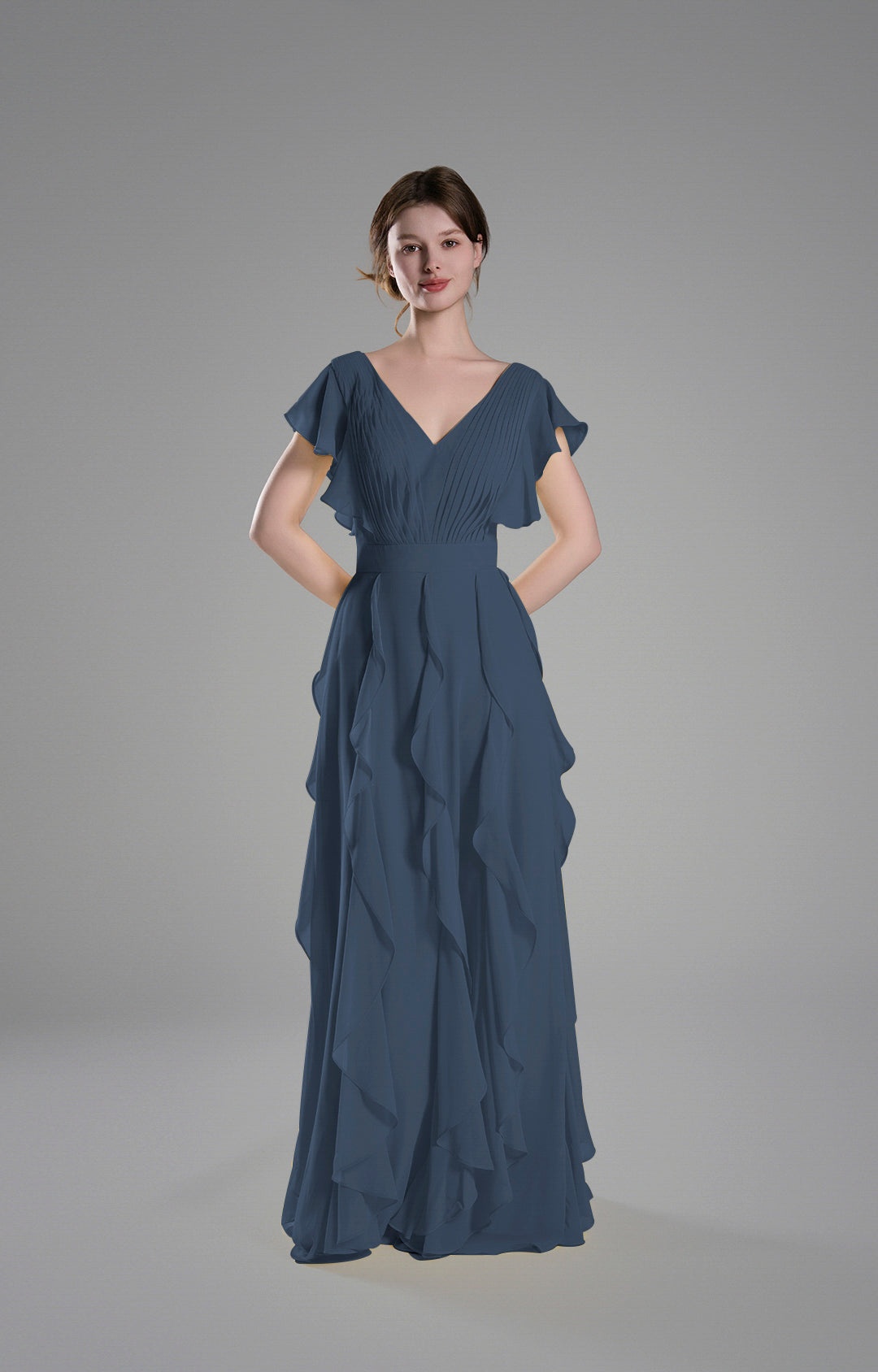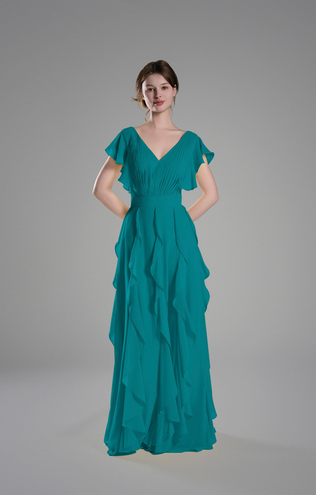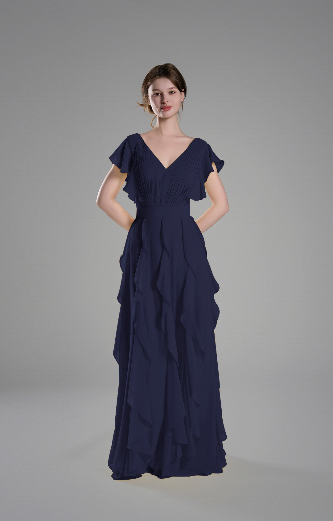 Crafted from lightweight chiffon, this gown drapes beautifully, creating a soft and graceful silhouette.