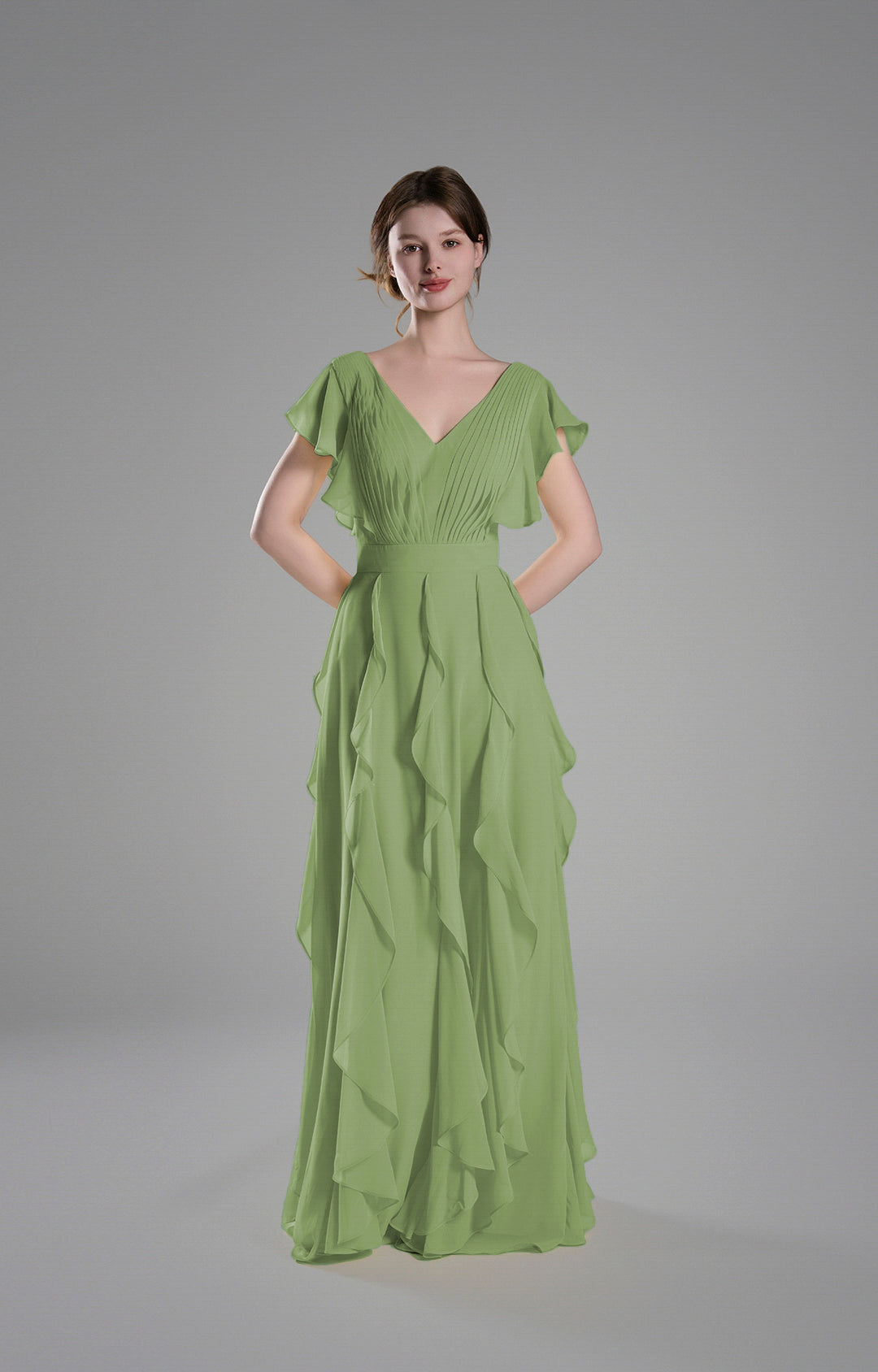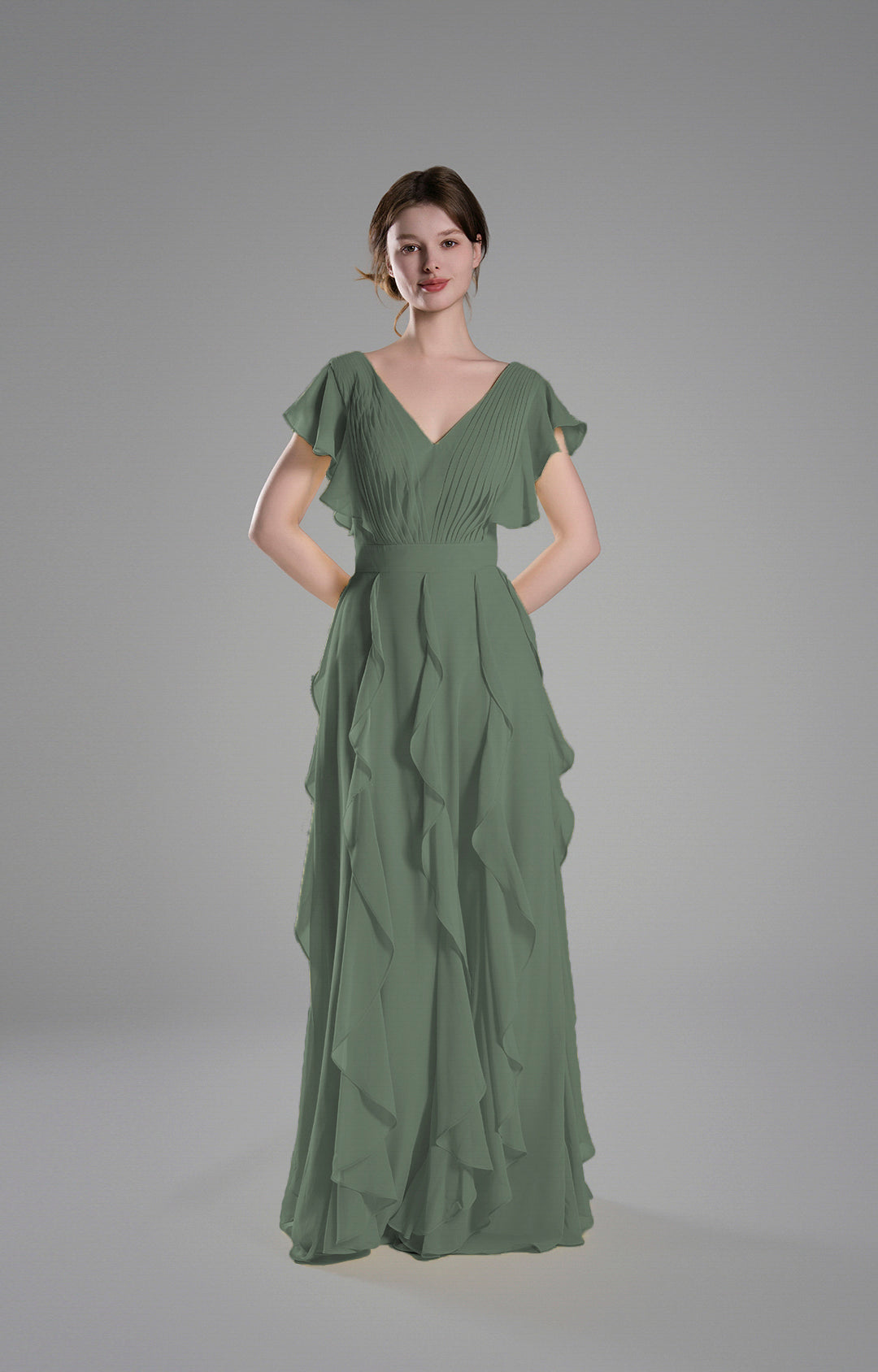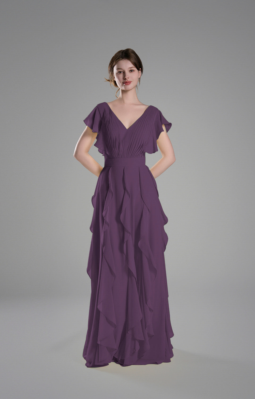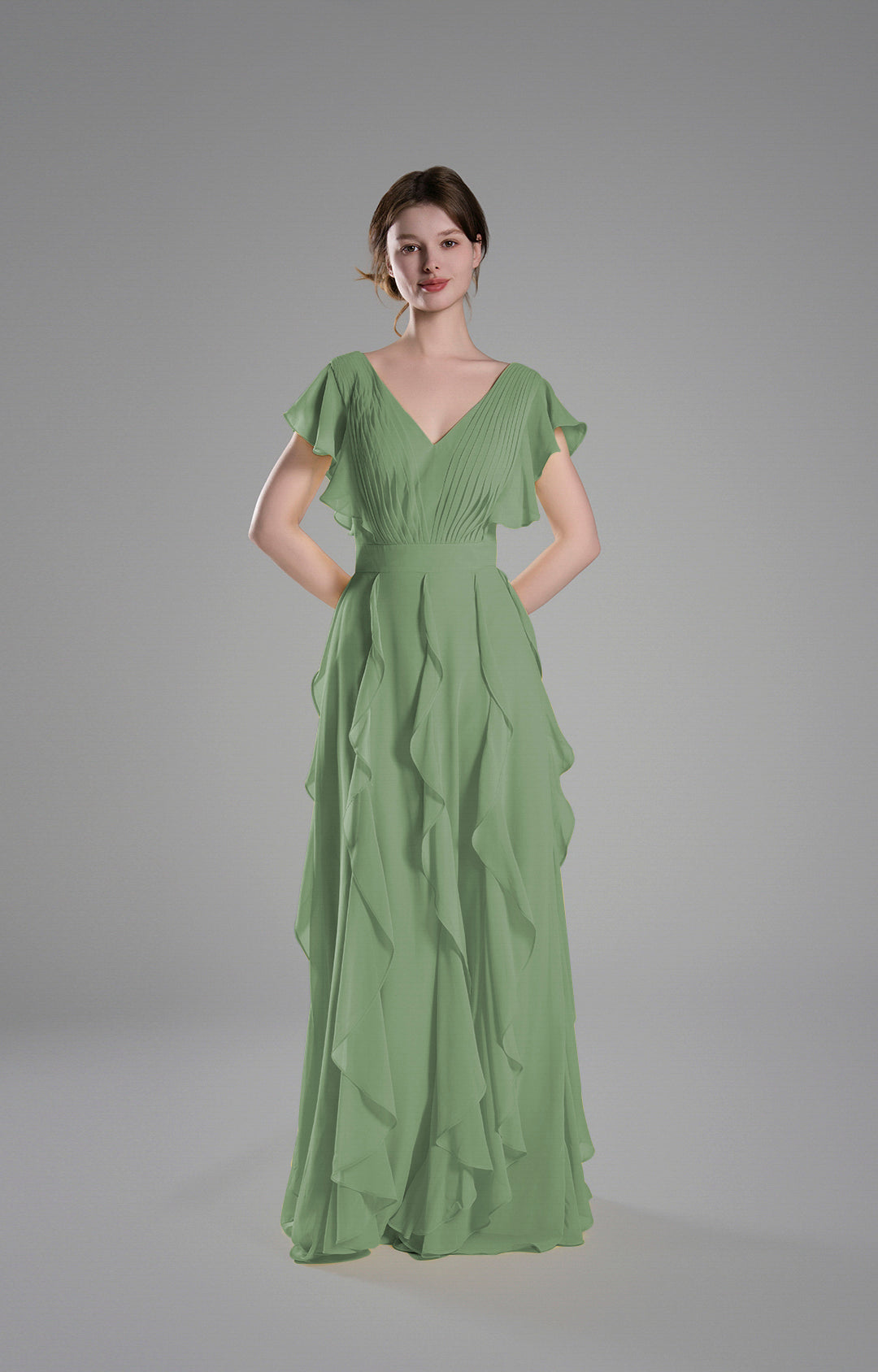 Crafted from lightweight chiffon, this gown drapes beautifully, creating a soft and graceful silhouette.