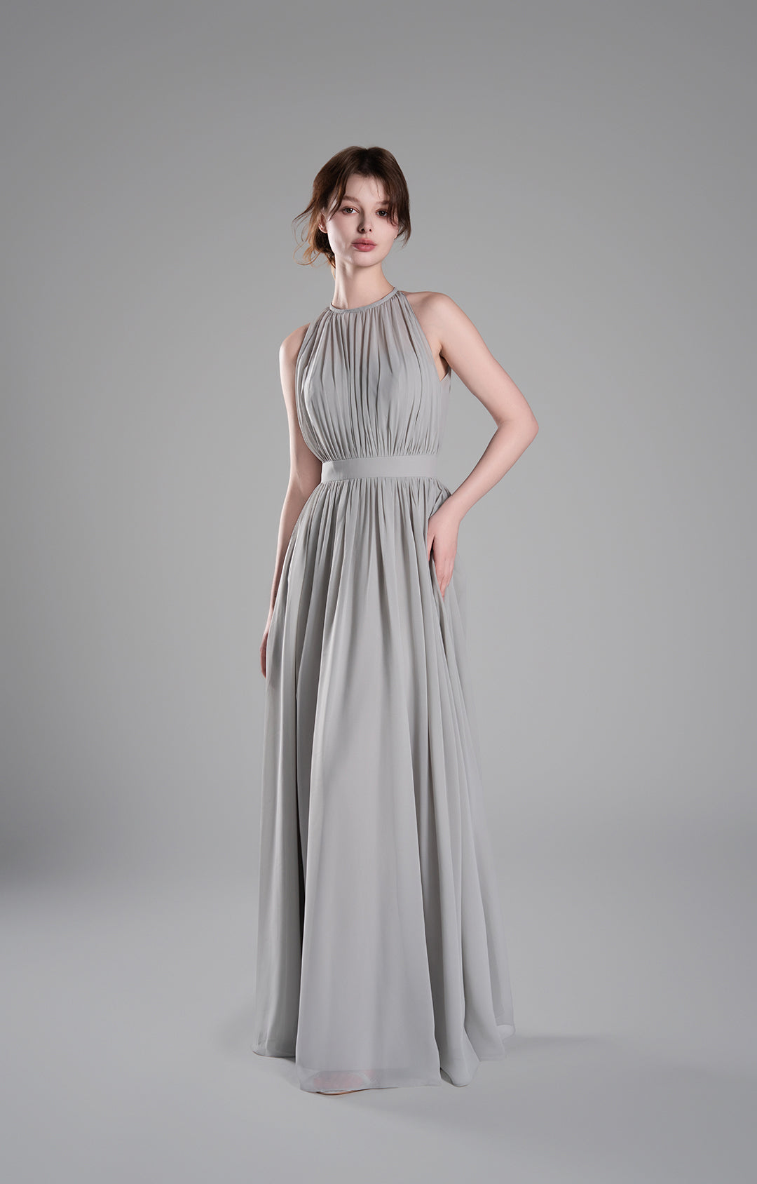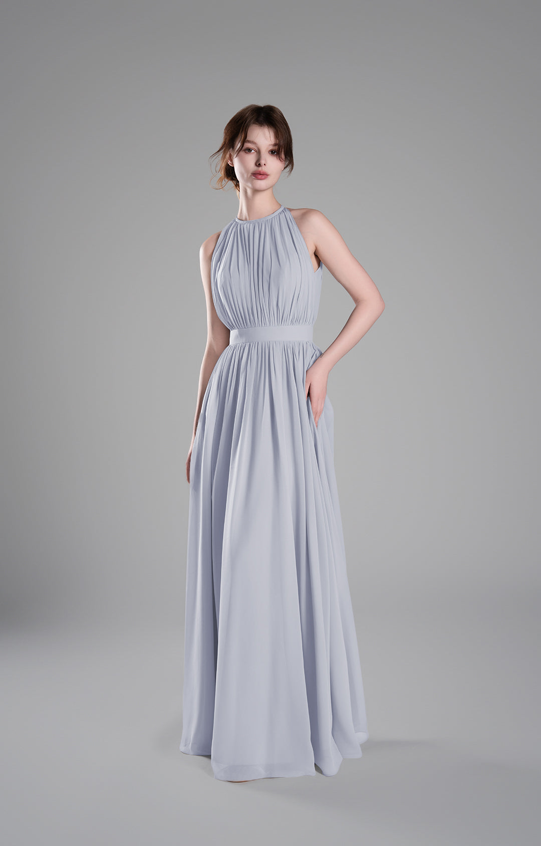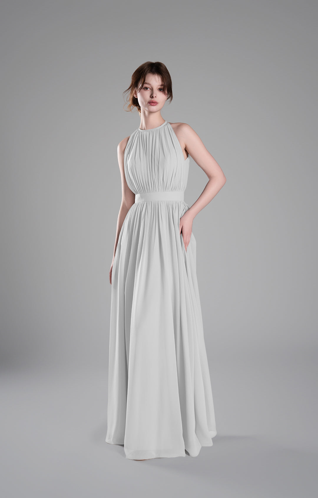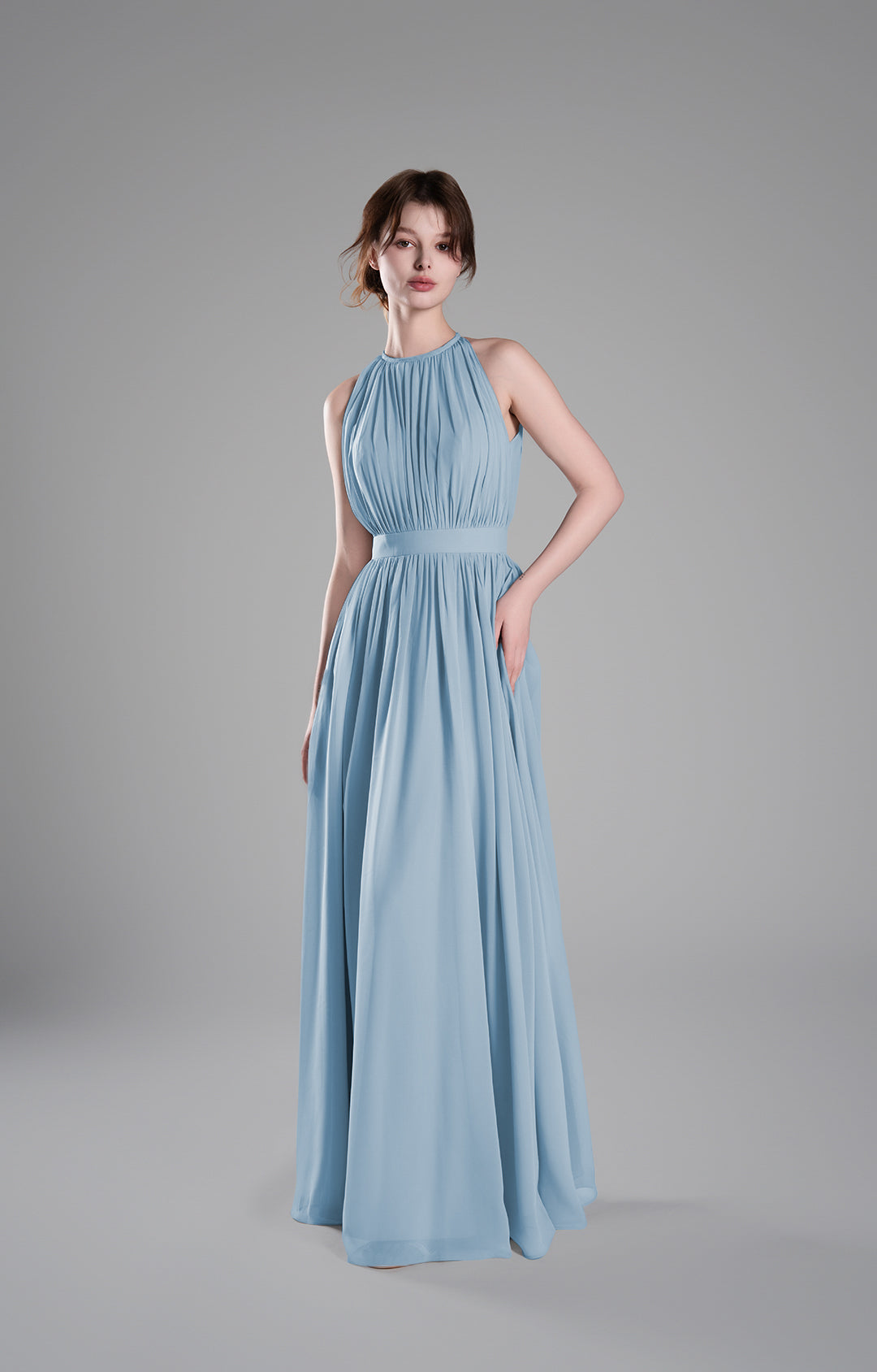 - High Halter Neckline with Delicate Pleats