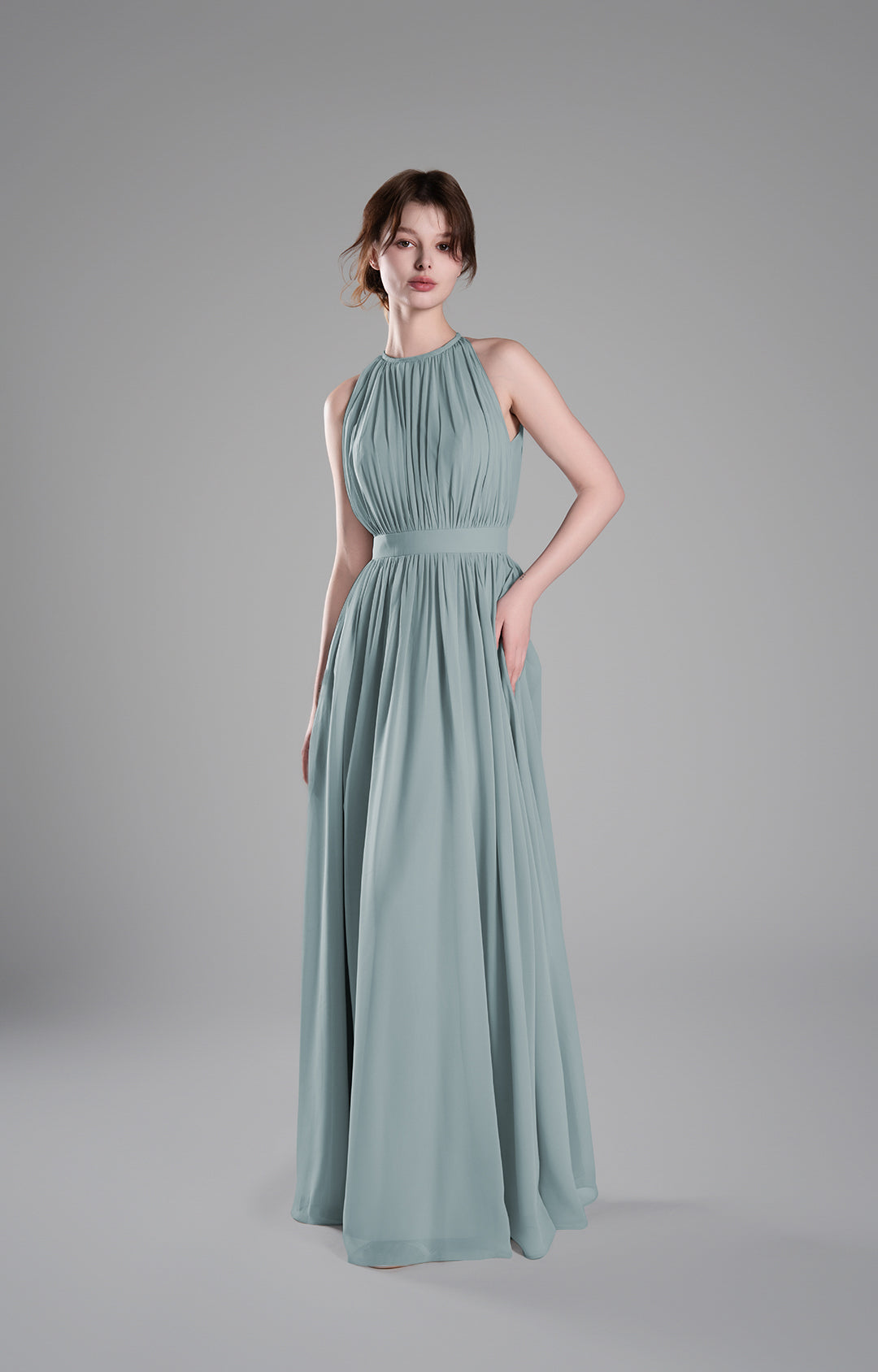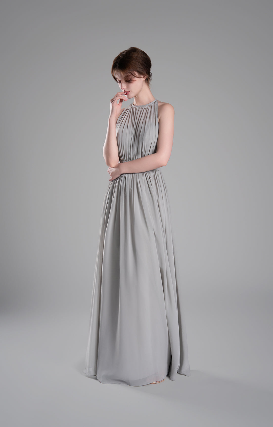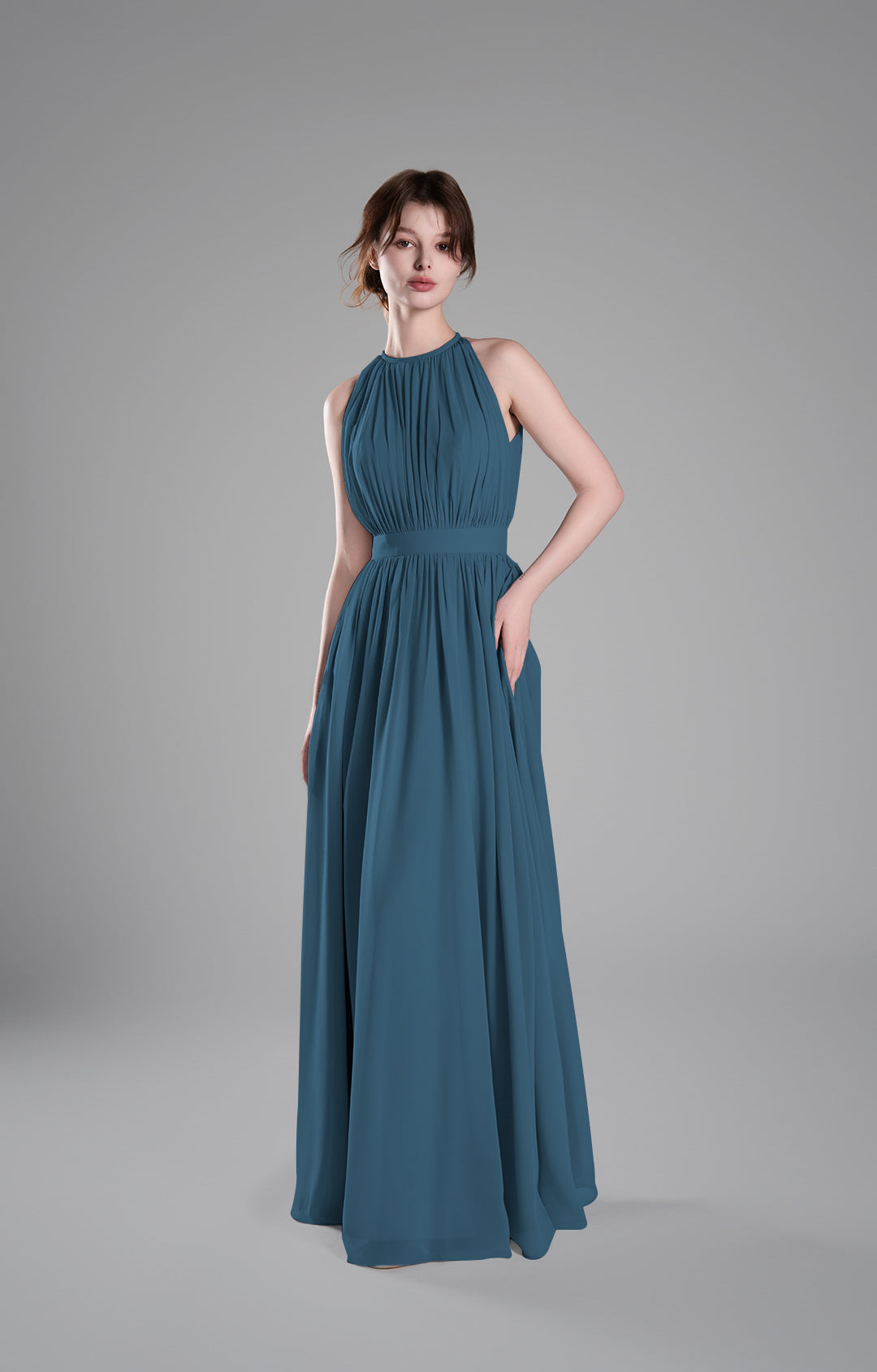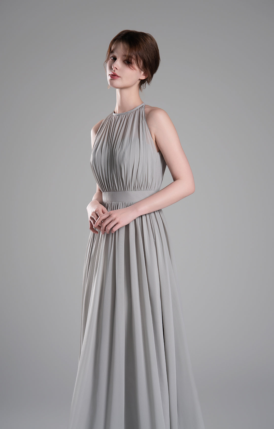 - High Halter Neckline with Delicate Pleats