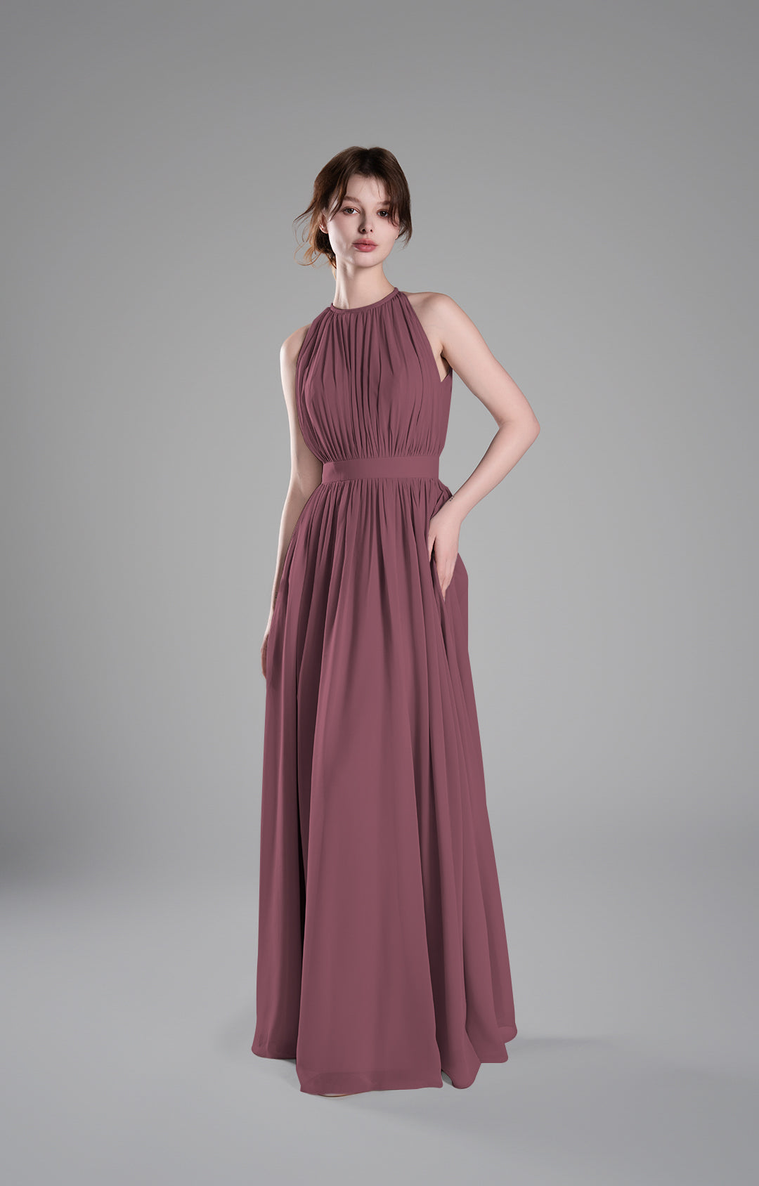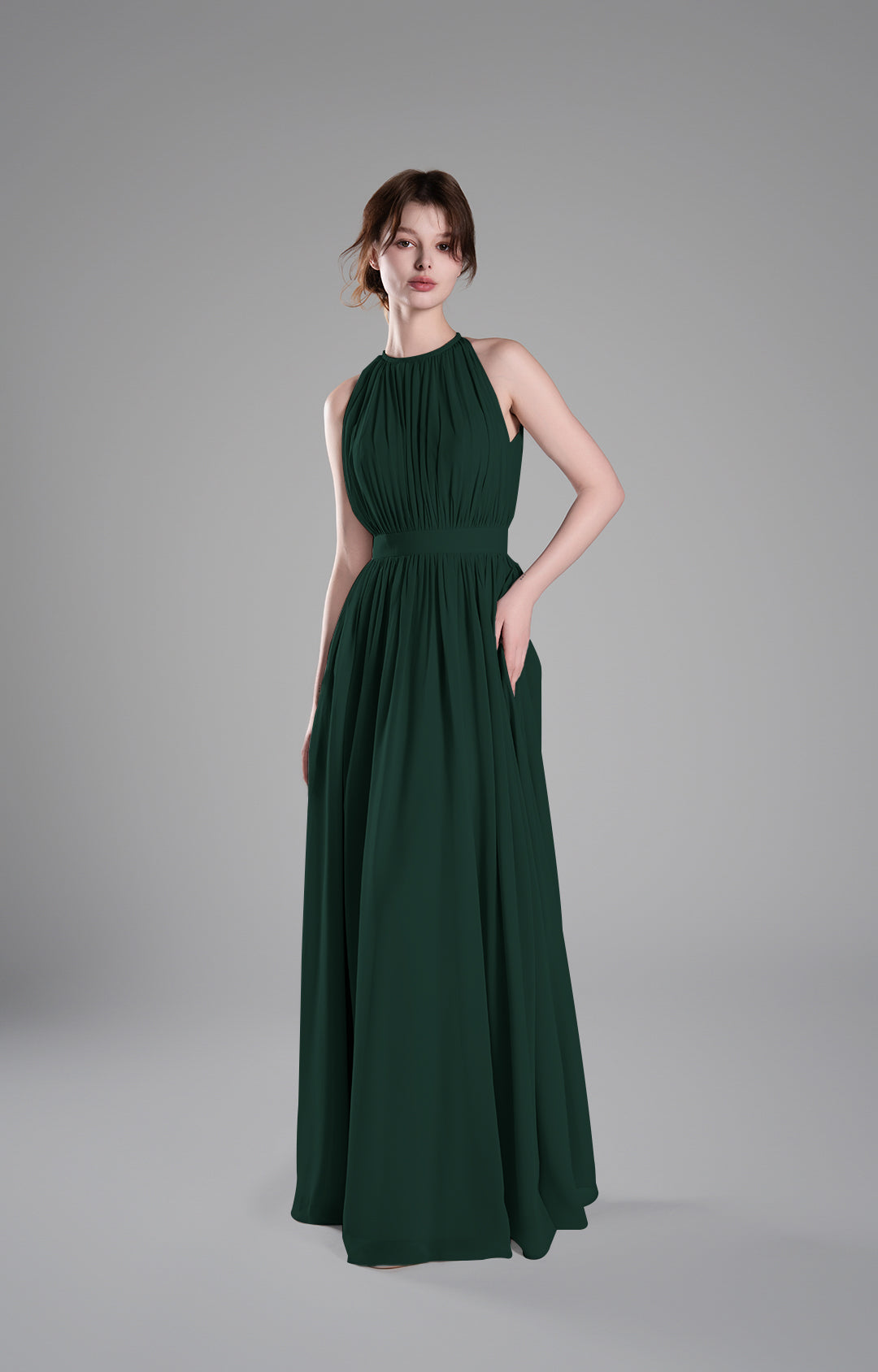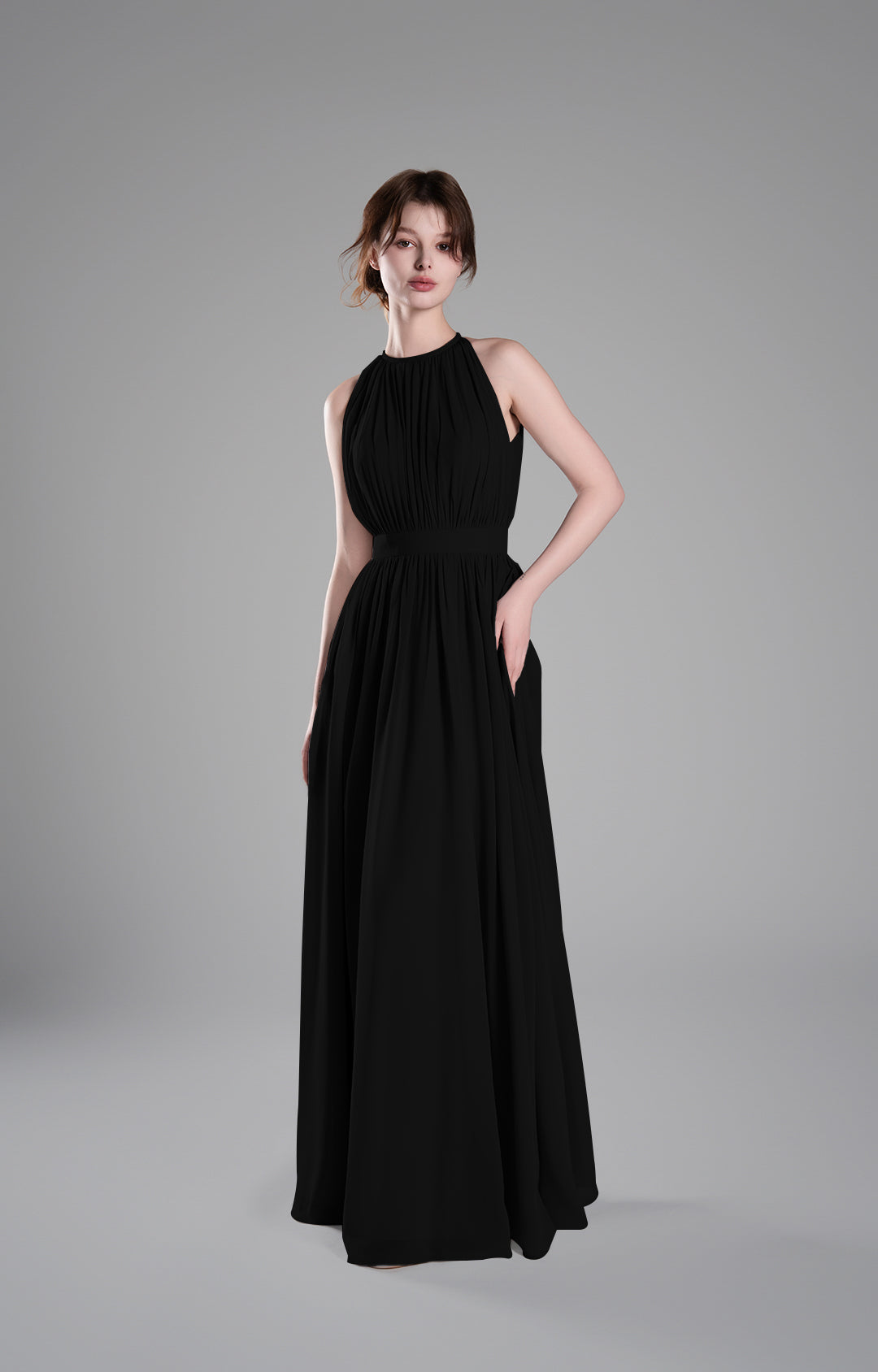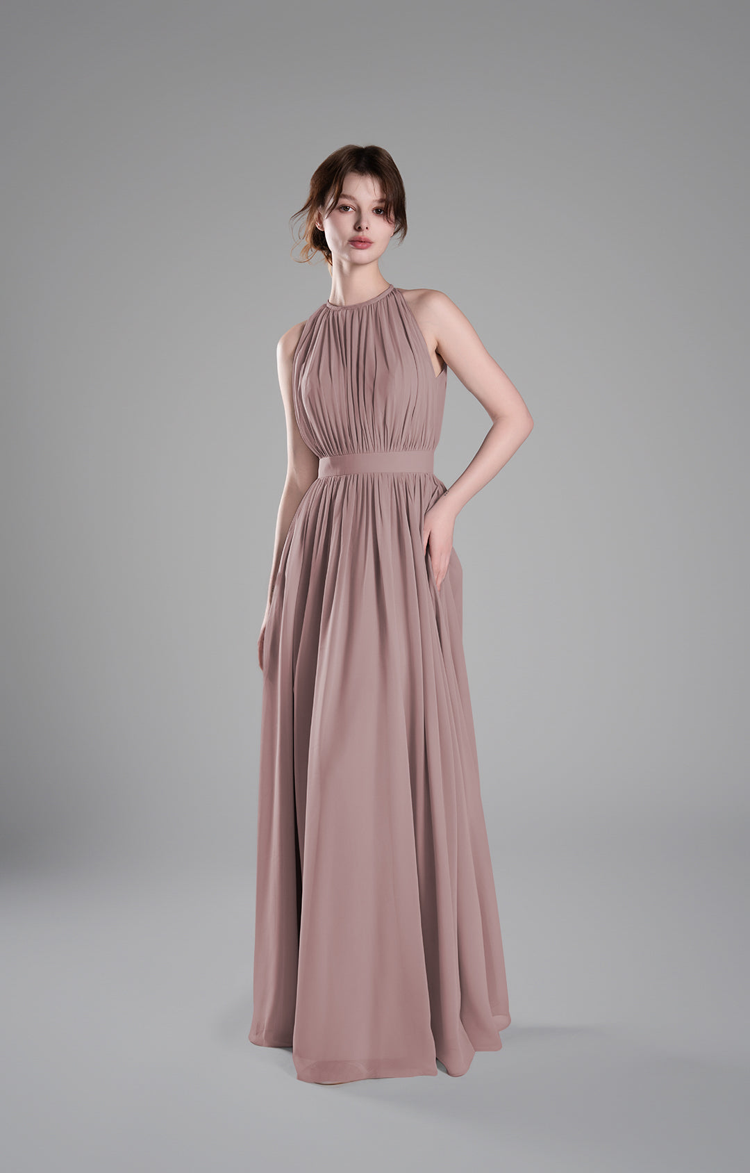 - High Halter Neckline with Delicate Pleats