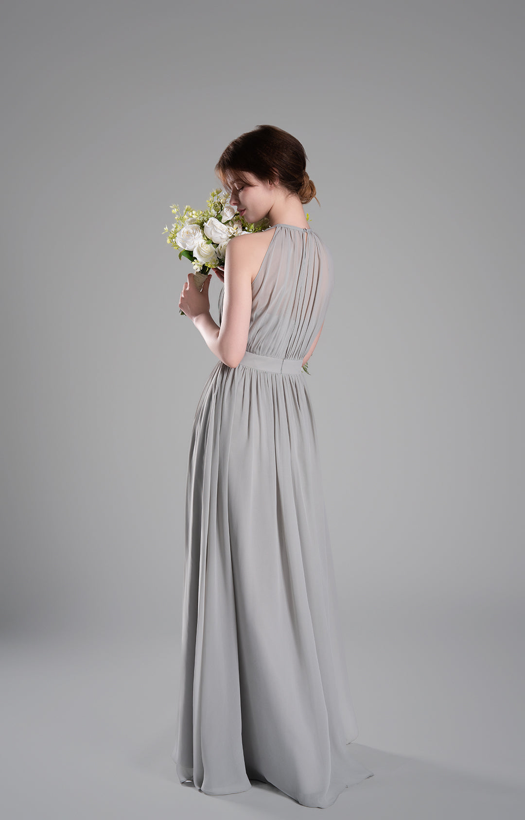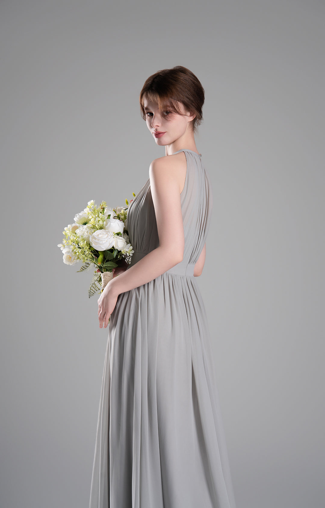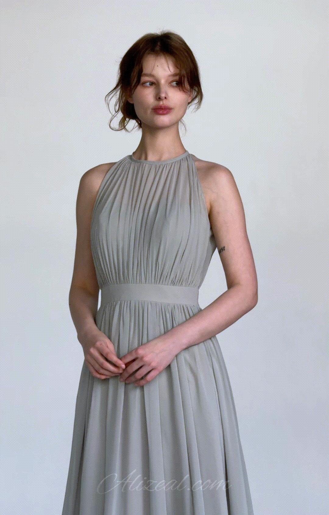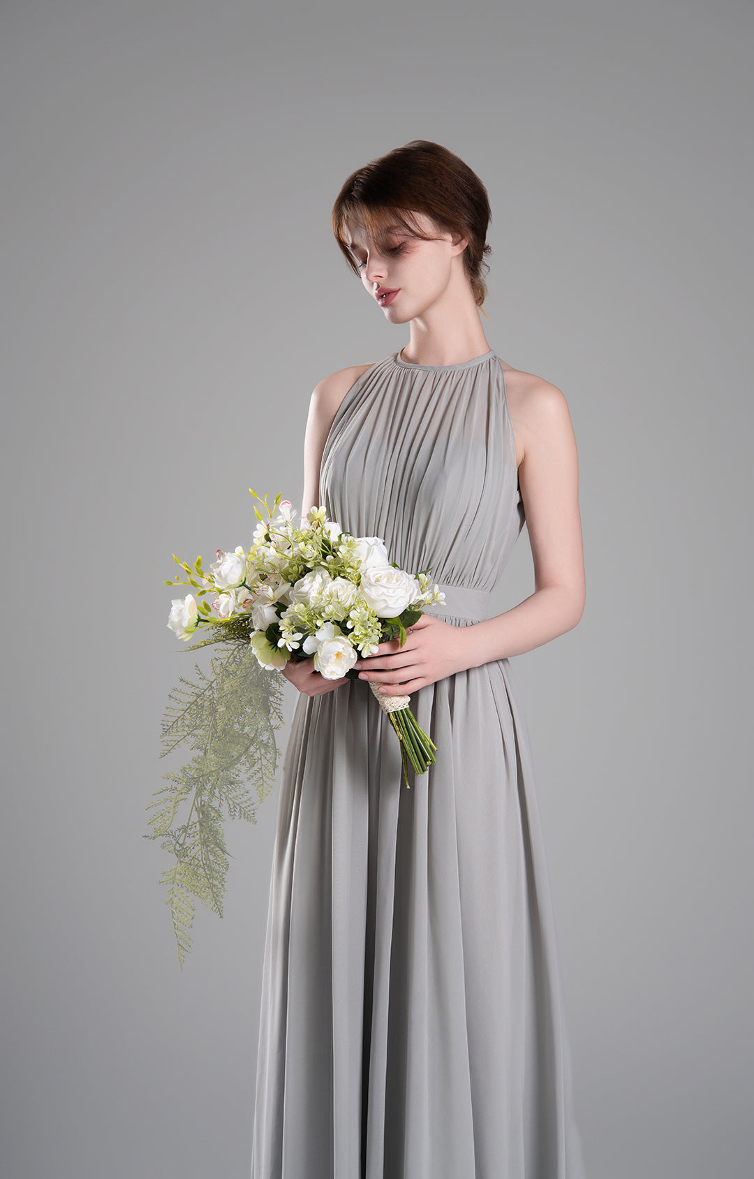 - High Halter Neckline with Delicate Pleats