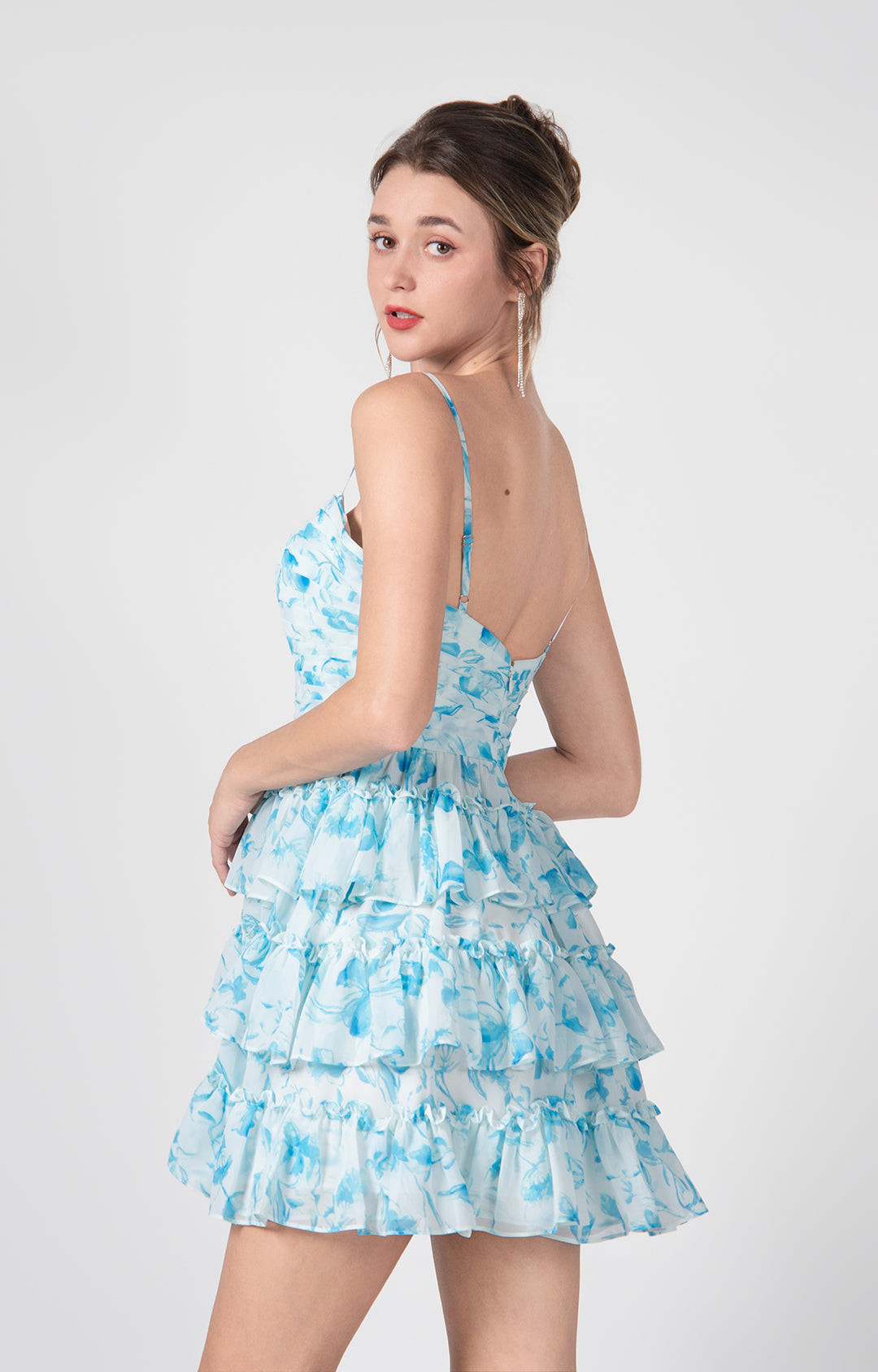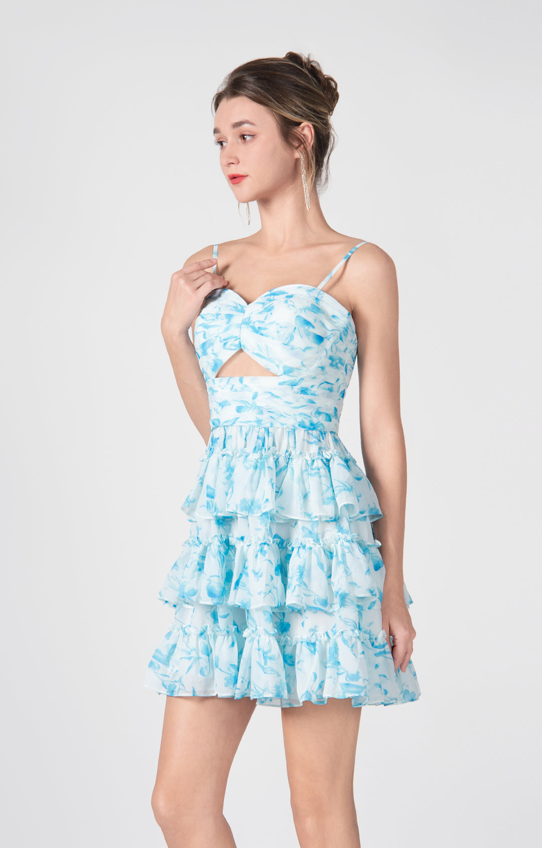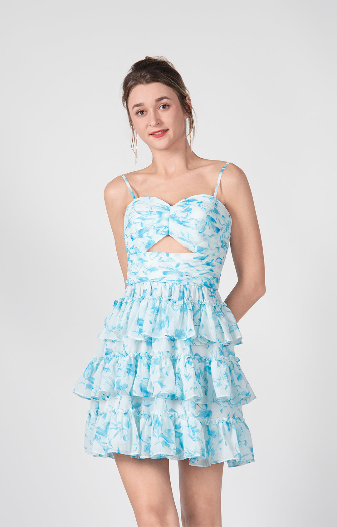 Heart Collar Spaghetti Straps Cut-Out Tiered Pleated Mini Dress