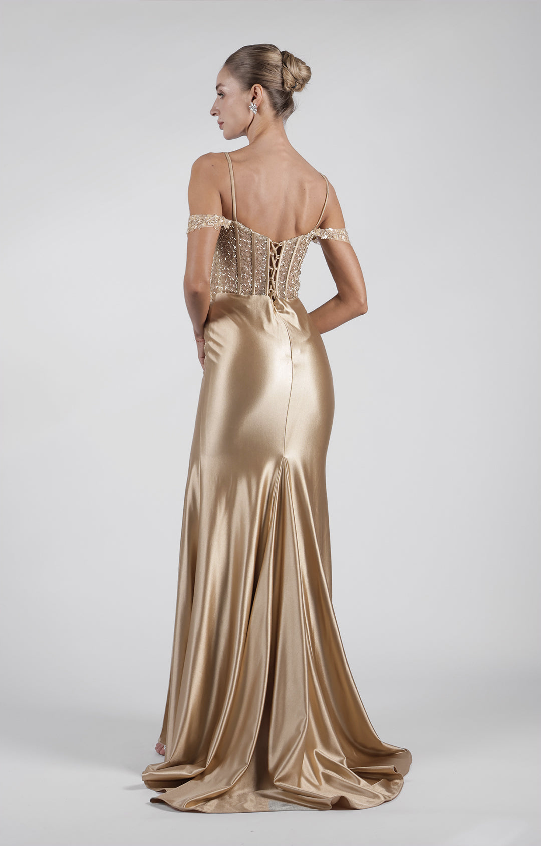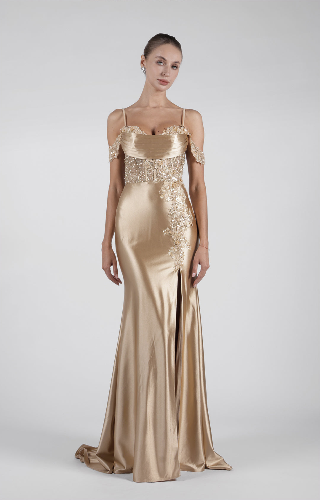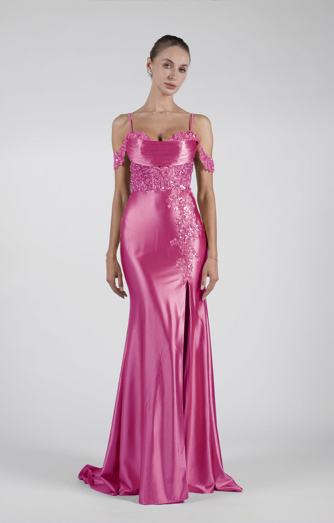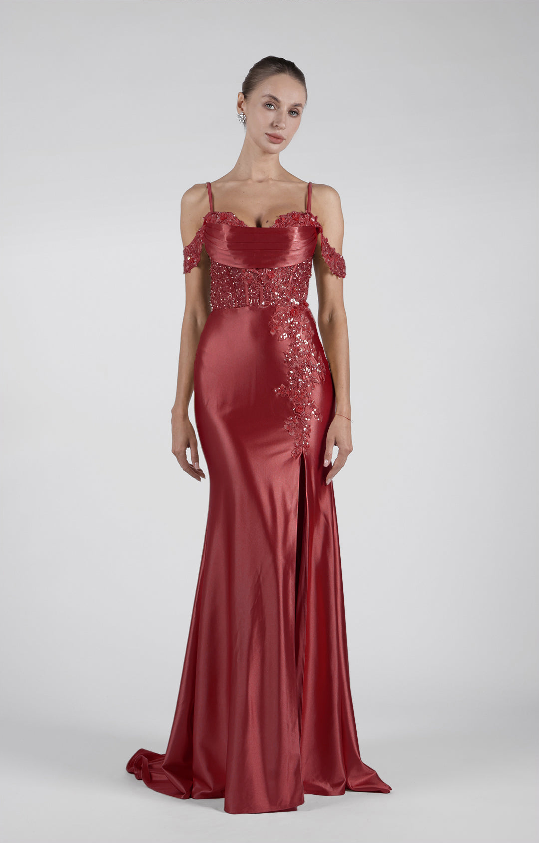 This dress is made from satin fabric, which gives it a smooth, luxurious feel and a beautiful sheen.