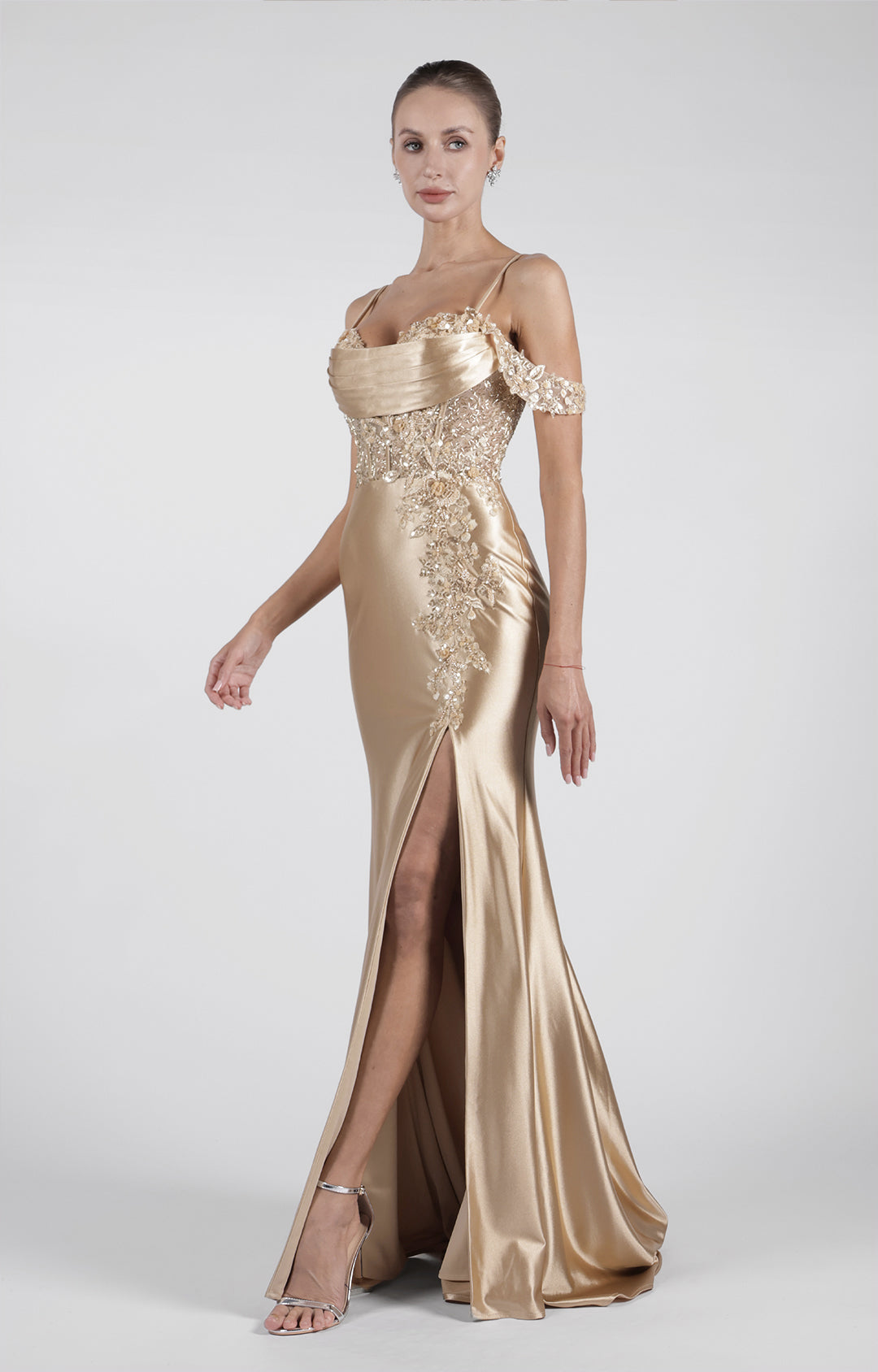 Heart Collar Cowl Neck Drop Shoulder Sleeve High Side Split Evening Dress