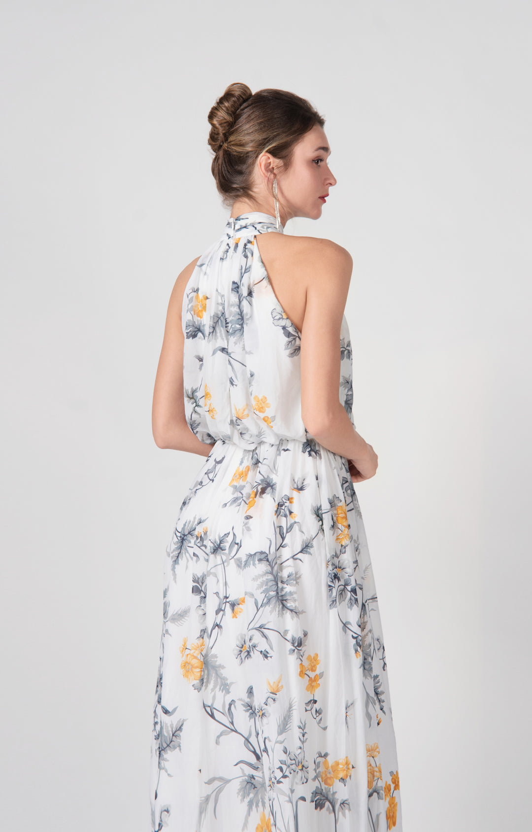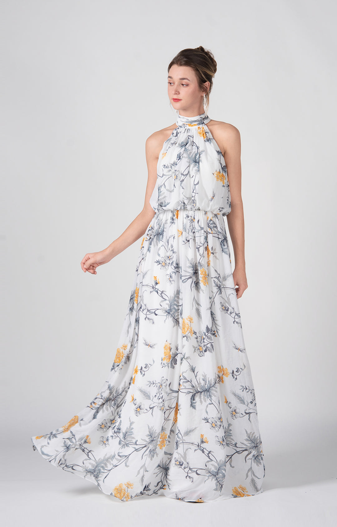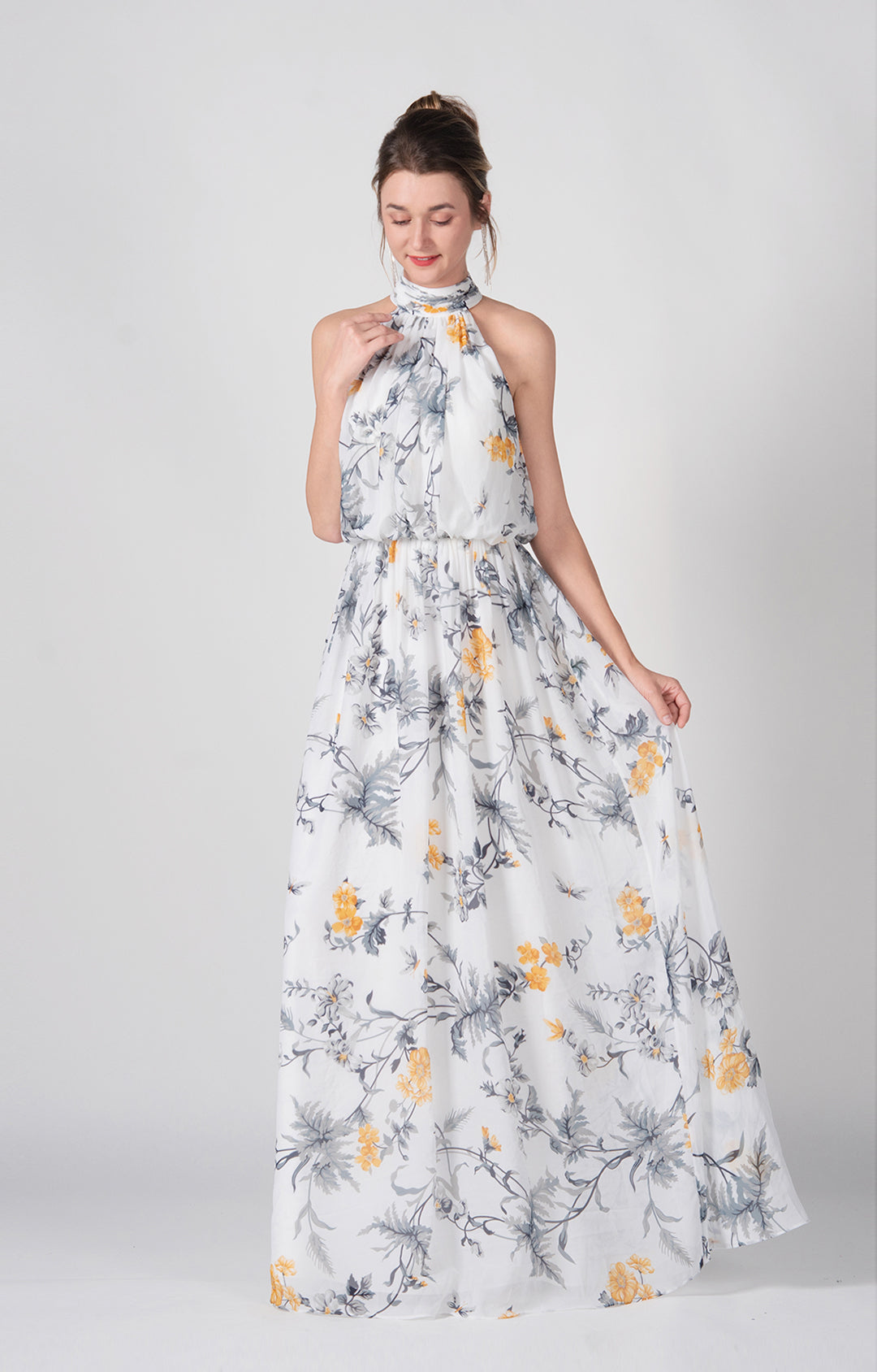 High Halter A-Line Pleated Flowy Hemline Maxi Dress