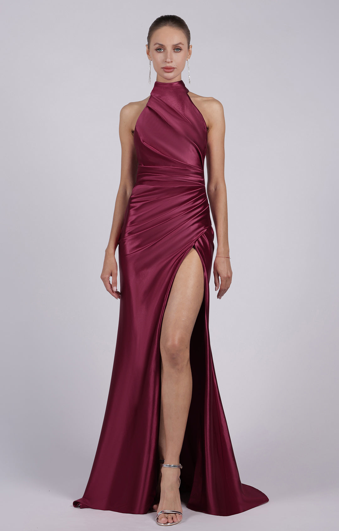 Crafted from premium stretch satin fabric, this gown offers a luxurious feel with a smooth and glossy finish.