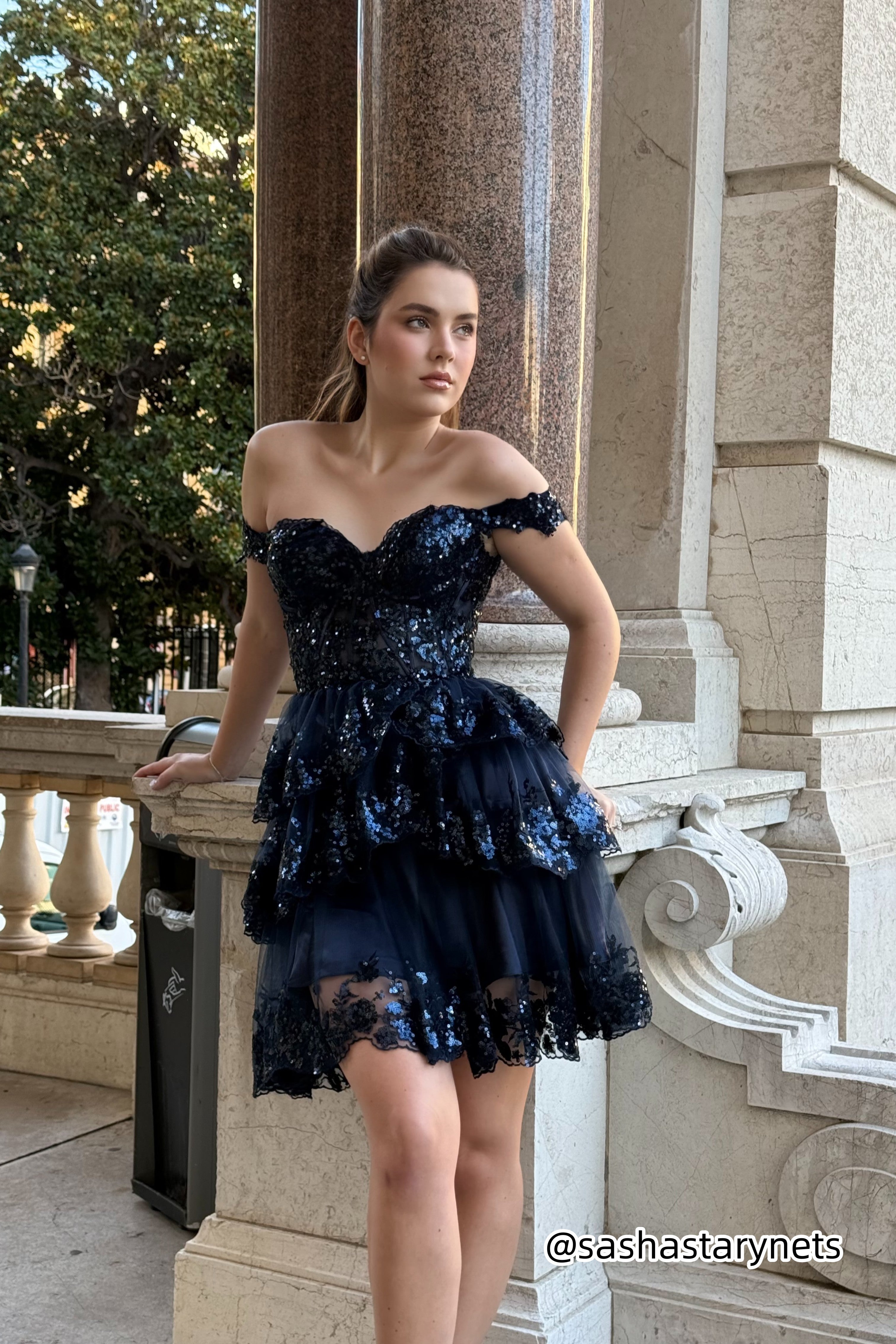 This gown combines delicate lace and sparkling sequins for a look of luxury and elegance.