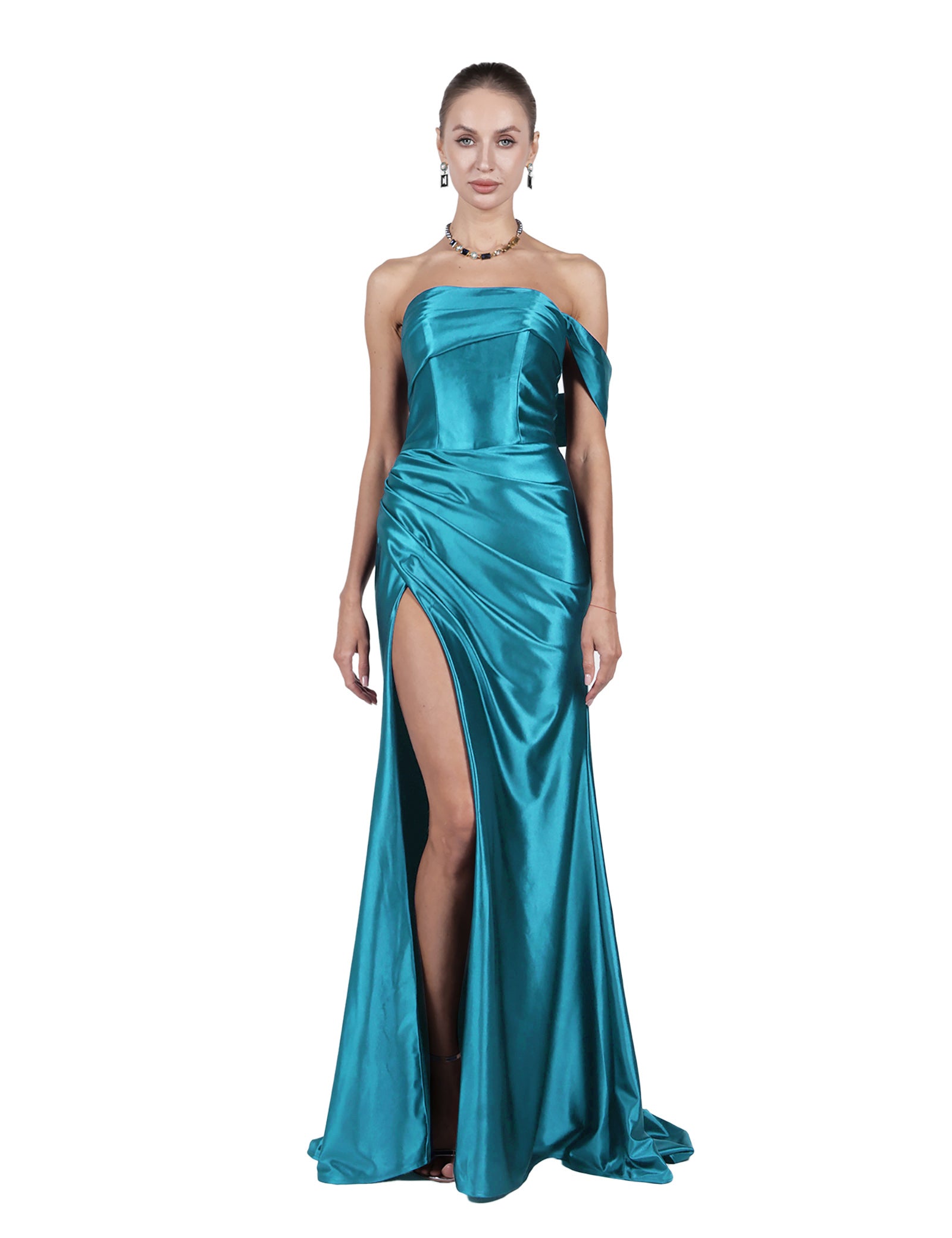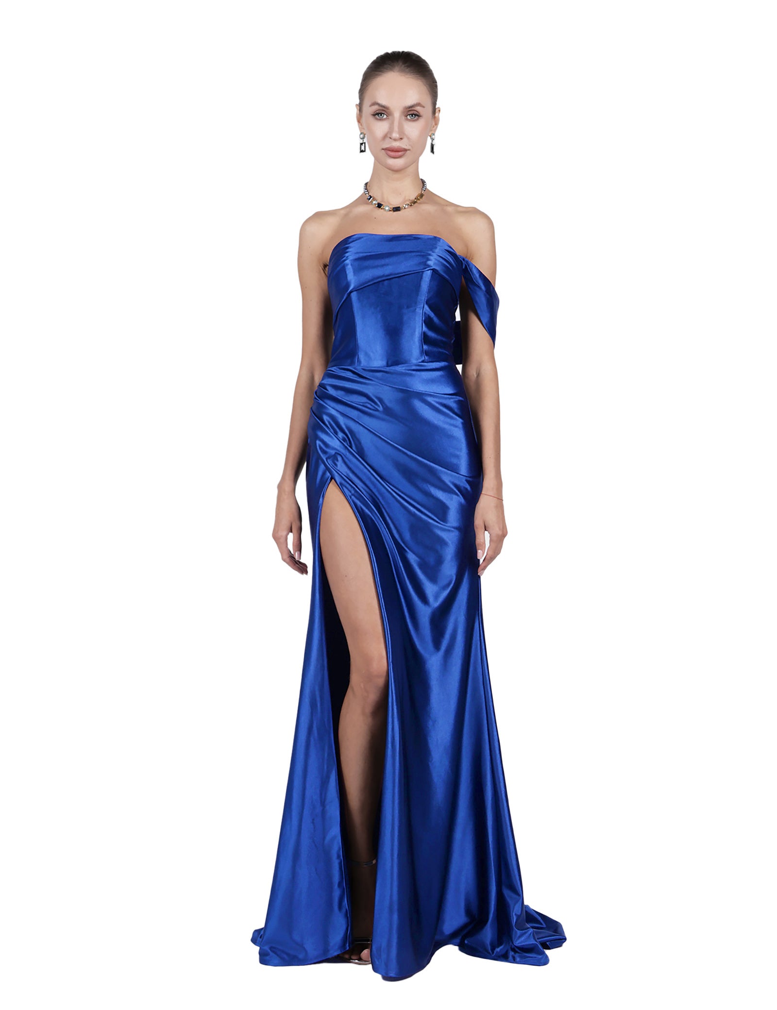 Off-Shoulder Pleated Satin High Split Flutter Elegant Evening Dresses