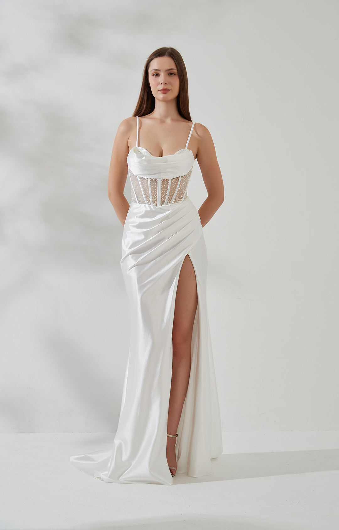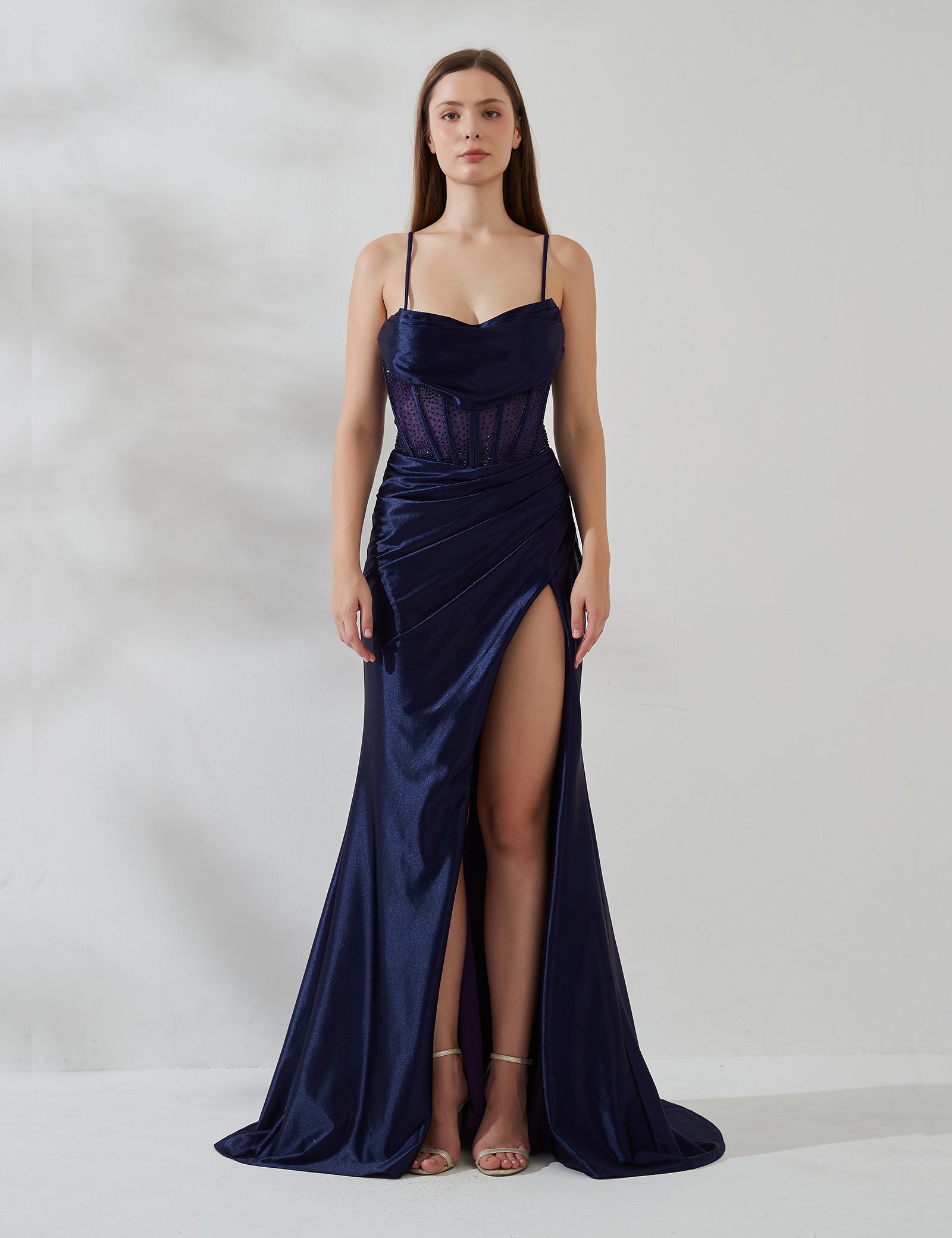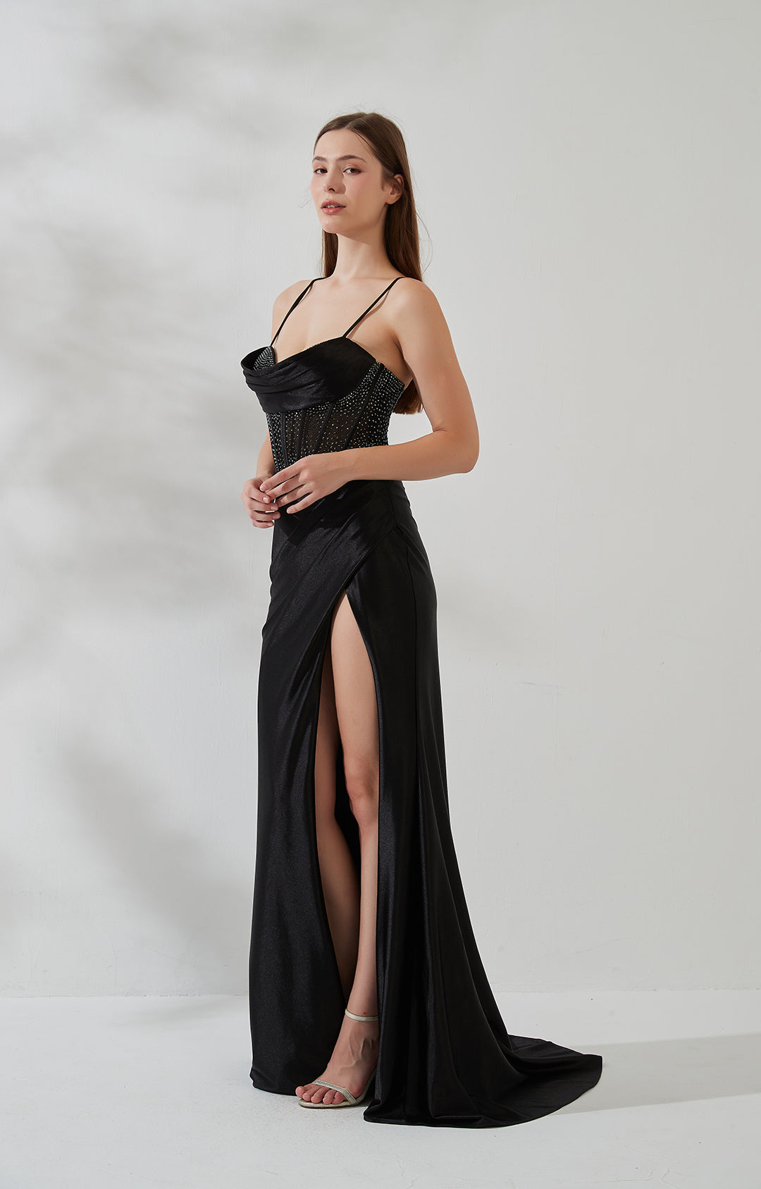 Spaghetti Strap Cowl Neck Sheer Boned Pleated Dress with Split