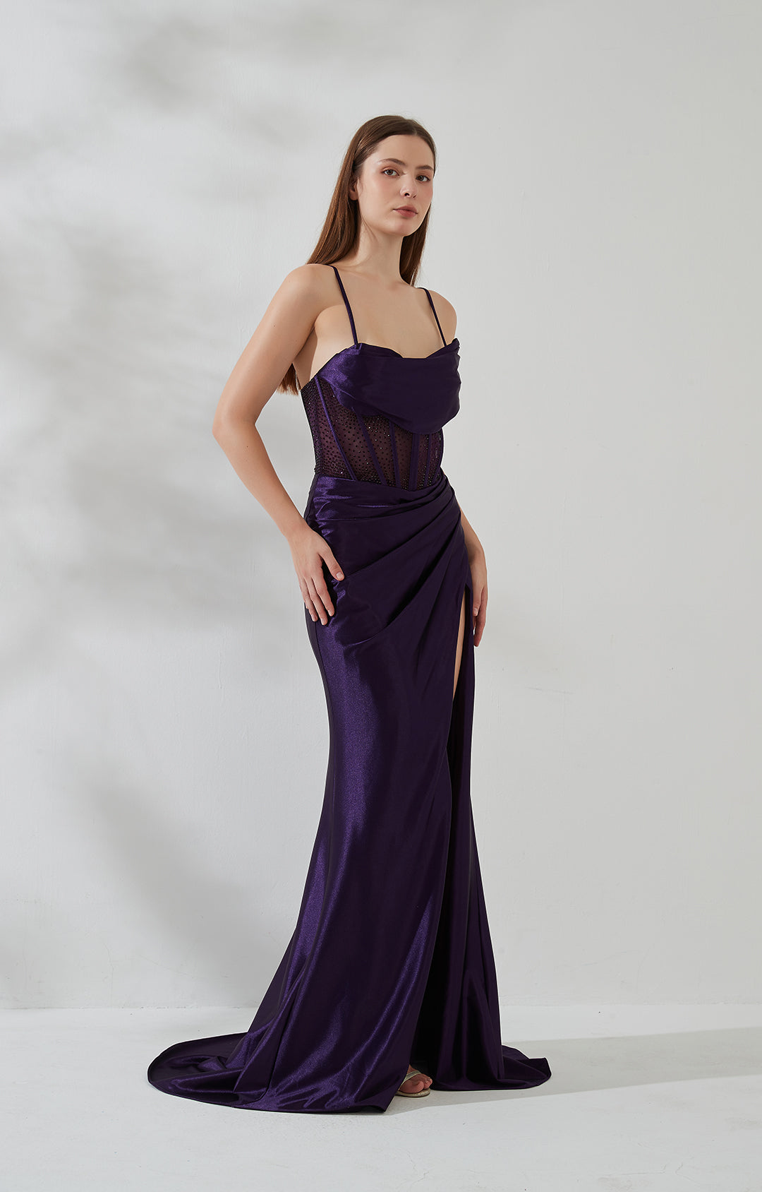 Cowl Neck Spaghetti Strap Pleated Sheer Boned Dress With Split