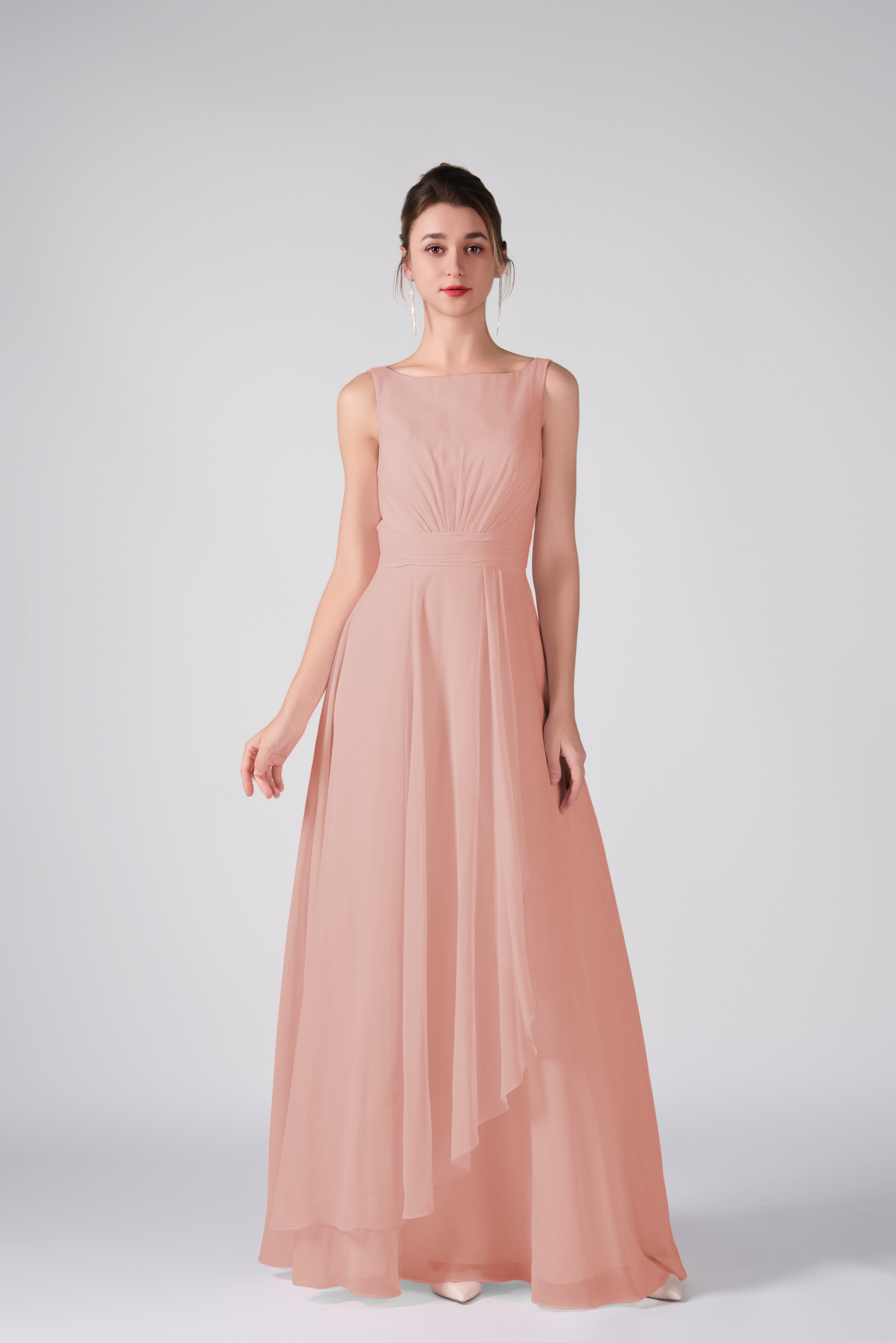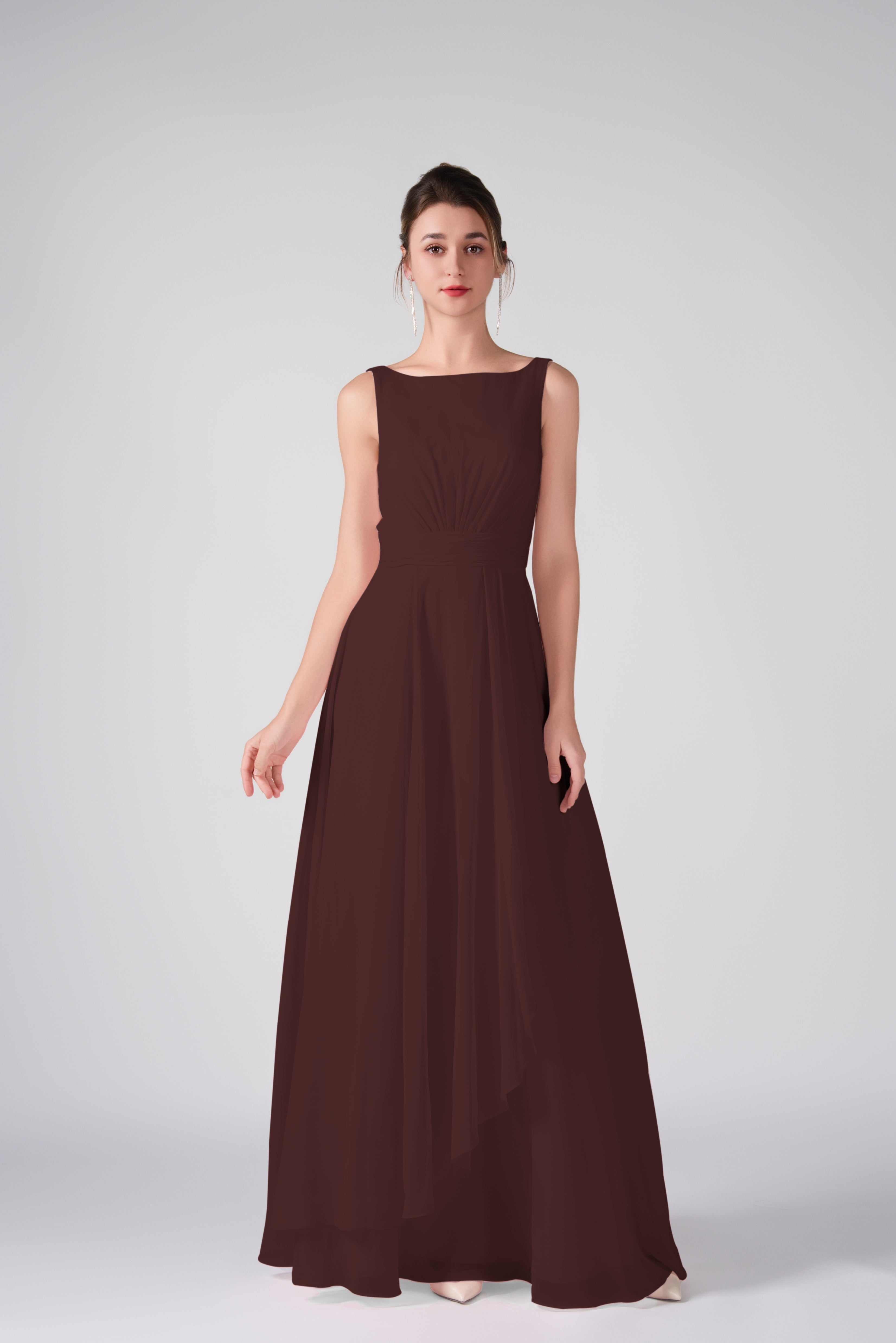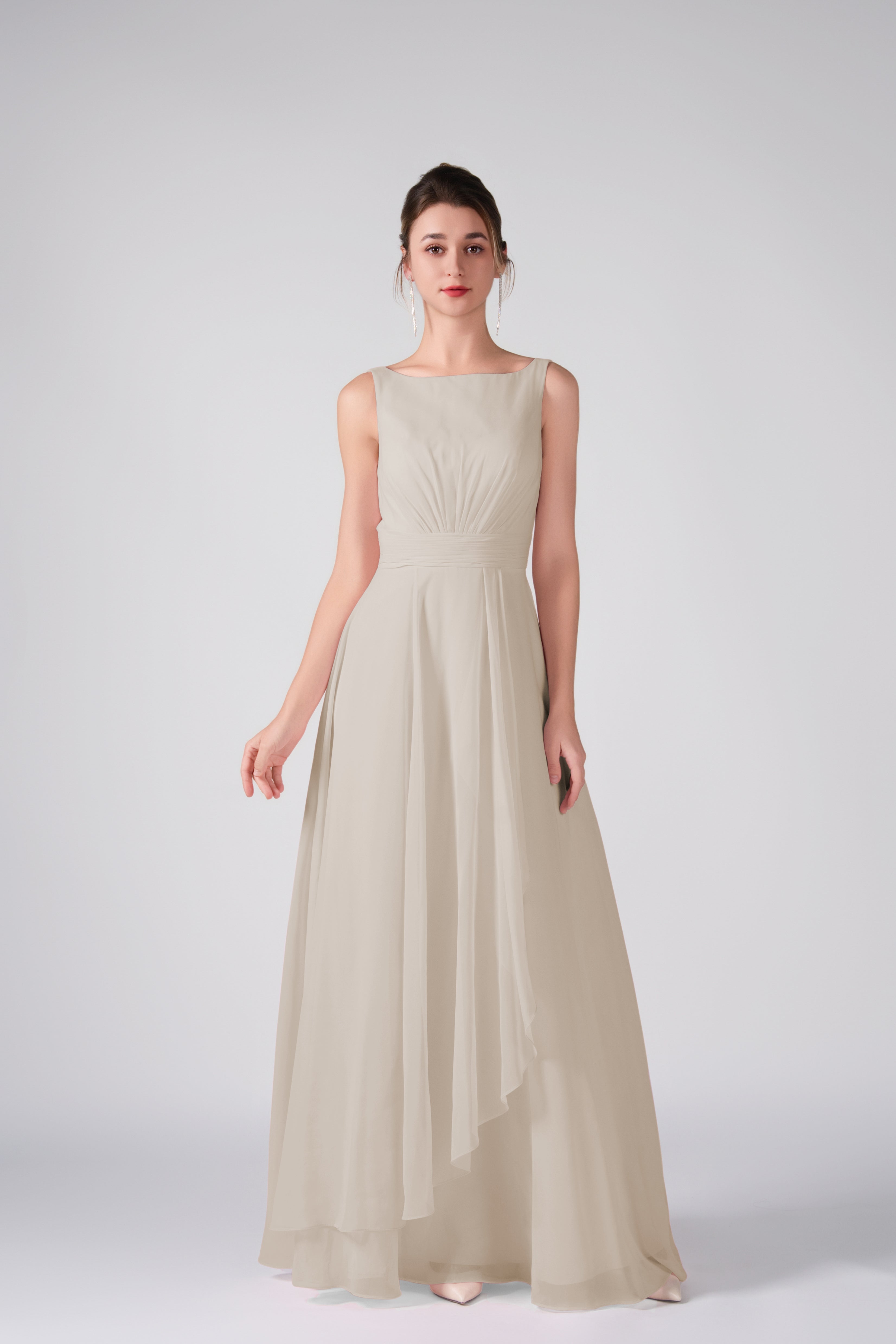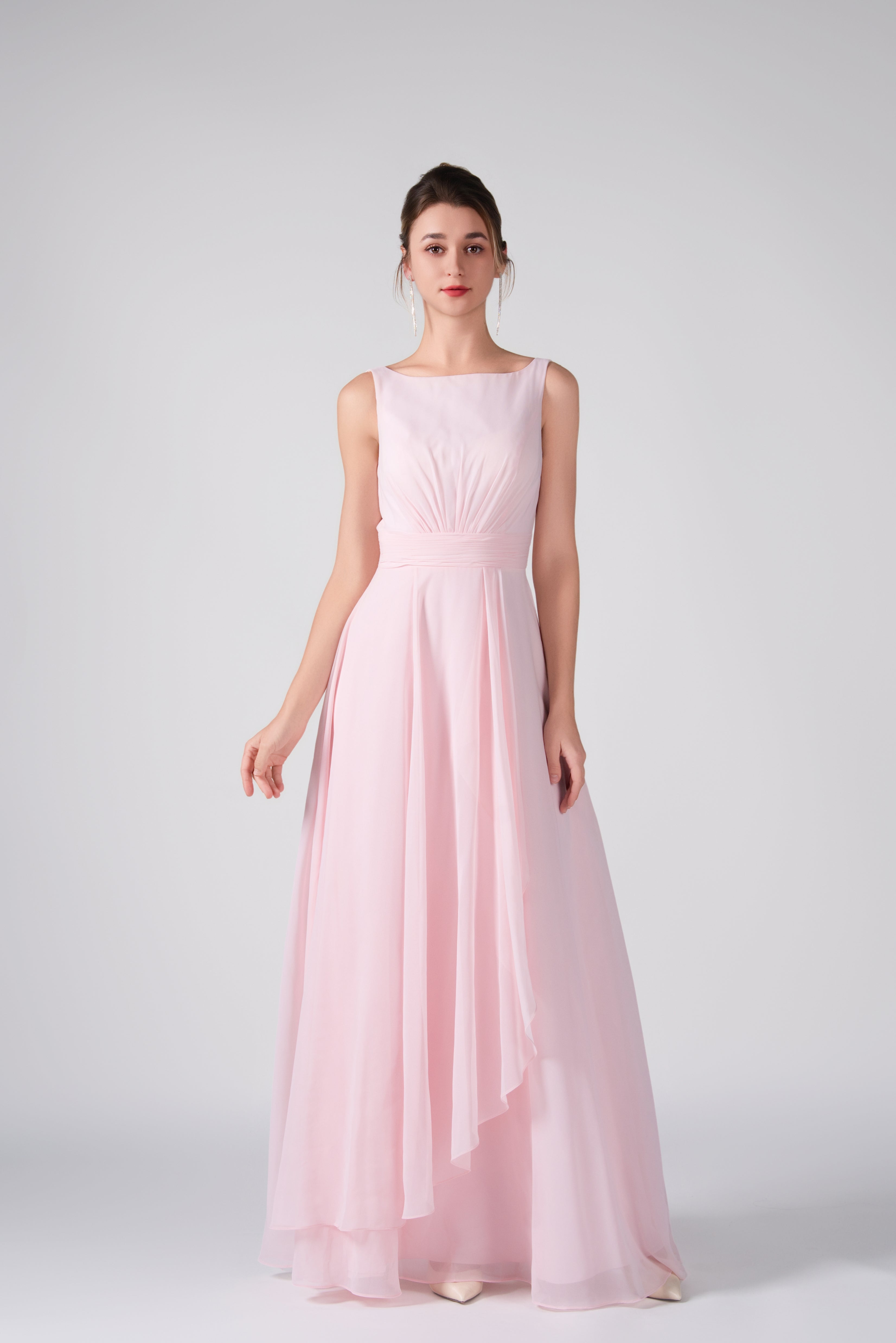 Crafted from lightweight chiffon, this dress ensures breathability and comfort while maintaining a graceful drape.