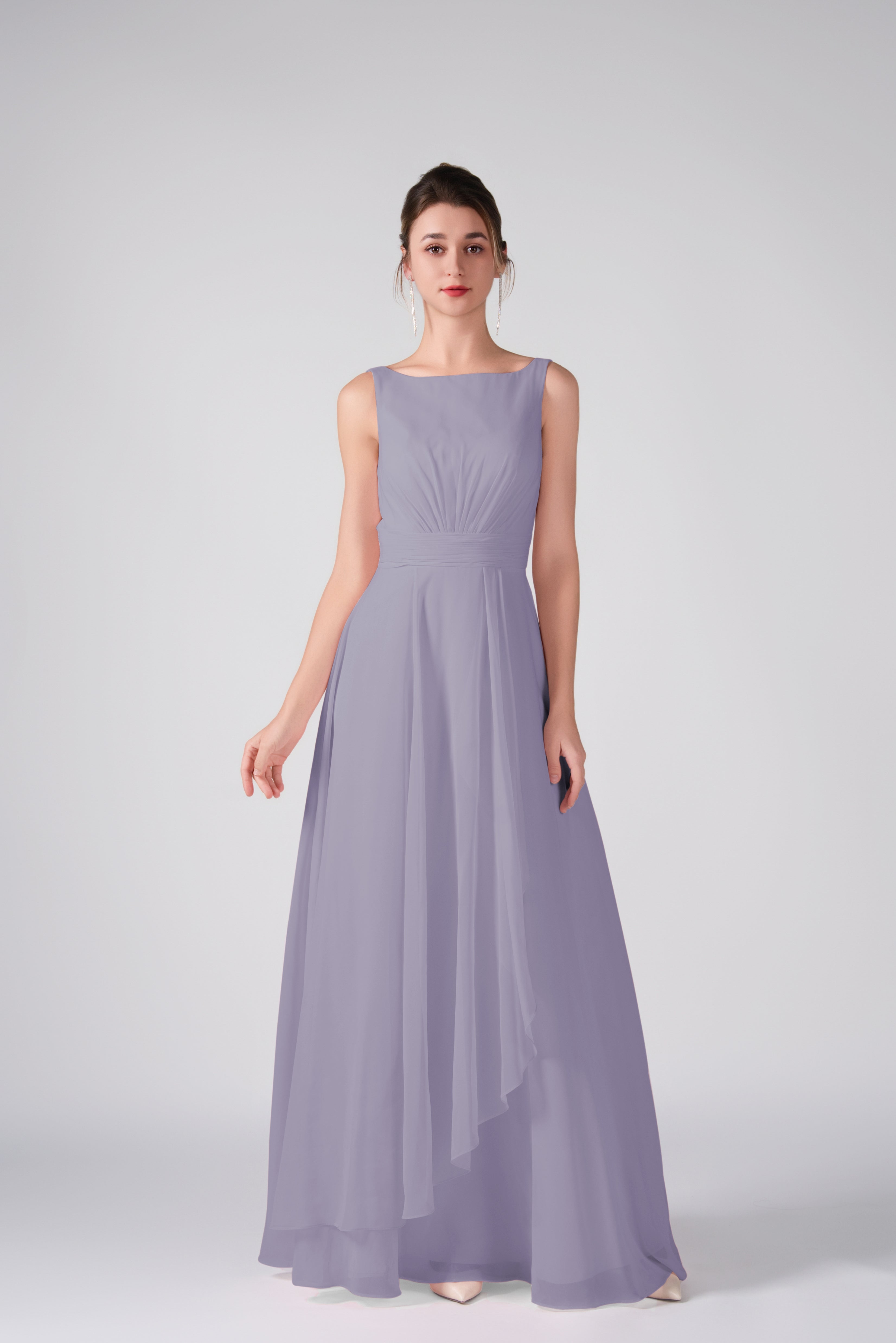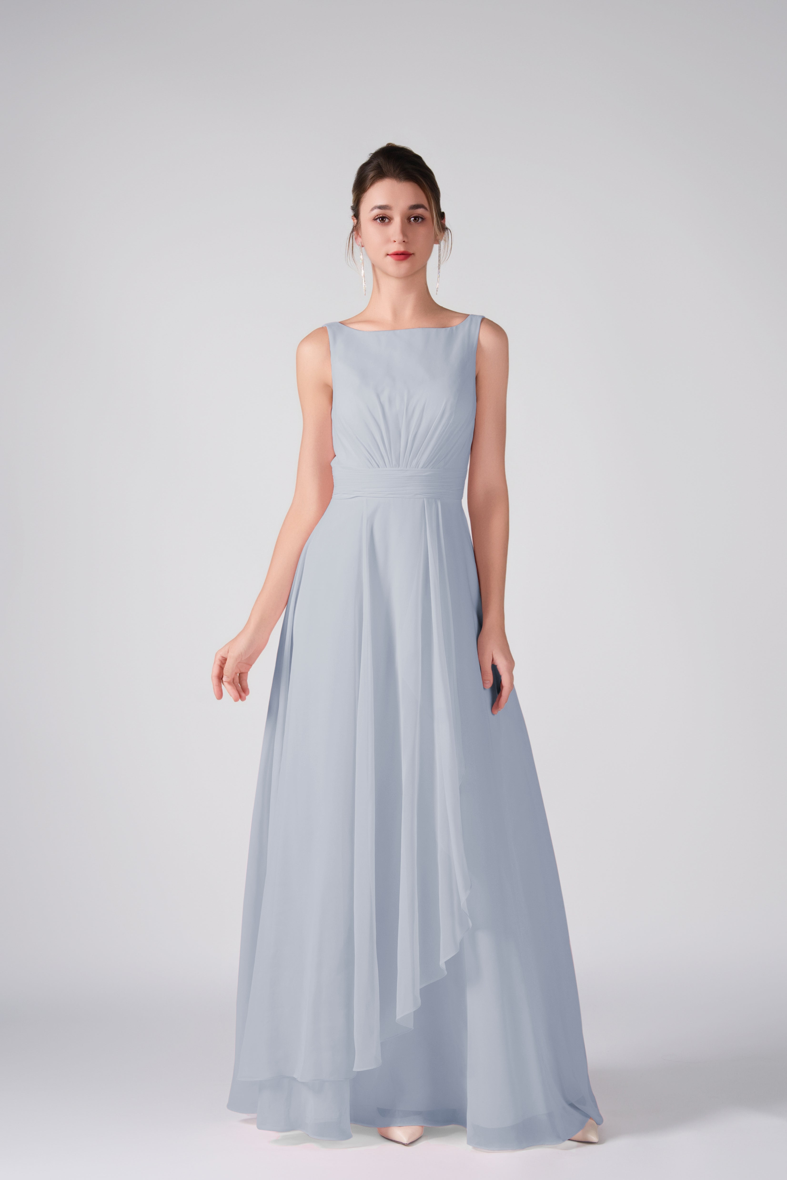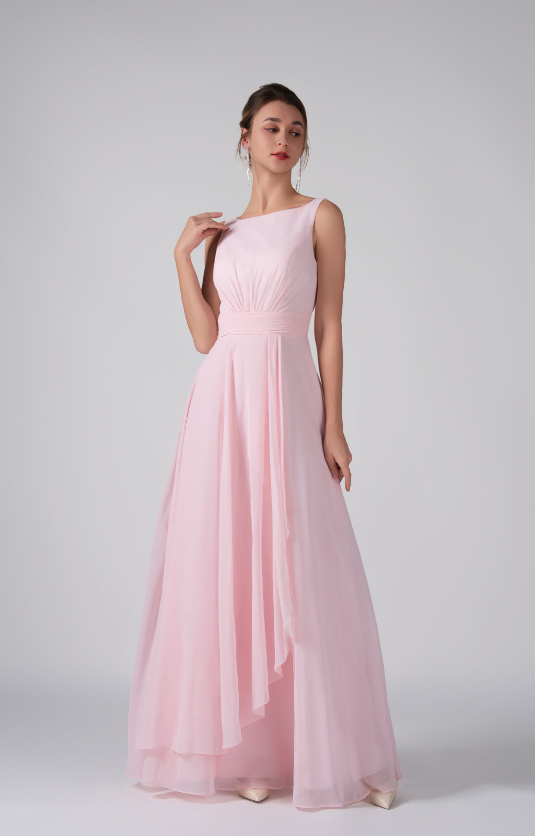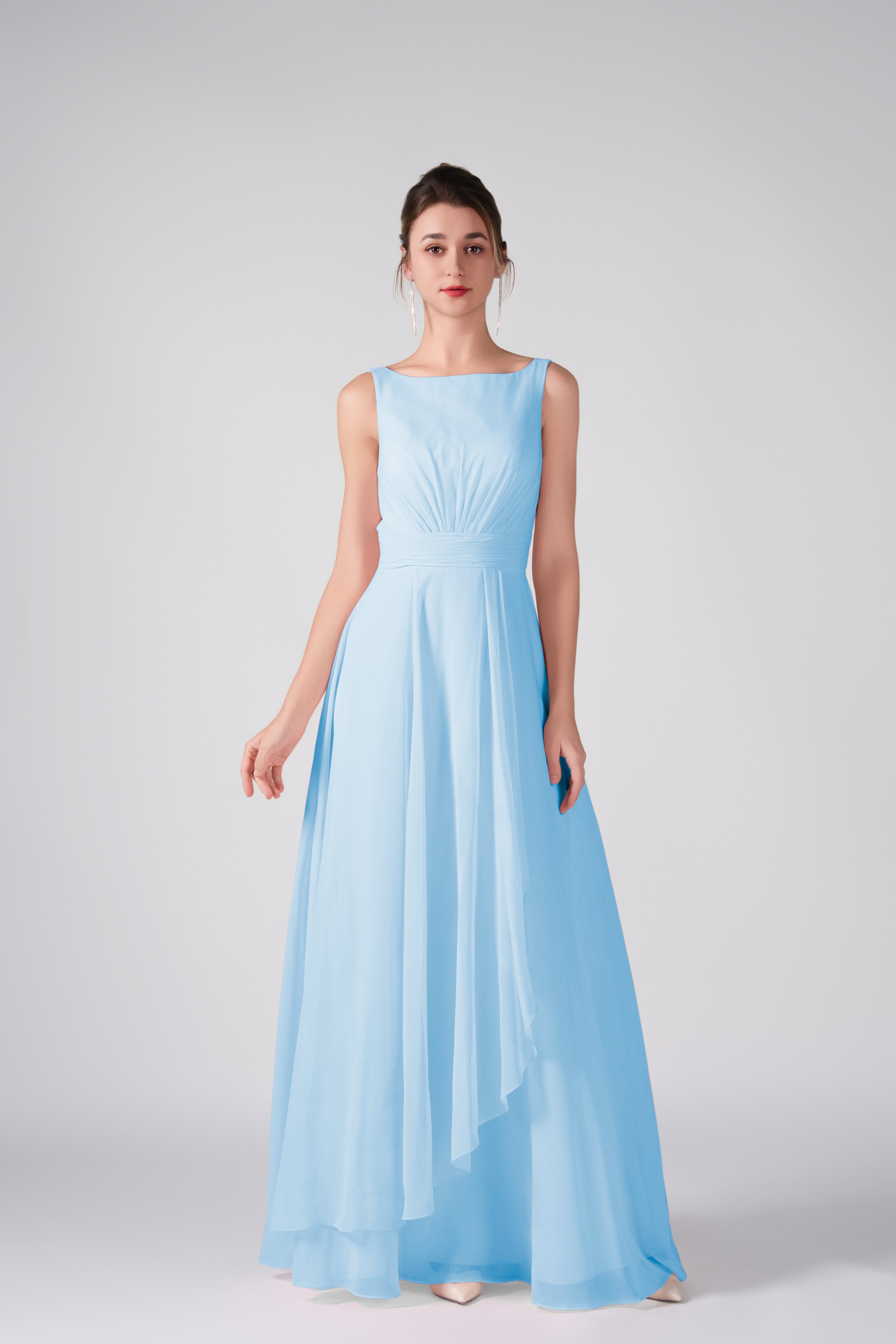 Crafted from lightweight chiffon, this dress ensures breathability and comfort while maintaining a graceful drape.