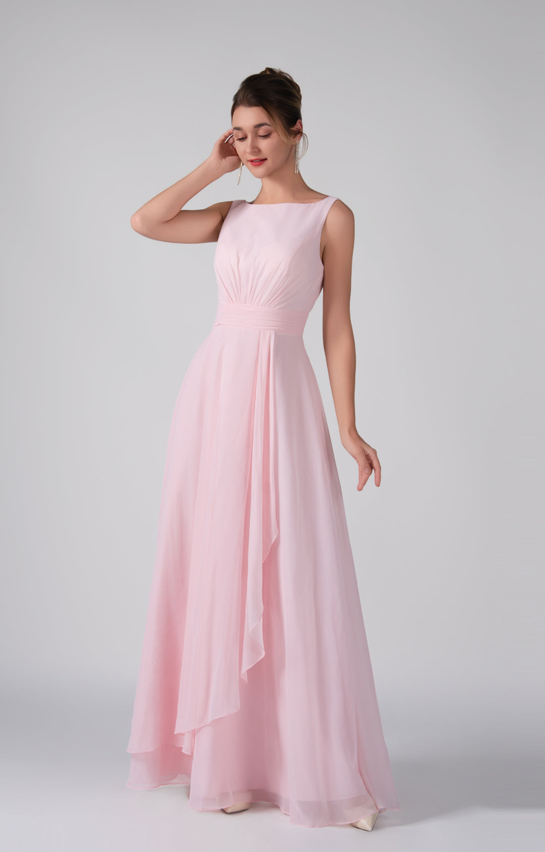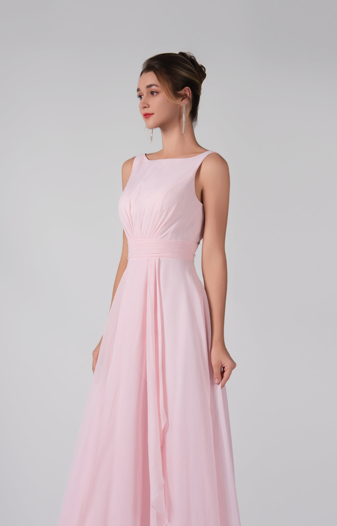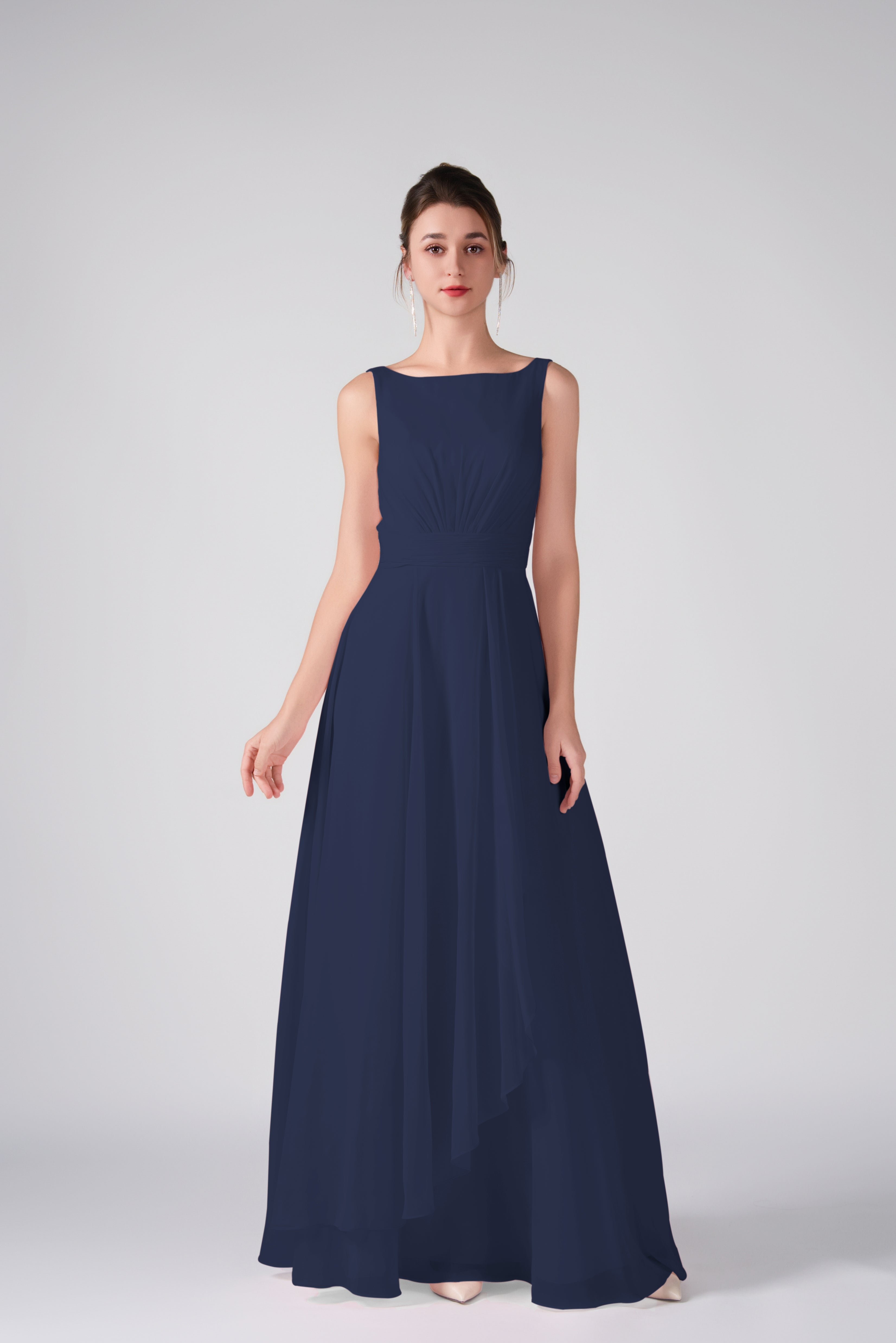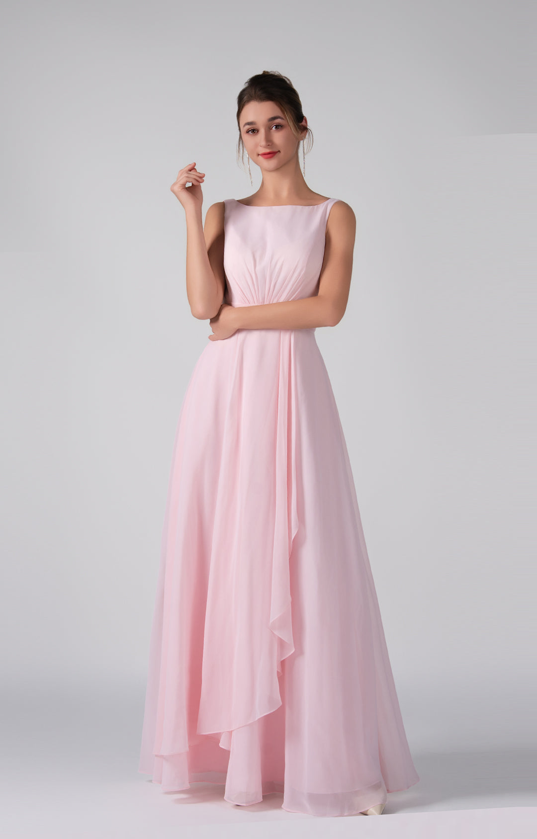 Crafted from lightweight chiffon, this dress ensures breathability and comfort while maintaining a graceful drape.