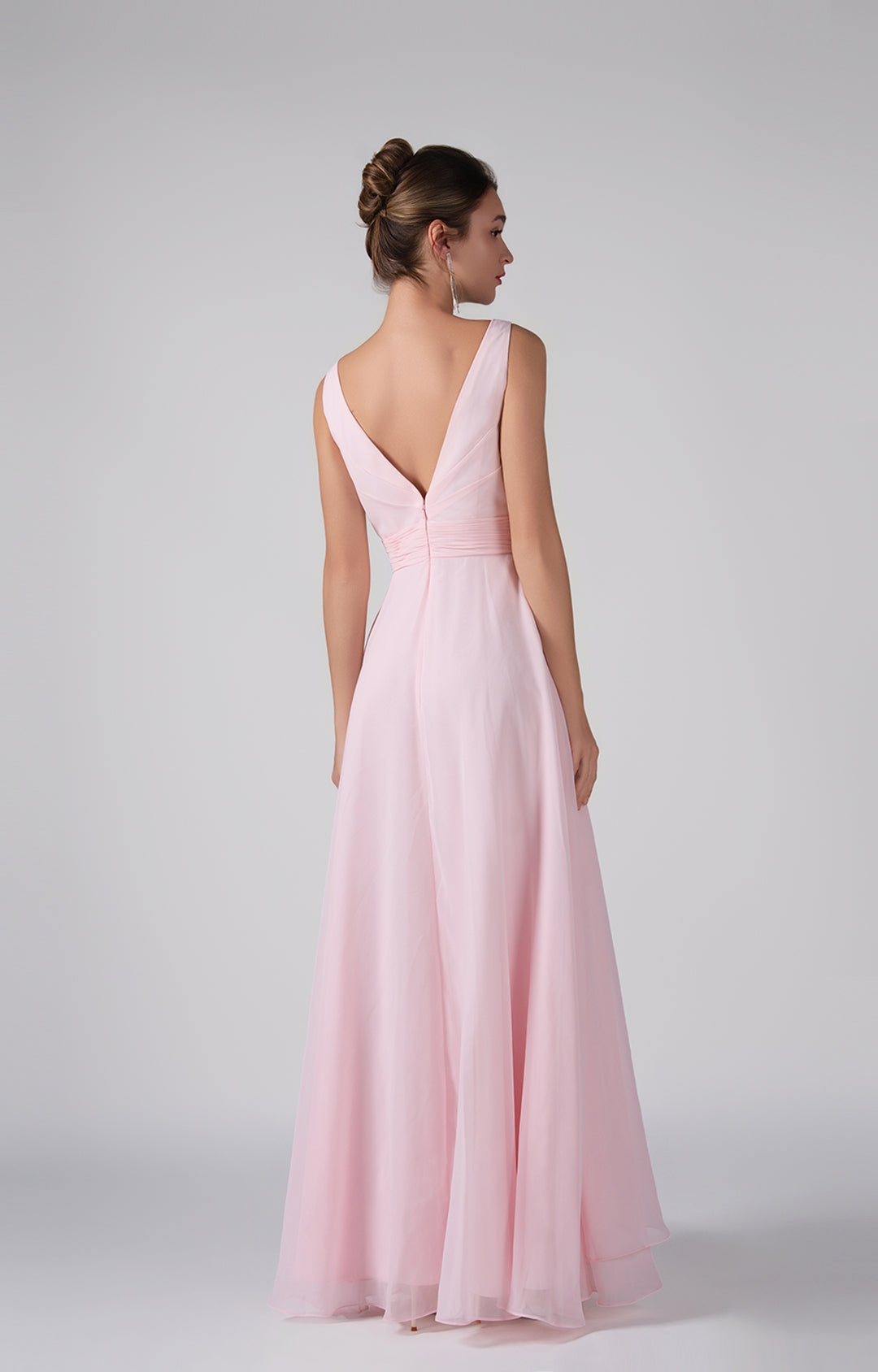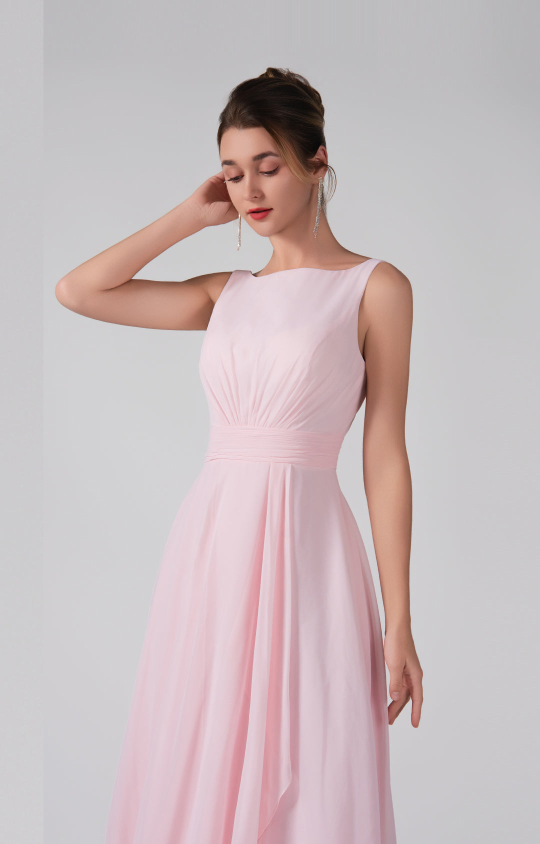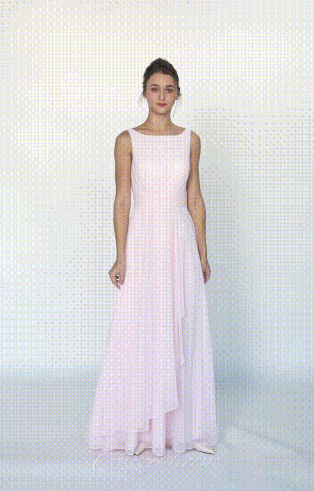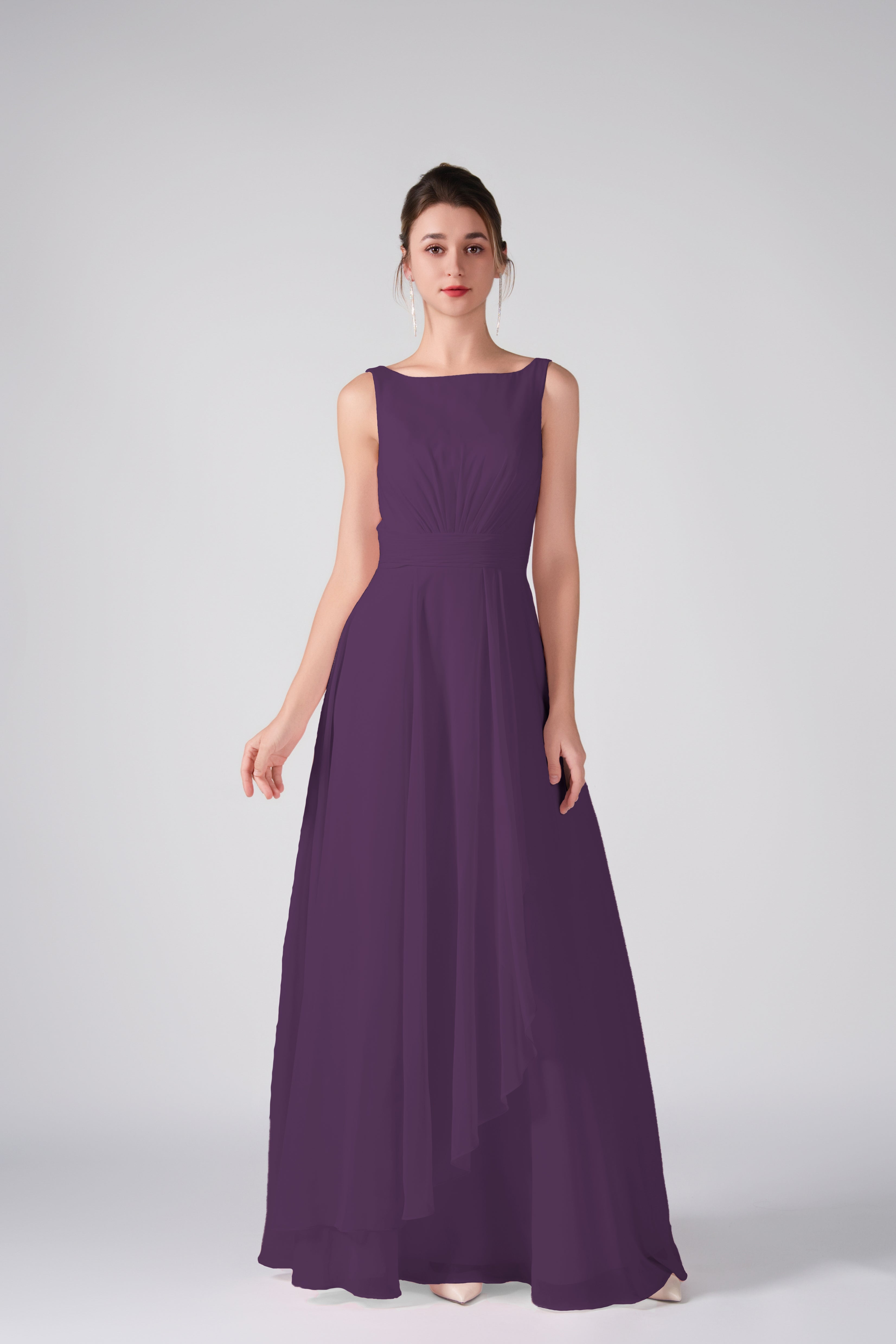 Crafted from lightweight chiffon, this dress ensures breathability and comfort while maintaining a graceful drape.