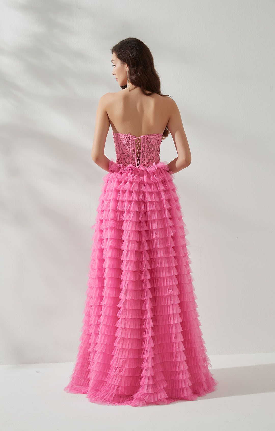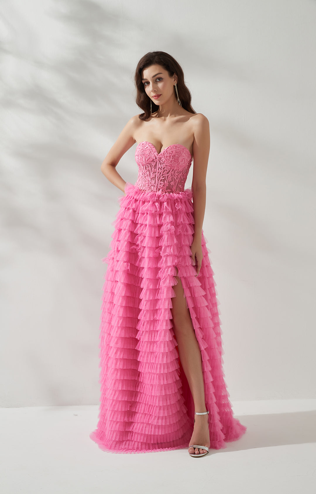 Strapless Lace Bodice Split Tulle Tiered Floor Length Dress