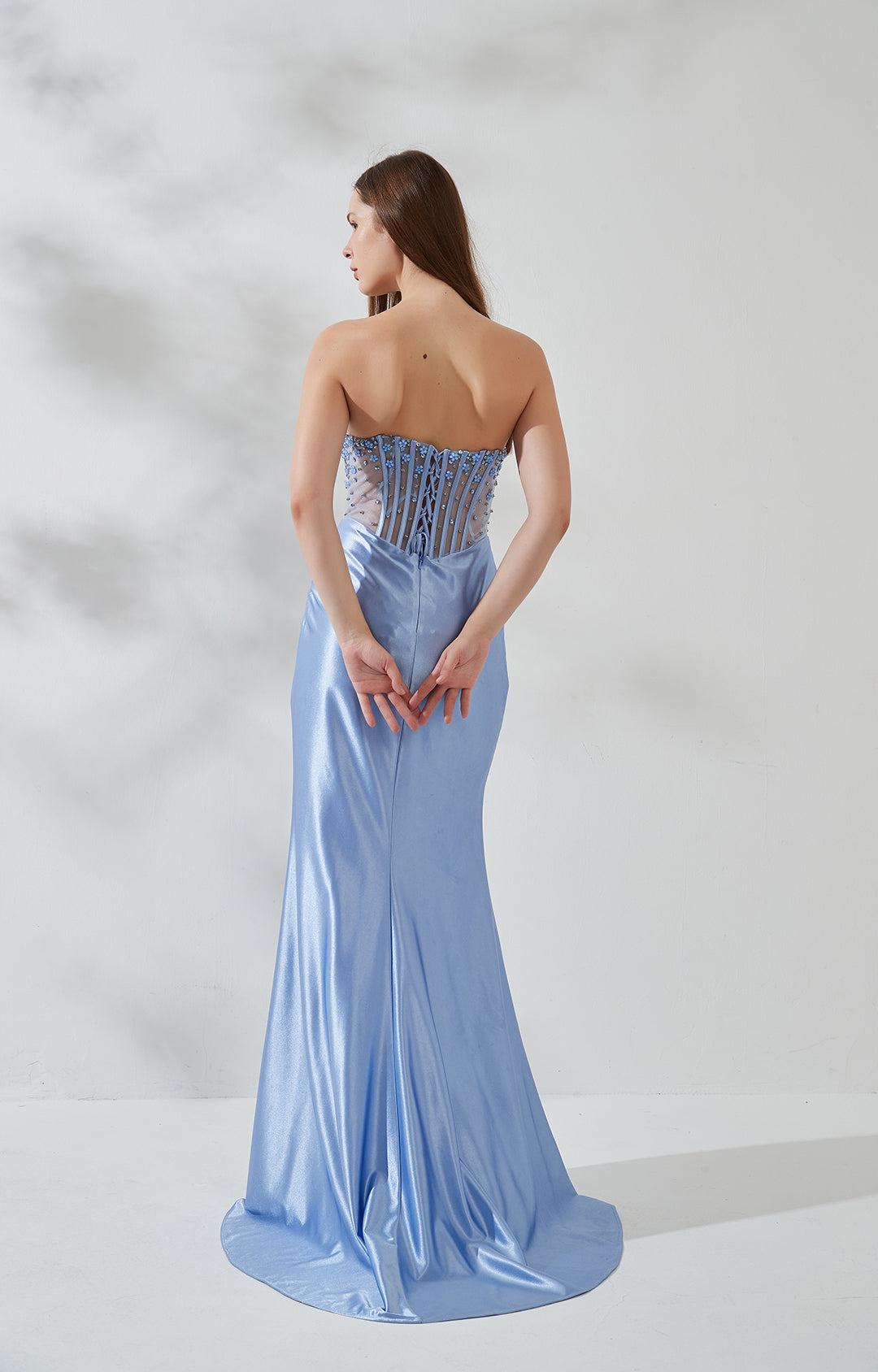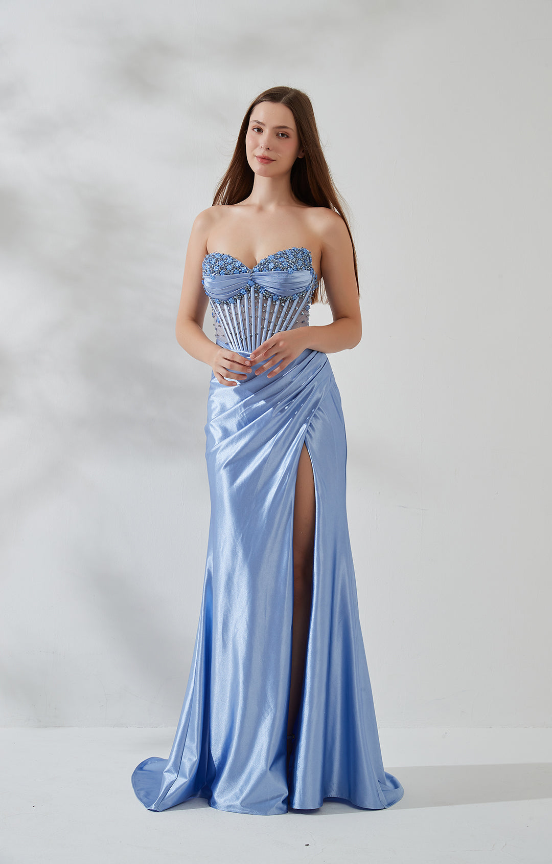 Strapless Sweetheart Beaded Boning Sheer Satin Split Prom Dress