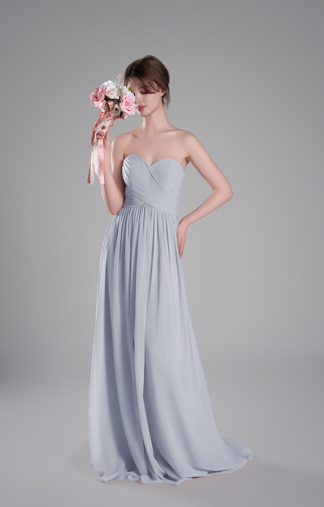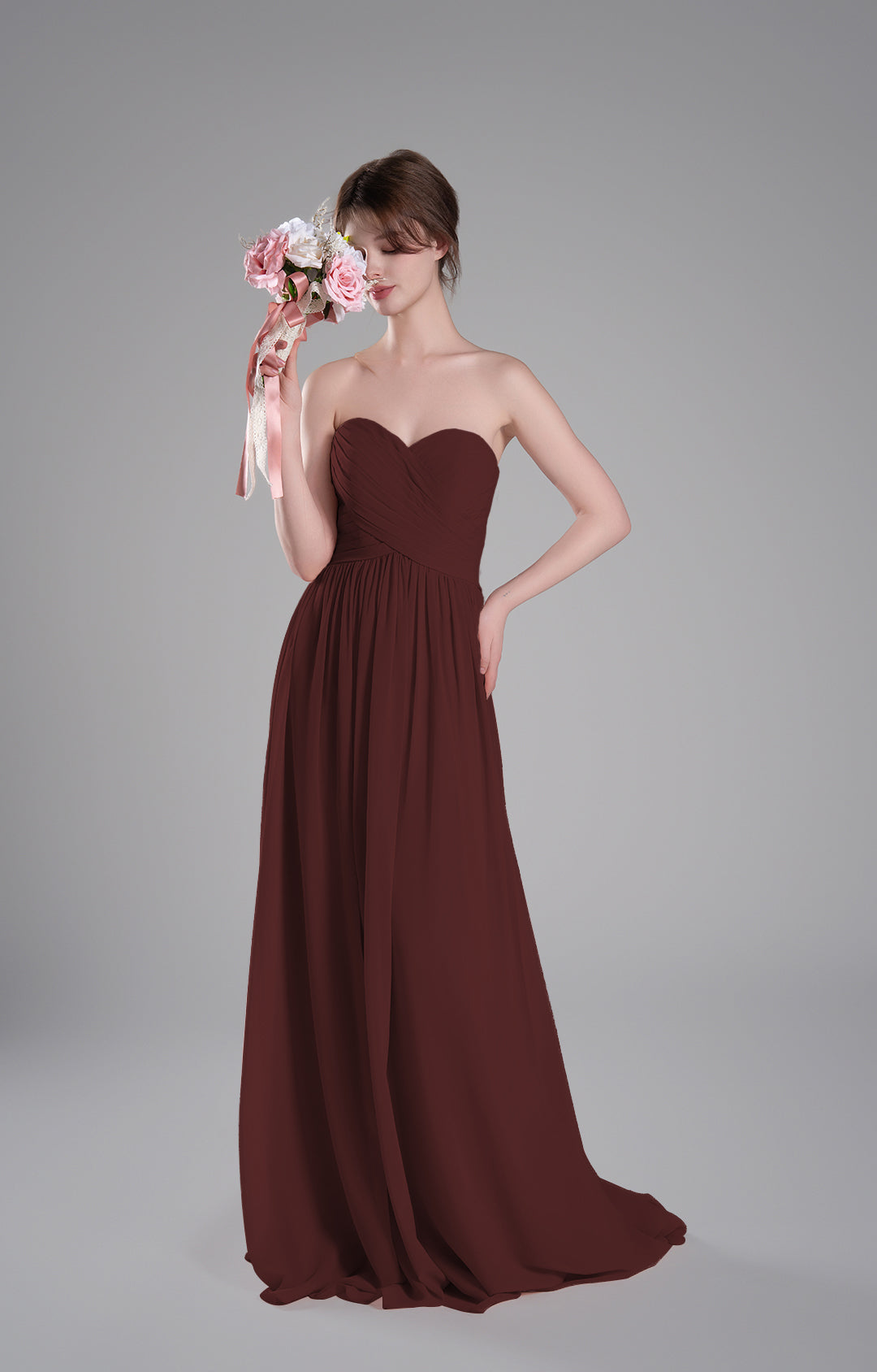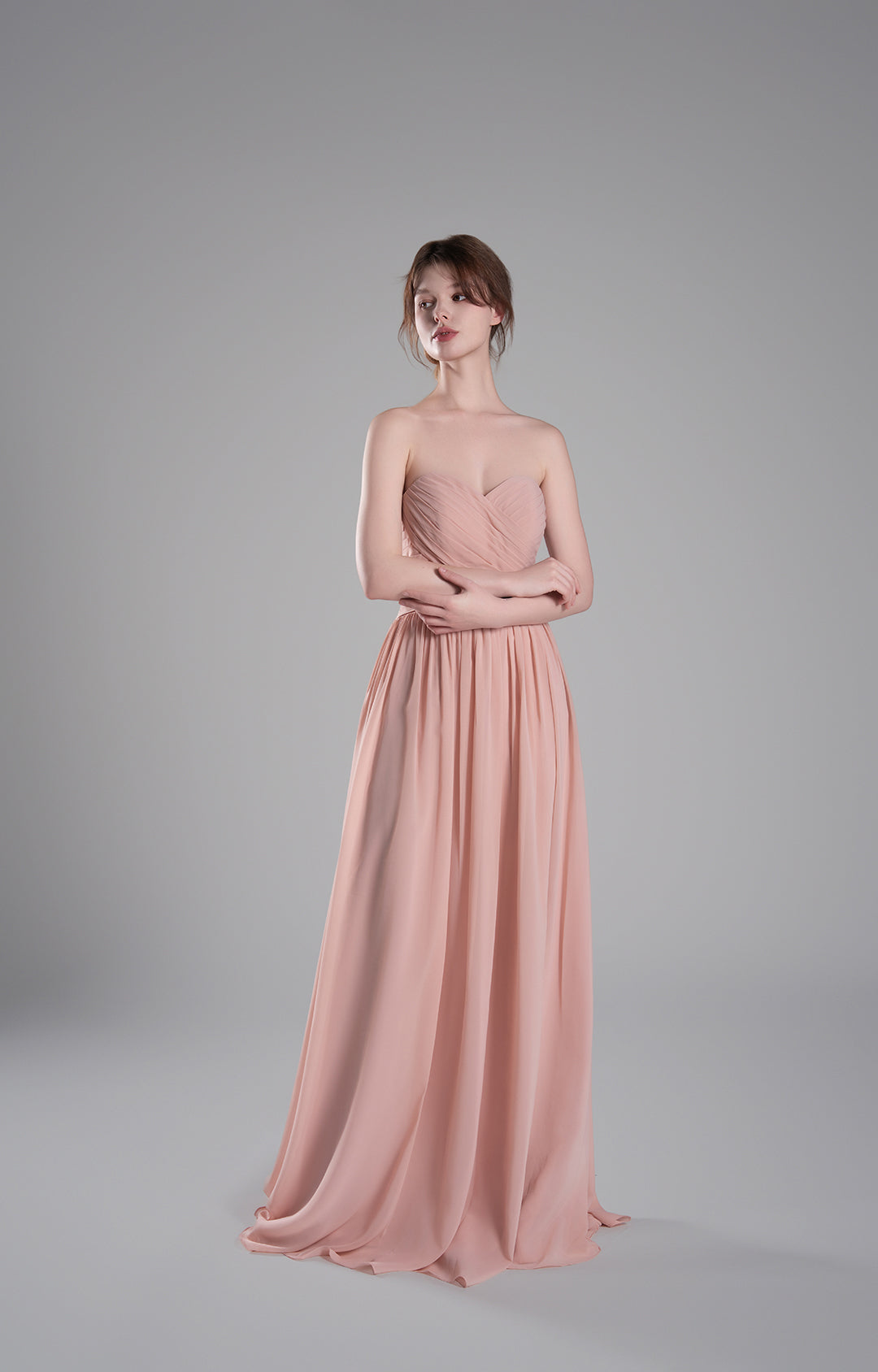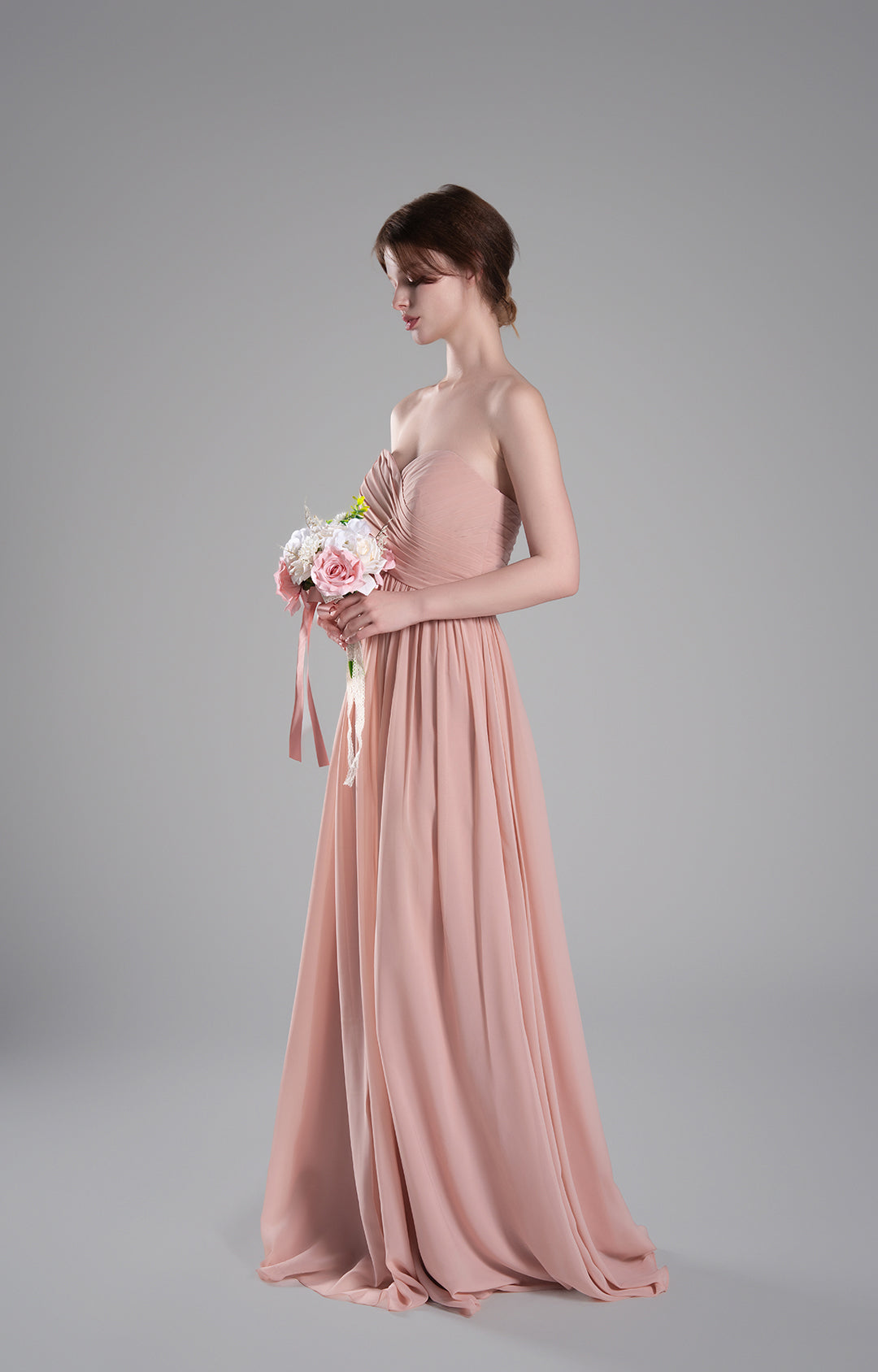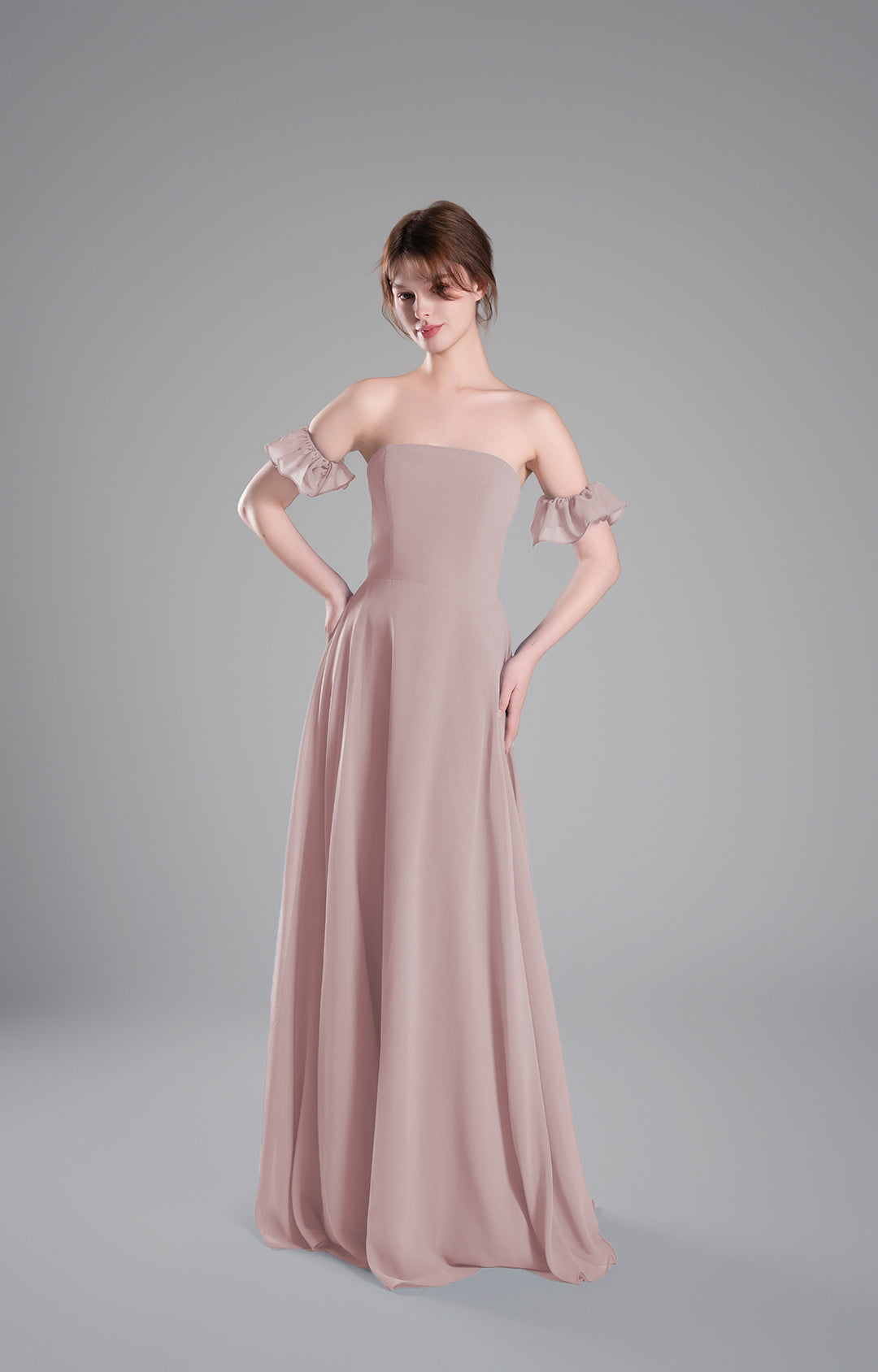 Made from luxurious chiffon fabric, this gown is lightweight, airy, and elegantly drapes to create a flowing and graceful silhouette. The soft texture ensures all-day comfort, making it ideal for formal occasions.