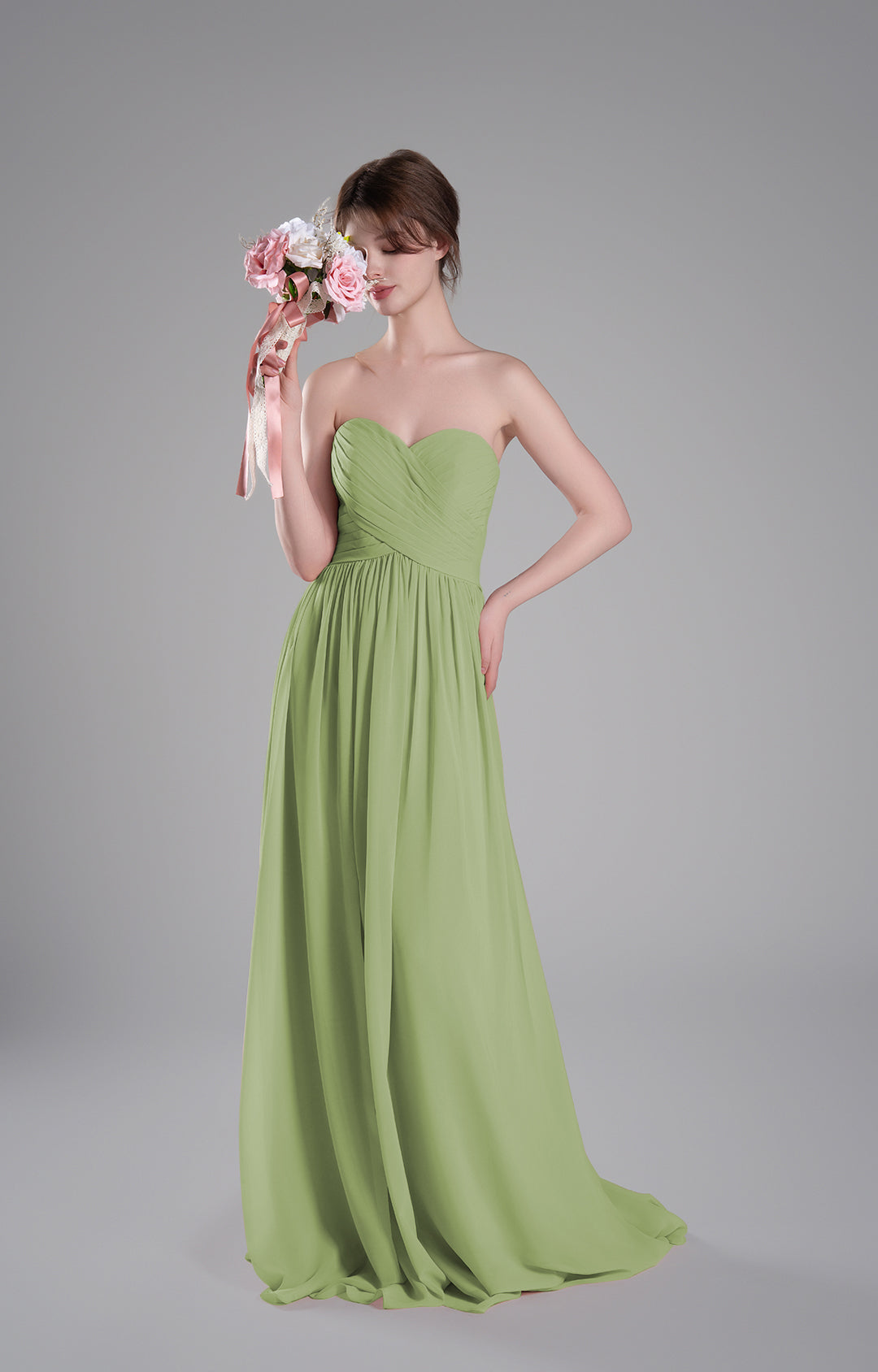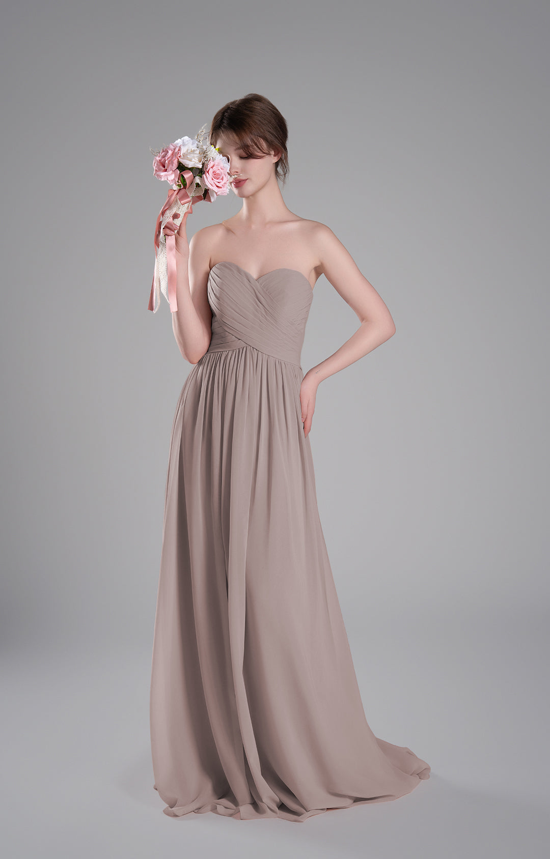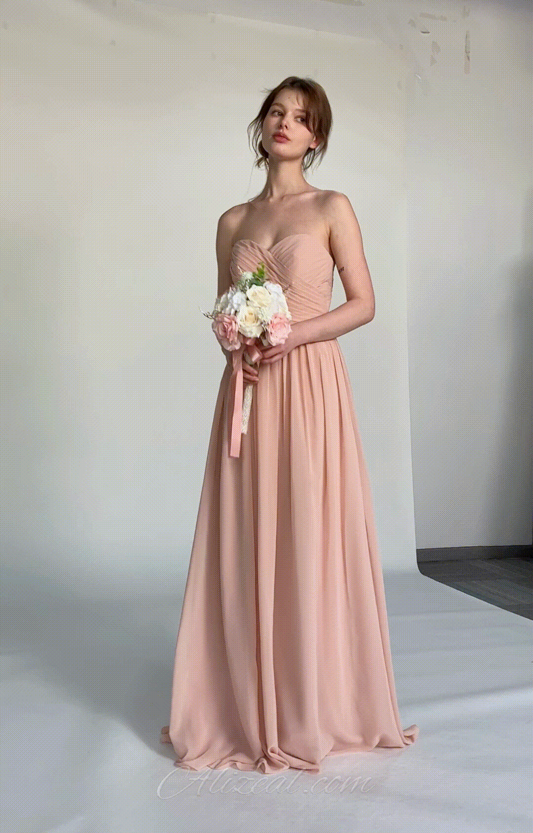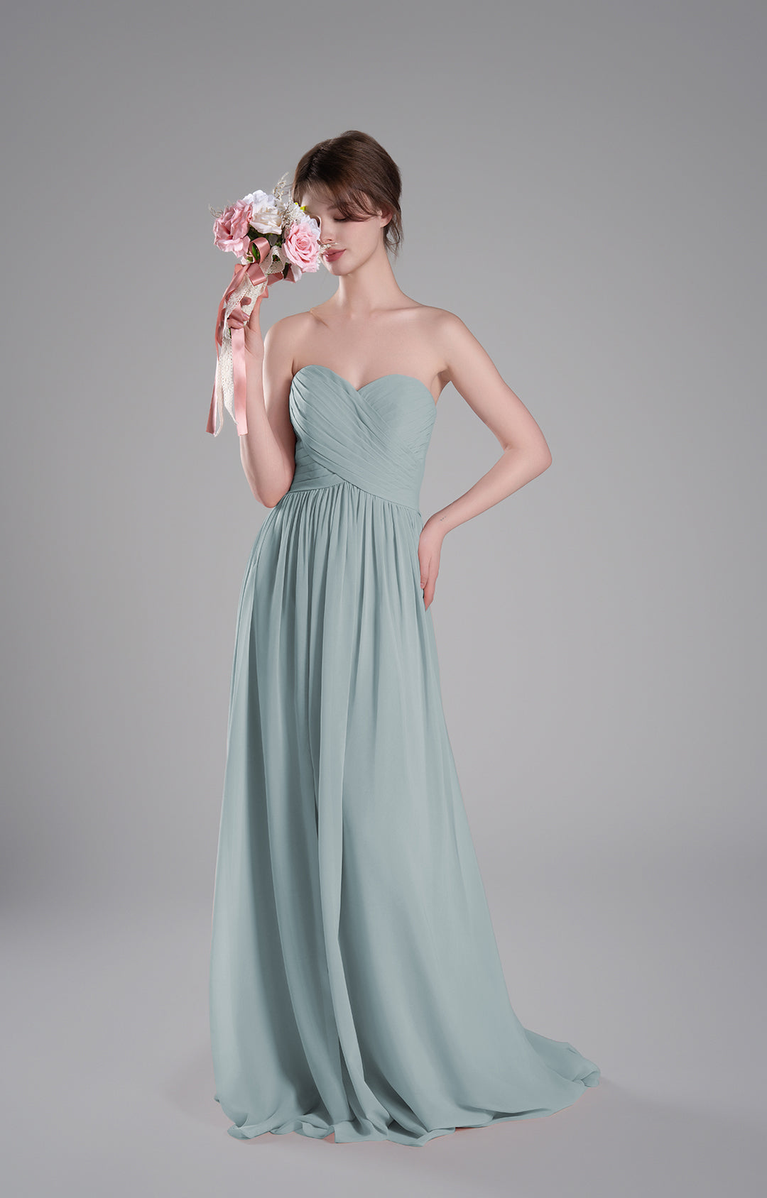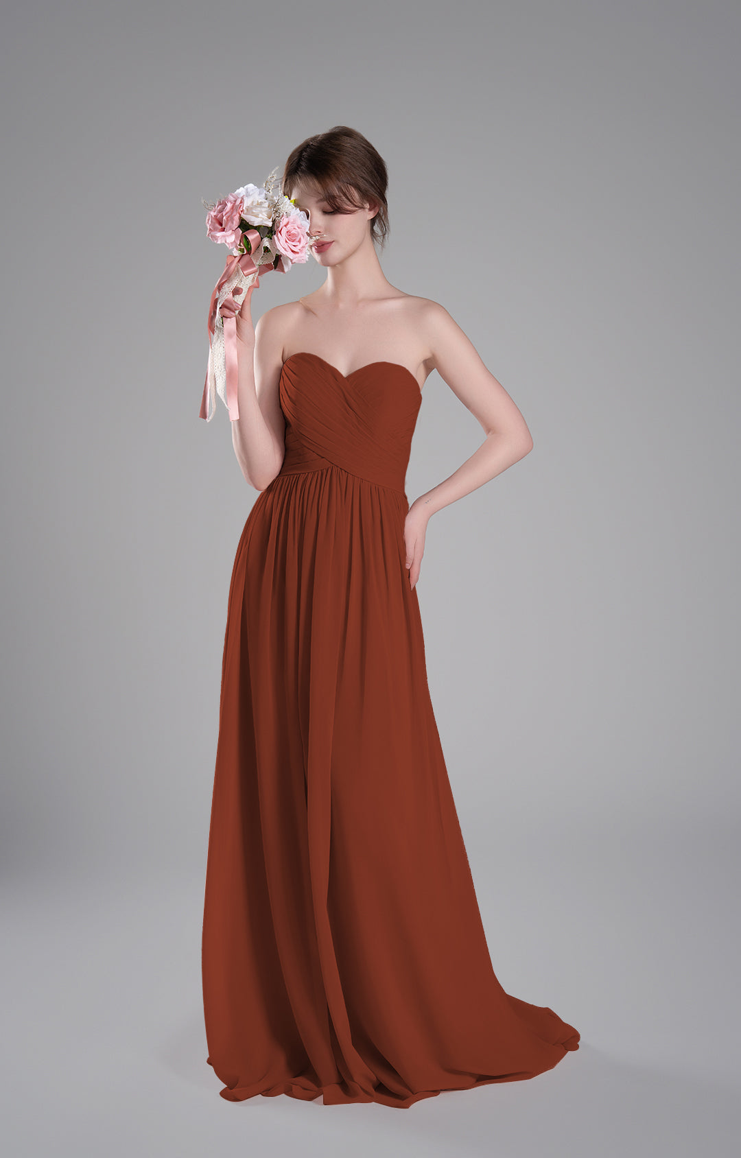 Made from luxurious chiffon fabric, this gown is lightweight, airy, and elegantly drapes to create a flowing and graceful silhouette. The soft texture ensures all-day comfort, making it ideal for formal occasions.