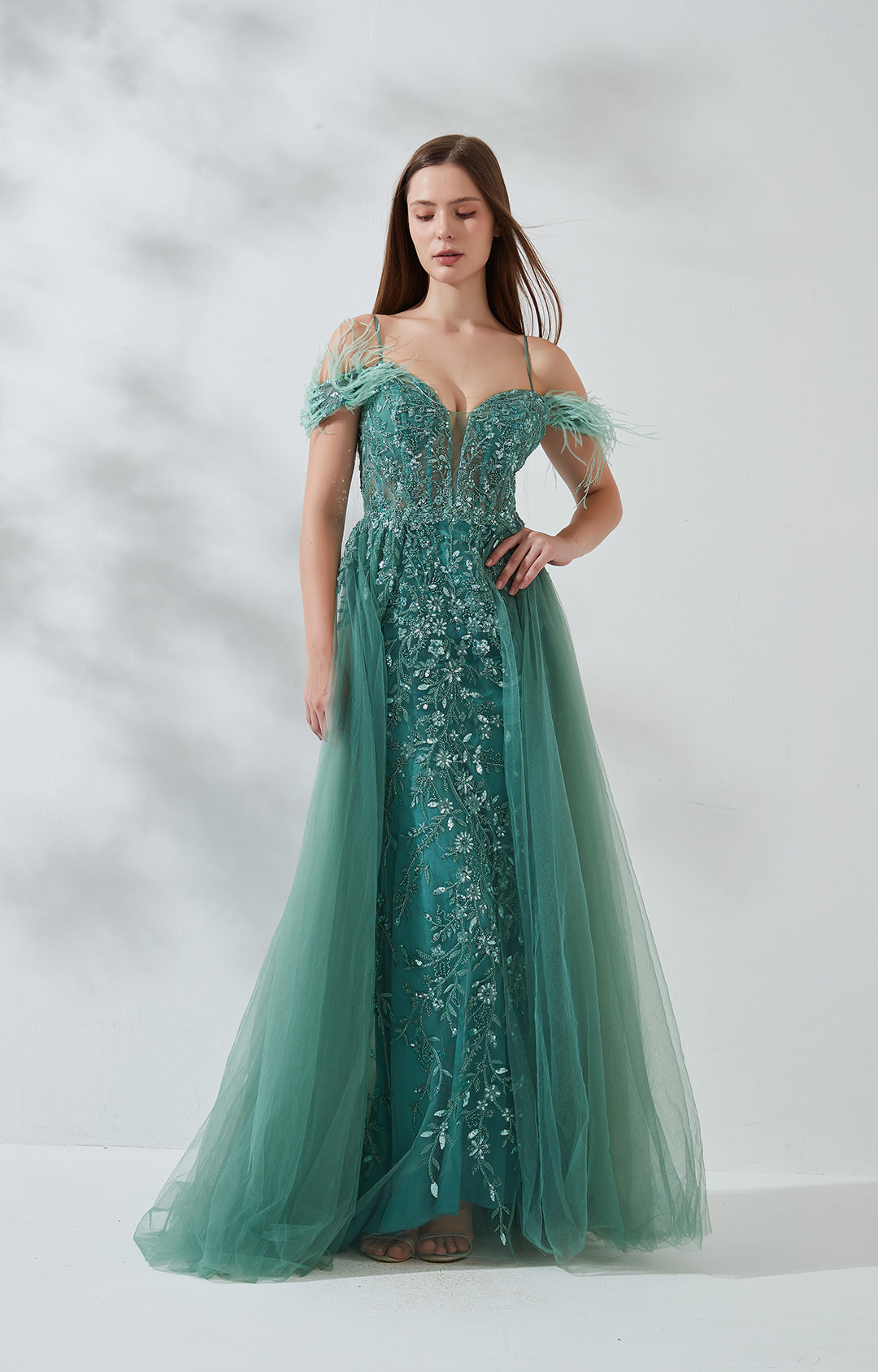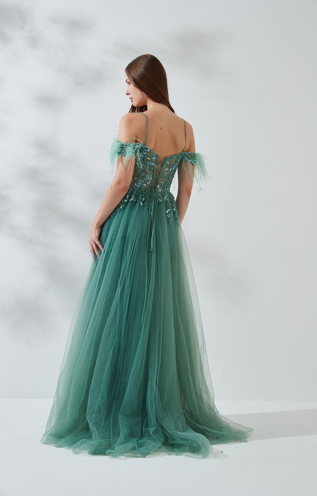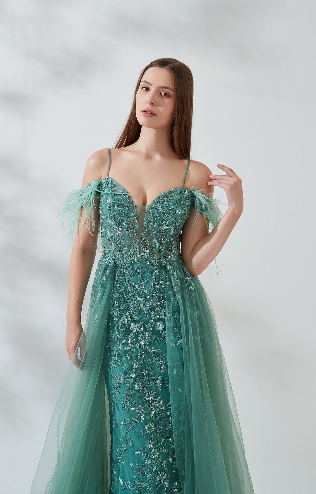 V-Neck Feather Drop Shoulder Sleeve Straps Appliquéd Mesh Dress