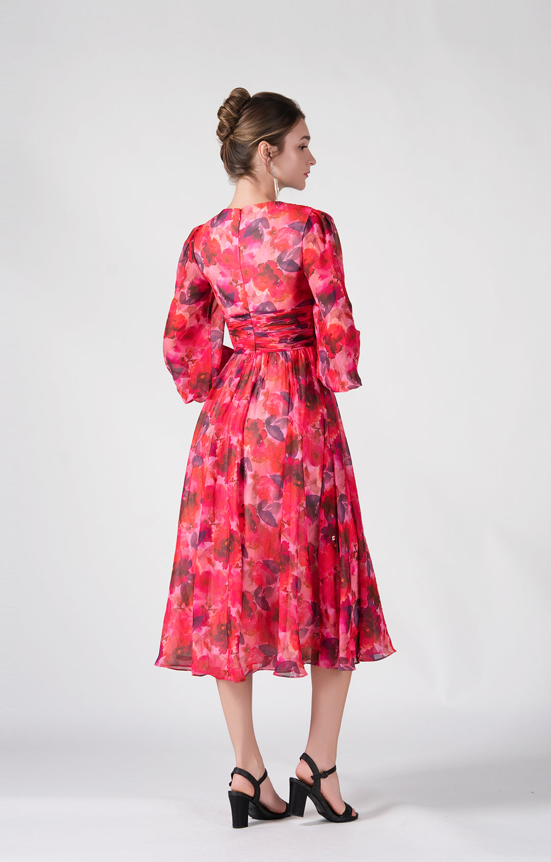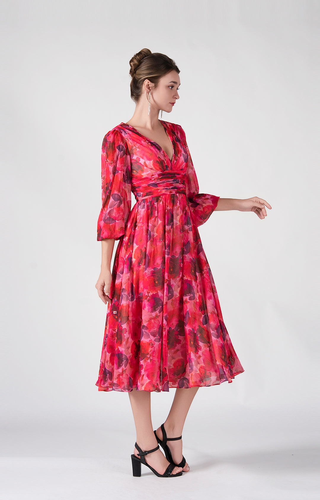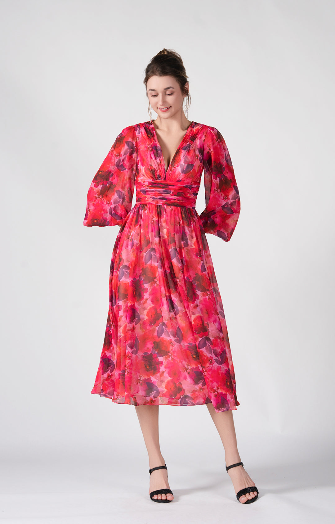 V-Neck Long Puff Sleeves A-Line Pleats Midi Dress