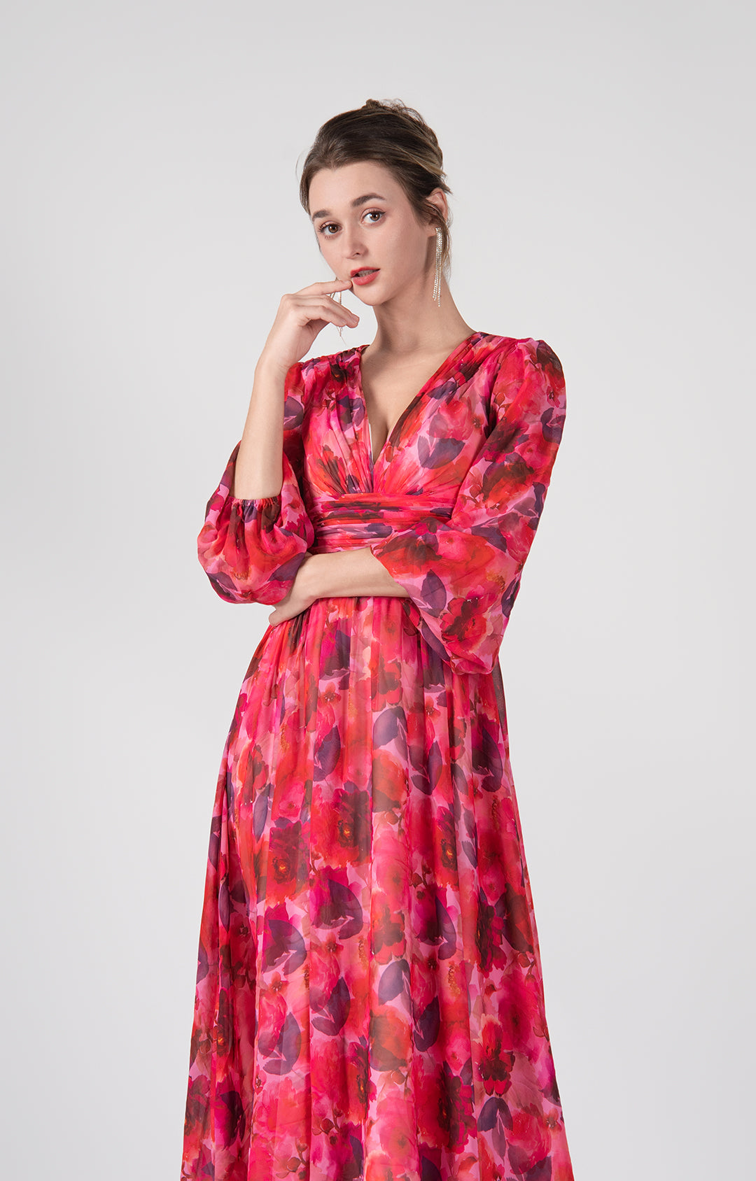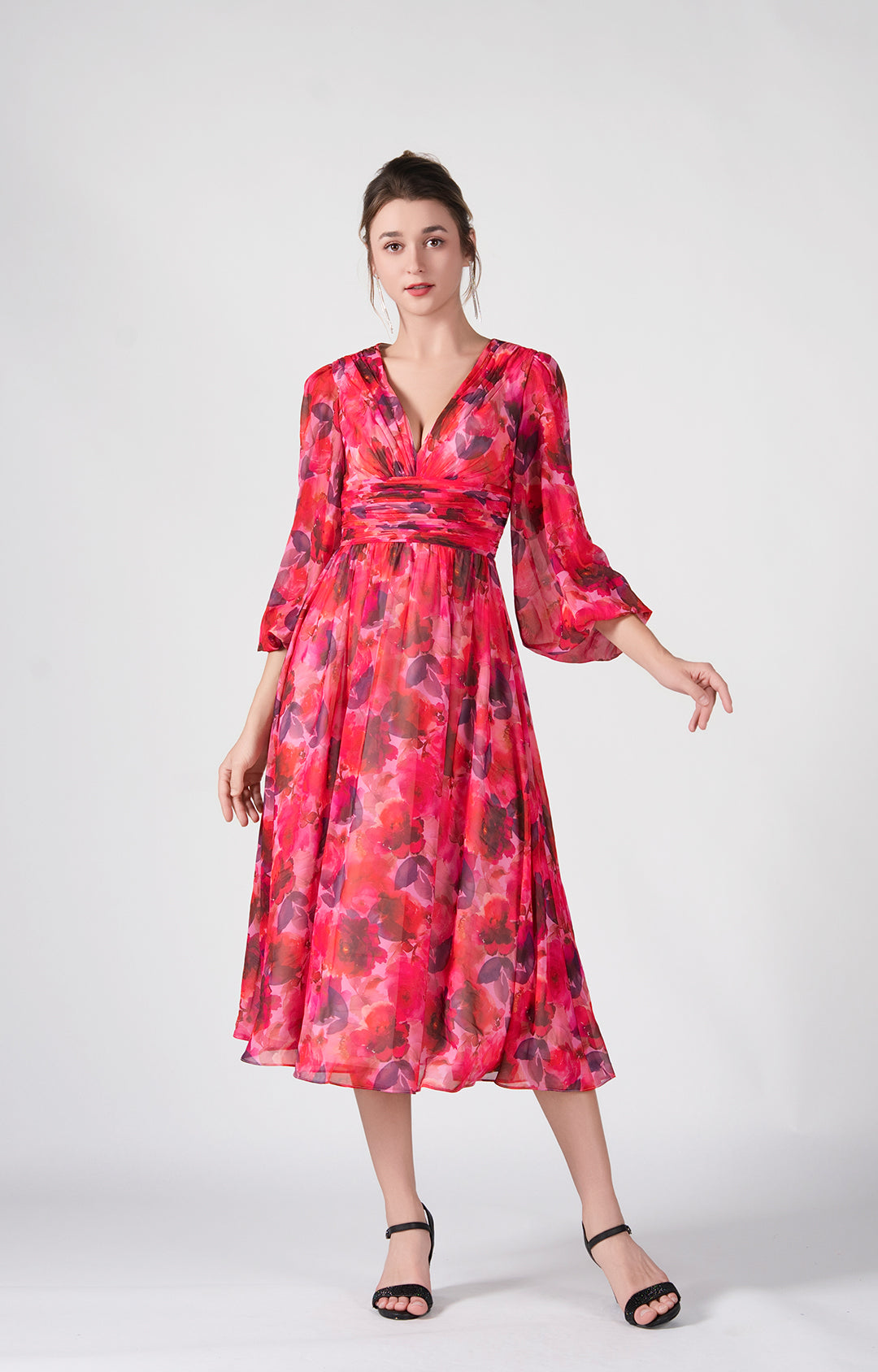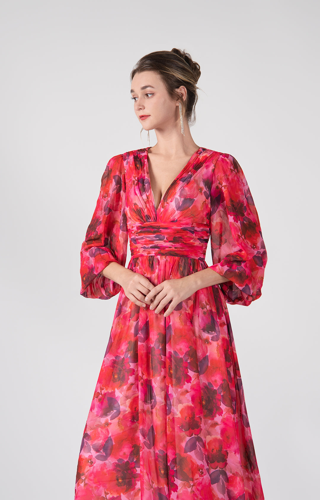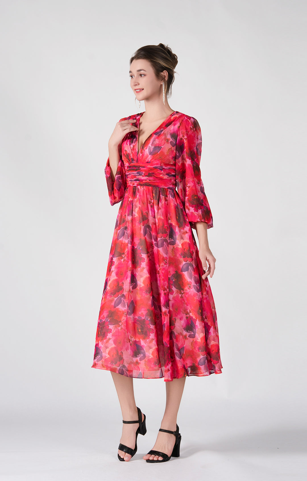 V-Neck Long Puff Sleeves A-Line Pleats Midi Dress