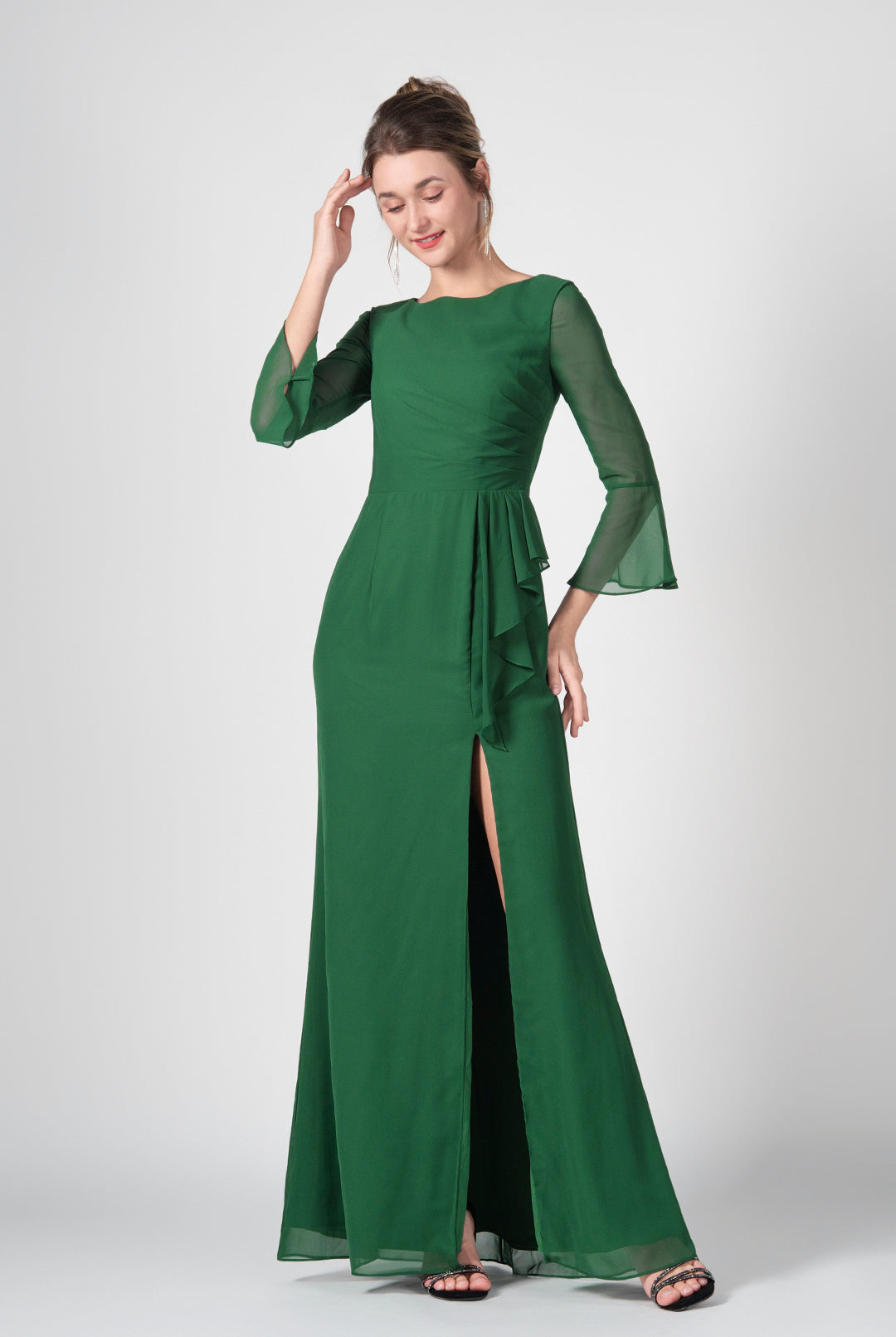Bateau Neck Sheer Sleeve Split Maxi Dresses