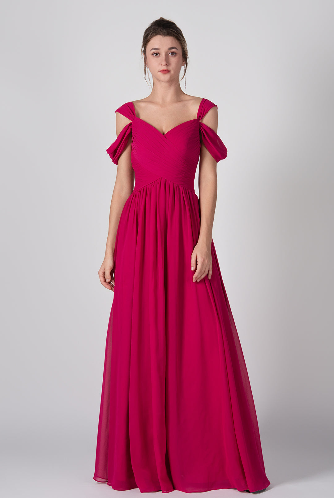 One Shoulder Off Shoulder Sleeve Ruched Bodice A-Line Maxi Dress