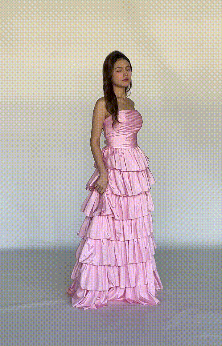 This radiant satin gown is perfect for formal galas, prom nights, bridesmaid ensembles, or any special occasion where a blend of classic charm and standout style is desired. Its sculptural volume and soft pink hue offer timeless femininity with a modern twist.