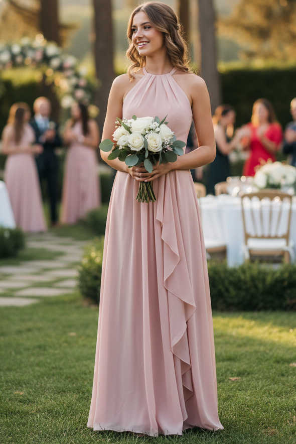 This chiffon gown is perfect for bridesmaids, weddings, evening parties, proms, garden events, and other formal celebrations. The effortless elegance and timeless charm make it a stunning choice for any special occasion.