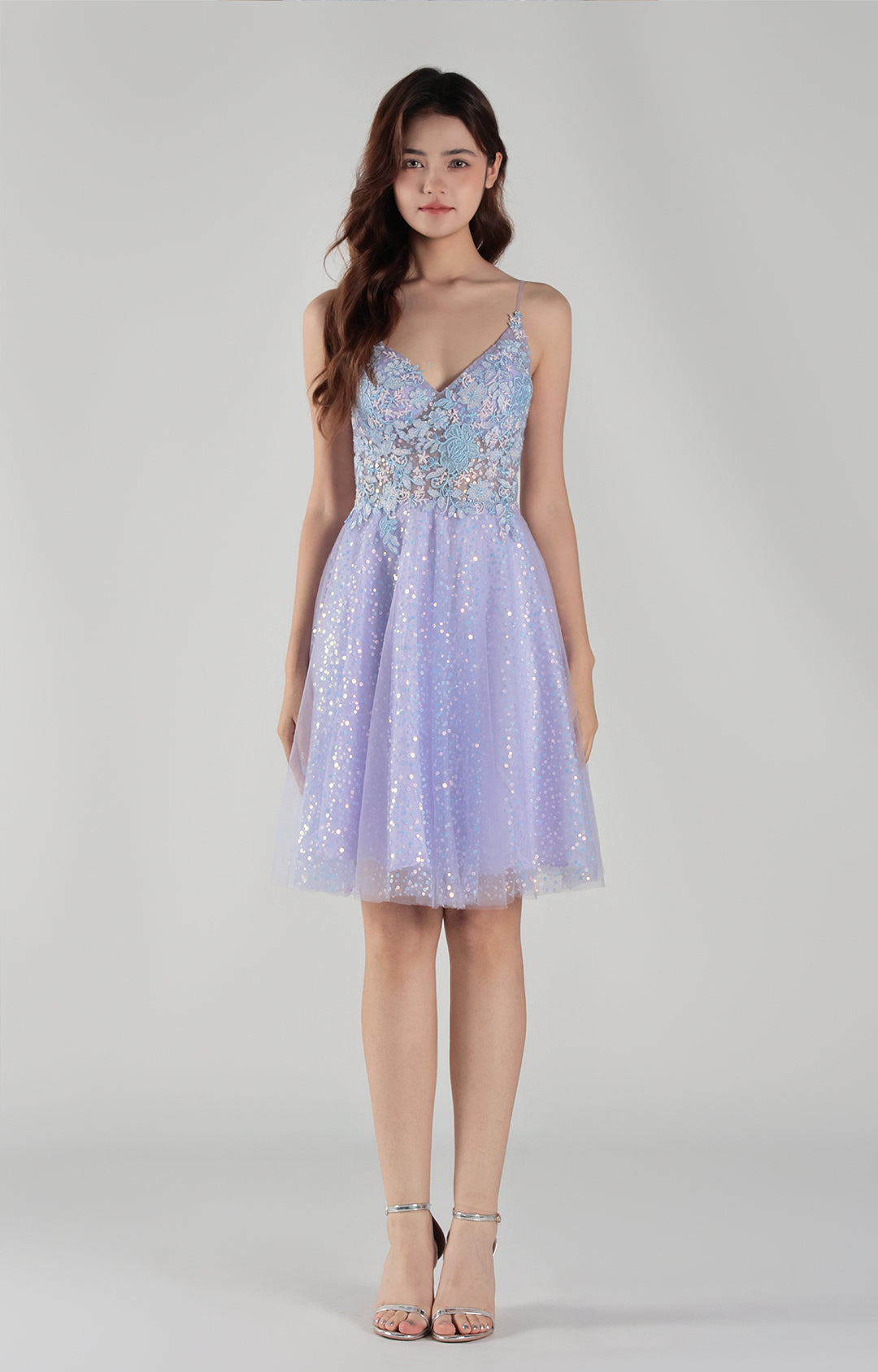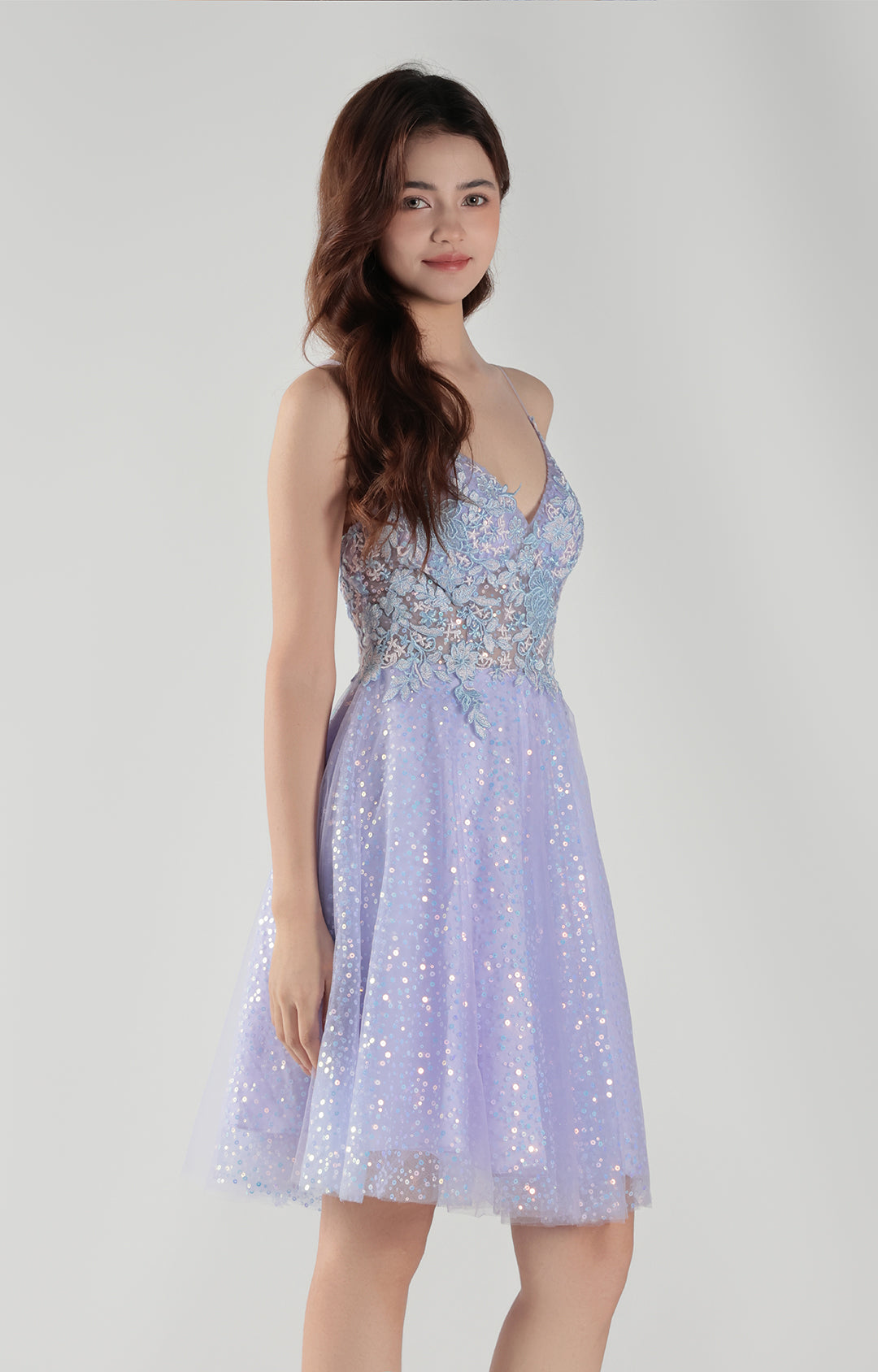 A-Line V-Neck Spaghetti Straps Appliqued Glitter Mini Dress