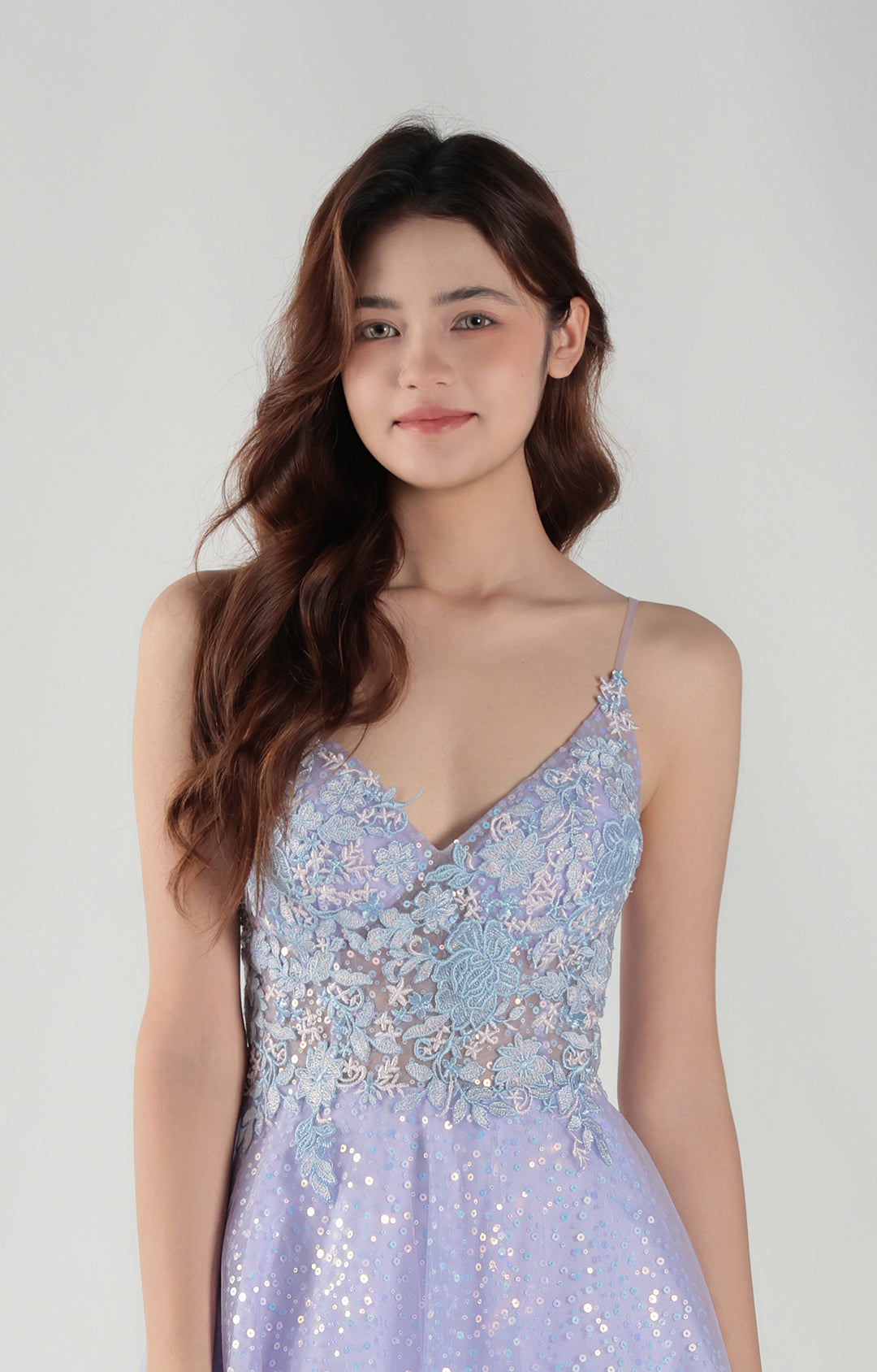 Crafted from delicate tulle, this dress offers a lightweight and ethereal feel, perfect for any formal or festive occasion.