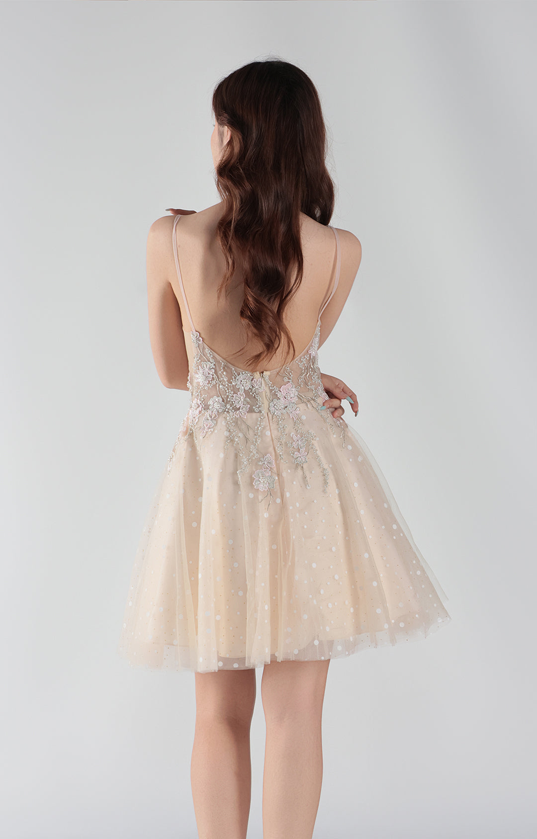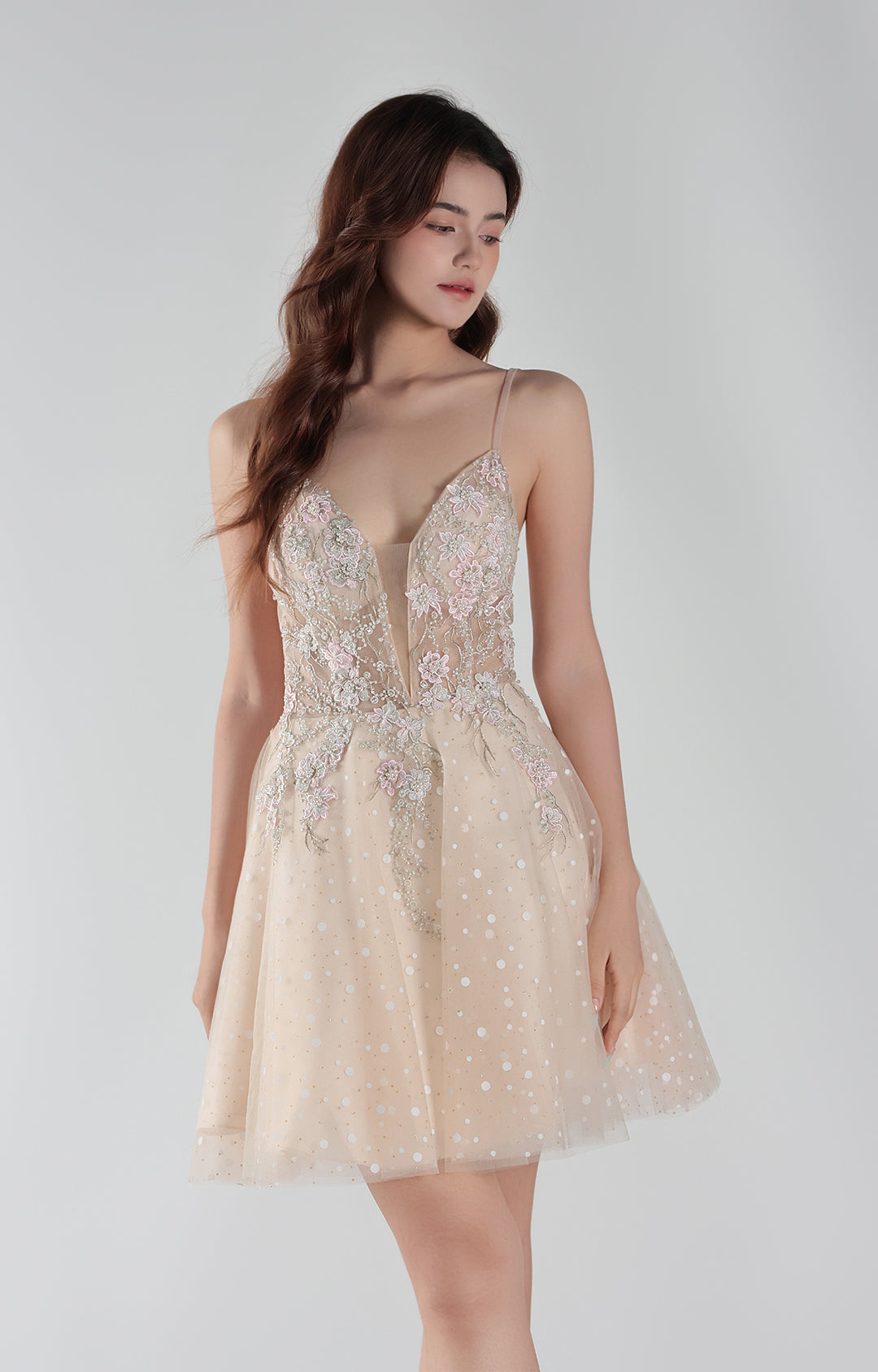 Deep V-Neck Spaghetti Straps Floral Tulle Mini Dress