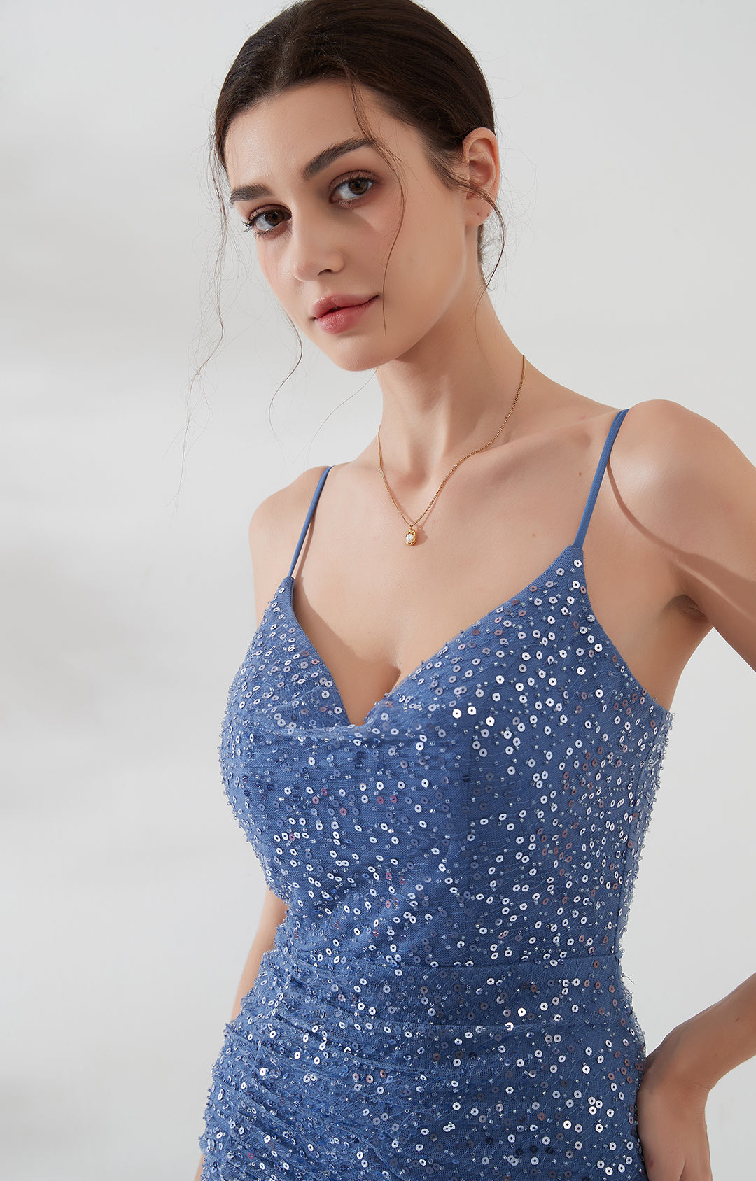 Sequin Ruched V-neck Spaghetti Straps Split Short Dress