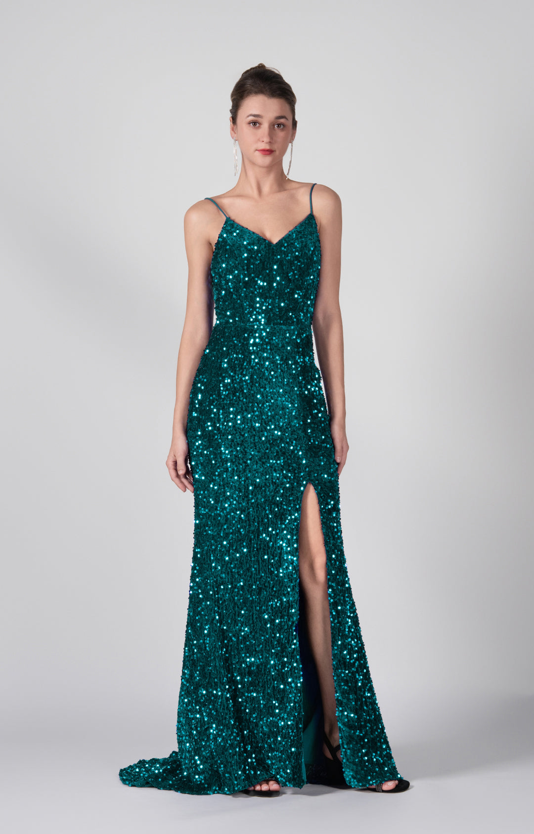 Spaghetti Straps Sequin High Slit Backless Dresses