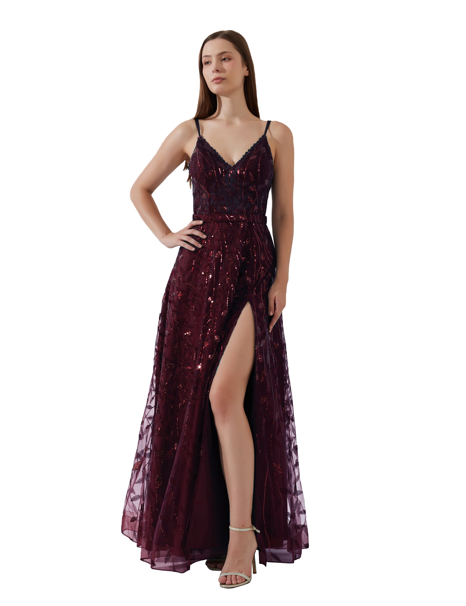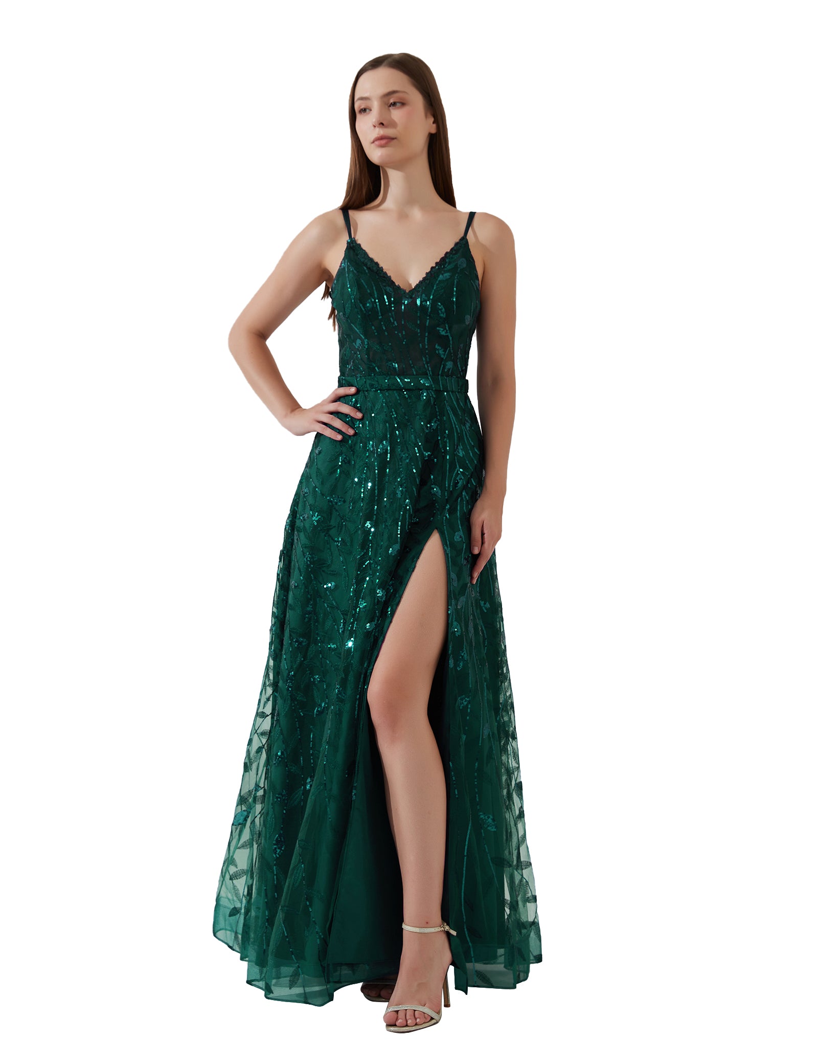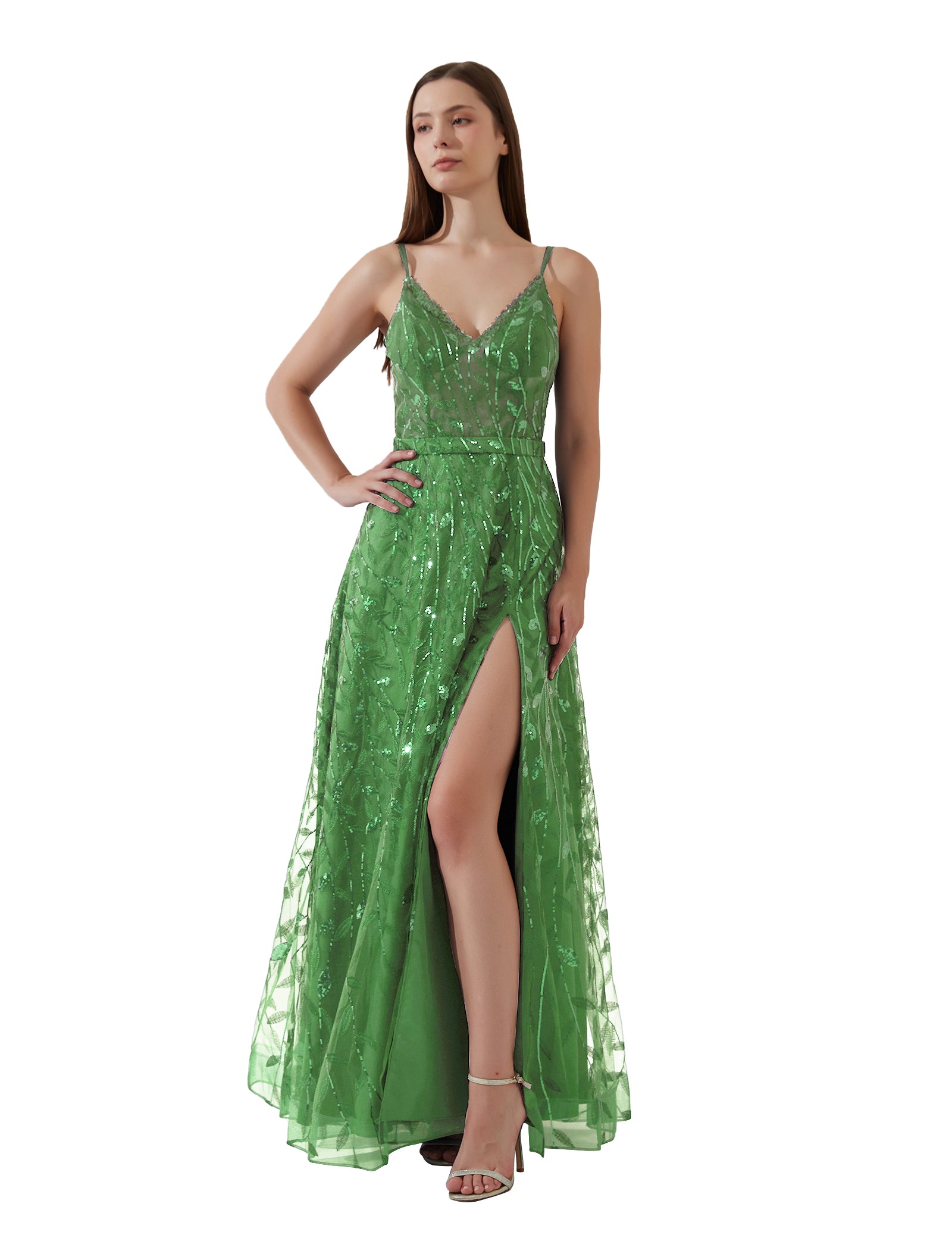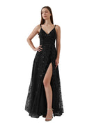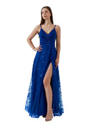 Double Spaghetti Straps V-neck Belt High Side Split Mesh Prom Dress